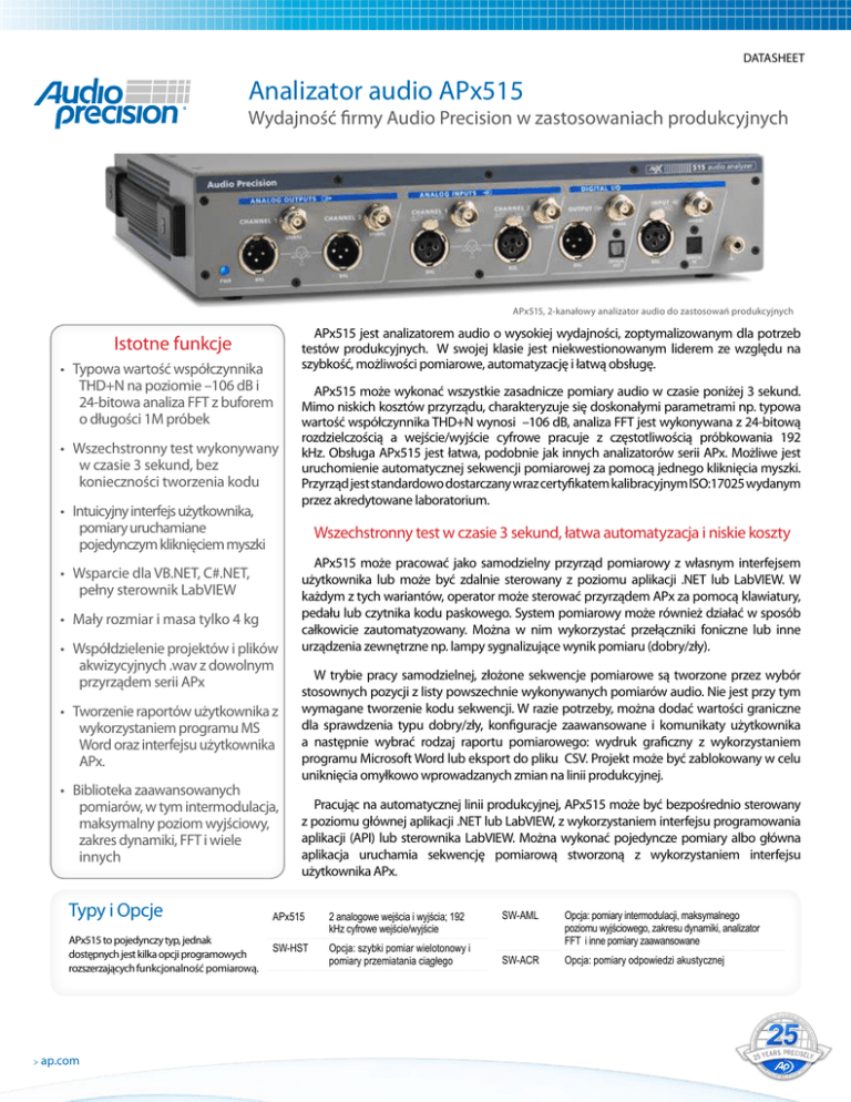 DATASHEET Analizator audio APx515 Wydajność firmy Audio Precision w zastosowaniach produkcyjnych APx515, 2-kanałowy analizator audio do zastosowań produkcyjnych Istotne funkcje • Typowa wartość współczynnika THD+N na poziomie –106 dB i 24-bitowa analiza FFT z buforem o długości 1M próbek • Wszechstronny test wykonywany w czasie 3 sekund, bez konieczności tworzenia kodu • Intuicyjny interfejs użytkownika, pomiary uruchamiane pojedynczym kliknięciem myszki • Mały rozmiar i masa tylko 4 kg • Współdzielenie projektów i plików akwizycyjnych .wav z dowolnym przyrządem serii APx • Tworzenie raportów użytkownika z wykorzystaniem programu MS Word oraz interfejsu użytkownika APx. • Biblioteka zaawansowanych pomiarów, w tym intermodulacja, maksymalny poziom wyjściowy, zakres dynamiki, FFT i wiele innych APx515 to pojedynczy typ, jednak dostępnych jest kilka opcji programowych rozszerzających funkcjonalność pomiarową. > ap.com APx515 może wykonać wszystkie zasadnicze pomiary audio w czasie poniżej 3 sekund. Mimo niskich kosztów przyrządu, charakteryzuje się doskonałymi parametrami np. typowa wartość współczynnika THD+N wynosi –106 dB, analiza FFT jest wykonywana z 24-bitową rozdzielczością a wejście/wyjście cyfrowe pracuje z częstotliwością próbkowania 192 kHz. Obsługa APx515 jest łatwa, podobnie jak innych analizatorów serii APx. Możliwe jest uruchomienie automatycznej sekwencji pomiarowej za pomocą jednego kliknięcia myszki. Przyrząd jest standardowo dostarczany wraz certyfikatem kalibracyjnym ISO:17025 wydanym przez akredytowane laboratorium. Wszechstronny test w czasie 3 sekund, łatwa automatyzacja i niskie koszty • Wsparcie dla VB.NET, C#.NET, pełny sterownik LabVIEW Typy i Opcje APx515 jest analizatorem audio o wysokiej wydajności, zoptymalizowanym dla potrzeb testów produkcyjnych. W swojej klasie jest niekwestionowanym liderem ze względu na szybkość, możliwości pomiarowe, automatyzację i łatwą obsługę. APx515 może pracować jako samodzielny przyrząd pomiarowy z własnym interfejsem użytkownika lub może być zdalnie sterowany z poziomu aplikacji .NET lub LabVIEW. W każdym z tych wariantów, operator może sterować przyrządem APx za pomocą klawiatury, pedału lub czytnika kodu paskowego. System pomiarowy może również działać w sposób całkowicie zautomatyzowany. Można w nim wykorzystać przełączniki foniczne lub inne urządzenia zewnętrzne np. lampy sygnalizujące wynik pomiaru (dobry/zły). W trybie pracy samodzielnej, złożone sekwencje pomiarowe są tworzone przez wybór stosownych pozycji z listy powszechnie wykonywanych pomiarów audio. Nie jest przy tym wymagane tworzenie kodu sekwencji. W razie potrzeby, można dodać wartości graniczne dla sprawdzenia typu dobry/zły, konfiguracje zaawansowane i komunikaty użytkownika a następnie wybrać rodzaj raportu pomiarowego: wydruk graficzny z wykorzystaniem programu Microsoft Word lub eksport do pliku CSV. Projekt może być zablokowany w celu uniknięcia omyłkowo wprowadzanych zmian na linii produkcyjnej. Pracując na automatycznej linii produkcyjnej, APx515 może być bezpośrednio sterowany z poziomu głównej aplikacji .NET lub LabVIEW, z wykorzystaniem interfejsu programowania aplikacji (API) lub sterownika LabVIEW. Można wykonać pojedyncze pomiary albo główna aplikacja uruchamia sekwencję pomiarową stworzoną z wykorzystaniem interfejsu użytkownika APx. APx515 2 analogowe wejścia i wyjścia; 192 kHz cyfrowe wejście/wyjście SW-HST Opcja: szybki pomiar wielotonowy i pomiary przemiatania ciągłego SW-AML Opcja: pomiary intermodulacji, maksymalnego poziomu wyjściowego, zakresu dynamiki, analizator FFT i inne pomiary zaawansowane SW-ACR Opcja: pomiary odpowiedzi akustycznej Wiarygodne wyniki pomiarowe dla sprzedawców, projektantów i producentów Tysiące inżynierów na całym świecie ufa przyrządom Audio Precision. Dlatego współpraca z firmą zewnętrzną może bazować na dokładności i wiarygodności sprzętu pomiarowego. Wszystkie analizatory APx wykorzystują to samo oprogramowanie. Stąd nastawy testowe i wyniki pomiarów mogą być łatwo współdzielone między sprzedawcami, działami badawczorozwojowymi i produkcyjnymi na całym świecie. Na przykład, sekwencja pomiarowa stworzona przy pomocy APx525 może być przesłana pocztą elektroniczną do producenta wyrobu posiadającego analizator APx515. Na linii produkcyjnej, operator może zapisać aktualne parametry wyrobu i przesłać je pocztą elektroniczną z powrotem do działu badawczego, w celu ich dalszej analizy. SZYBKI I INTUICYJNY INTERFEJS UŻYTKOWNIKA Inżynier pomiarowy może dodać do sekwencji pomiarowej interakcję pedału sterującego, bez konieczności wprowadzania dodatkowego kodu. NAJLEPSZY W SWOJEJ KLASIE ZE WZGLĘDU NA SZYBKOŚĆ Wyniki pomiarowe APx515 z linii produkcyjnej. Zwróć uwagę na całkowity czas testu i przerwy pomiędzy kolejnymi testami. Zawsze najlepsze w swojej klasie Firma Audio Precision oferuje 14 typów przyrządów w ramach 4 rodzin. Tym samym posiada najszerszą ofertę analizatorów, spełniających wszelkie wymagania stawiane przez producentów profesjonalnych i powszechnie stosowanych urządzeń audio Każdy przedstawiony poniżej analizator jest najlepszy w swojej klasie, zarówno ze względu na wydajność jak i funkcjonalność. JEDYNY NA ŚWIECIE PRZYRZĄD Z 24-BITOWYM ANALIZATOREM FFT, Z BUFOREM 1M PRÓBEK APx525 oferuje bezprecedensową analizę szumów znajdujących się poza pasmem akustycznym oraz pomiary współczynnika CMRR. Charakteryzuje się bardzo niskim poziomem szumów własnych i jest idealny do pomiarów wzmacniaczy mocy klasy D. PARAMETRY ANALIZATORA Własny współczynnik THD+N (pasmo 20 kHz) Maksymalna wartość napięcia wejściowego –102 dB + 1.4 µV Typowol <–106 dB (1 kHz, 2.0 V) Wybrane parametry analizatora APx515 NAJNIŻSZY WSPÓŁCZYNNIK ZNIEKSZTAŁCEŃ THD+N NA ŚWIECIE Seria