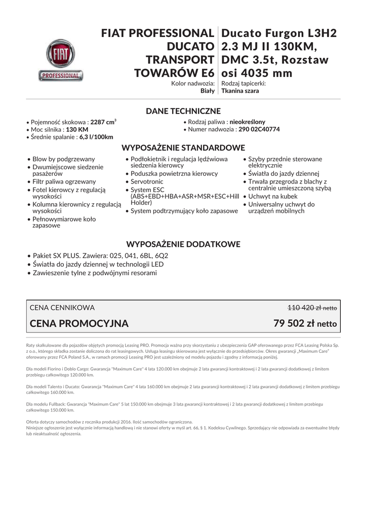 FIAT PROFESSIONAL DUCATO TRANSPORT TOWARÓW E6 Kolor nadwozia: Biały Ducato Furgon L3H2 2.3 MJ II 130KM, DMC 3.5t, Rozstaw osi 4035 mm Rodzaj tapicerki: Tkanina szara DANE TECHNICZNE 3 • Rodzaj paliwa : nieokreślony • Numer nadwozia : 290 02C40774 • Pojemność skokowa : 2287 cm • Moc silnika : 130 KM • Średnie spalanie : 6,3 l/100km WYPOSAŻENIE STANDARDOWE • Blow by podgrzewany • Dwumiejscowe siedzenie pasażerów • Filtr paliwa ogrzewany • Fotel kierowcy z regulacją wysokości • Kolumna kierownicy z regulacją wysokości • Pełnowymiarowe koło zapasowe • Podłokietnik i regulacja lędźwiowa siedzenia kierowcy • Poduszka powietrzna kierowcy • Servotronic • System ESC (ABS+EBD+HBA+ASR+MSR+ESC+Hill Holder) • System podtrzymujący koło zapasowe • Szyby przednie sterowane elektrycznie • Światła do jazdy dziennej • Trwała przegroda z blachy z centralnie umieszczoną szybą • Uchwyt na kubek • Uniwersalny uchwyt do urządzeń mobilnych WYPOSAŻENIE DODATKOWE • Pakiet SX PLUS. Zawiera: 025, 041, 6BL, 6Q2 • Światła do jazdy dziennej w technologii LED • Zawieszenie tylne z podwójnymi resorami CENA CENNIKOWA CENA PROMOCYJNA 110 420 zł netto 79 502 zł netto Raty skalkulowane dla pojazdów objętych promocją Leasing PRO. Promocja ważna przy skorzystaniu z ubezpieczenia GAP oferowanego przez FCA Leasing Polska Sp. z o.o., którego składka zostanie doliczona do rat leasingowych. Usługa leasingu skierowana jest wyłącznie do przedsiębiorców. Okres gwarancji „Maximum Care” oferowany przez FCA Poland S.A., w ramach promocji Leasing PRO jest uzależniony od modelu pojazdu i zgodny z informacją poniżej. Dla modeli Fiorino i Doblo Cargo: Gwarancja "Maximum Care" 4 lata 120.000 km obejmuje 2 lata gwarancji kontraktowej i 2 lata gwarancji dodatkowej z limitem przebiegu całkowitego 120.000 km. Dla modeli Talento i Ducato: Gwarancja "Maximum Care" 4 lata 160.000 km obejmuje 2 lata gwarancji kontraktowej i 2 lata gwarancji dodatkowej z limitem przebiegu całkowitego 160.000 km. Dla modelu Fullback: Gwarancja "Maximum Care" 5 lat 150.000 km obejmuje 3 lata gwarancji kontraktowej i 2 lata gwarancji dodatkowej z limitem przebiegu całkowitego 150.000 km. Oferta dotyczy samochodów z rocznika produkcji 2016. Ilość samochodów ograniczona. Niniejsze ogłoszenie jest wyłącznie informacją handlową i nie stanowi oferty w myśl art. 66, § 1. Kodeksu Cywilnego. Sprzedający nie odpowiada za ewentualne błędy lub nieaktualność ogłoszenia.