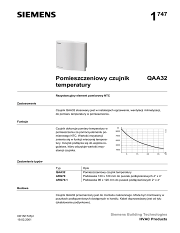 1 747 QAA32 Pomieszczeniowy czujnik temperatury Rezystancyjny element pomiarowy NTC Zastosowanie Czujnik QAA32 stosowany jest w instalacjach ogrzewania, wentylacji i klimatyzacji, do pomiaru temperatury w pomieszczeniu. Funkcje Ω 1747D01 Czujnik dokonuje pomiary temperatury w pomieszczeniu za pomocą elementu pomiarowego NTC. Wartość rezystancji zmienia się w funkcji mierzonej temperatury. Czujnik podłącza się do wejścia regulatora, który odczytuje wartość rezystancji czujnika. 9000 7000 5000 3000 1000 5 15 25 35 °C Zestawienie typów Typ Opis QAA32 ARG70 ARG70.1 Pomieszczeniowy czujnik temperatury Podstawka 120 x 120 mm do puszek podłączeniowych 4“ x 4“ Podstawka 96 x 120 mm do puszek podłączeniowych 2“ x 4“ Budowa Czujnik QAA32 przeznaczony jest do montażu naściennego. Może być montowany w puszkach podłączeniowych dostępnych w handlu. Kabel doprowadzany jest od tyłu (okablowanie podtynkowe). CE1N1747pl 19.02.2001 Siemens Building Technologies HVAC Products Wskazówki do instalacji Lokalizacja Na płaskiej, wewnętrznej ścianie w ogrzewanym bądź klimatyzowanym pomieszczeniu. Czujnika nie można montować we wnękach, półkach, za zasłonami, naprzeciw lub w pobliżu źródeł ciepła. Czujnik nie może być wystawiony na działanie bezpośredniego promieniowania słonecznego. Uwagi • Podczas montażu najpierw zamontować podstawkę, następnie zawiesić obudowę i wykonać podłączenia elektryczne. Na końcu zamocować pokrywę. • Koniec kanału kablowego przy czujniku musi być uszczelniony, aby zapobiec błędom pomiaru na skutek przepływu powietrza z kanału kablowego. • Należy przestrzegać dopuszczalnych warunków środowiskowych. • Instrukcja montażu wydrukowana jest na opakowaniu. Dane techniczne Dane ogólne Przyłącza Warunki środowiskowe Wymagania Inne 0 ...40 °C rezystor NTC, 3 kΩ przy 25 °C ± 0,3 K około 6 min 2 x 1,5 mm2 lub 1 x 2,5 mm2 wg IEC 721-3-3 klasa 3K5 0...50 °C < 85 % r. h. normalny, wg EN 60730 wg IEC 721-3-2 klasa 2K3 -25...+65 °C < 95 % r. h. klasa 2M2 II wg EN 60 730 IP30 wg EN 60 529 wg EMC dyrektywa 89 / 336 / EEC około 0,1 kg biały, NCS S 0502-G (RAL 9003) Zakres pomiaru Element pomiarowy Tolerancja pomiary przy 25 °C Stała czasowa (z przepływem powietrza) Zaciski do przewodów Praca Warunki klimatyczne Temperatura Wilgotność Poziom zakłóceń Transport Warunki klimatyczne Temperatura Wilgotność Warunki mechaniczne Klasa bezpieczeństwa Stopień ochrony Zgodność CE Waga Kolor Schemat wewnętrzny B1 1747G01 NTC M Wymiary 86 Czujnik i podstawa 30 30 28 28 36 3,6 28 28 3001M02 96,4 86 99,6 30 3001M01 30 Wymiary w mm 2/2 2000 Siemens Building Technologies Siemens Building Technologies HVAC Products Pomieszczeniowy czujnik temperatury QAA32 CE1N1747pl 19.02.2001