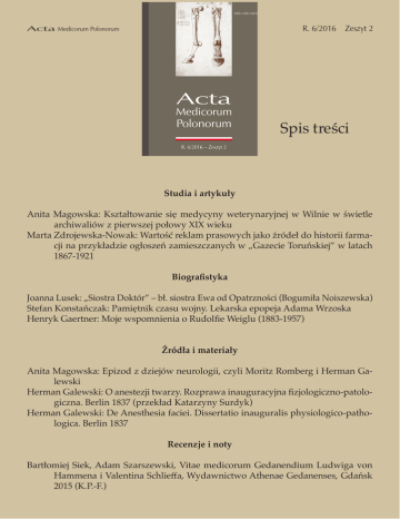 Acta Medicorum Polonorum R. 6/2016 Zeszyt 2 Spis treści Studia i artykuły Anita Magowska: Kształtowanie się medycyny weterynaryjnej w Wilnie w świetle archiwaliów z pierwszej połowy XIX wieku Marta Zdrojewska-Nowak: Wartość reklam prasowych jako źródeł do historii farmacji na przykładzie ogłoszeń zamieszczanych w „Gazecie Toruńskiej” w latach 1867-1921 Biografistyka Joanna Lusek: „Siostra Doktór” – bł. siostra Ewa od Opatrzności (Bogumiła Noiszewska) Stefan Konstańczak: Pamiętnik czasu wojny. Lekarska epopeja Adama Wrzoska Henryk Gaertner: Moje wspomnienia o Rudolfie Weiglu (1883-1957) Źródła i materiały Anita Magowska: Epizod z dziejów neurologii, czyli Moritz Romberg i Herman Galewski Herman Galewski: O anestezji twarzy. Rozprawa inauguracyjna fizjologiczno-patologiczna. Berlin 1837 (przekład Katarzyny Surdyk) Herman Galewski: De Anesthesia faciei. Dissertatio inauguralis physiologico-pathologica. Berlin 1837 Recenzje i noty Bartłomiej Siek, Adam Szarszewski, Vitae medicorum Gedanendium Ludwiga von Hammena i Valentina Schlieffa, Wydawnictwo Athenae Gedanenses, Gdańsk 2015 (K.P.-F.) Marian Łysiak, Doktor medycyny i filozofii Georg Seger (1629-1678). Szkice i materiały do biografii, Wydawnictwo Towarzystwa Naukowego w Toruniu, Wydawnictwo Muzeum Okręgowego w Toruniu, Toruń 2015 (K.P.-F.) Jakub Węglorz, Zdrowie, choroba i lecznictwo w społeczeństwie Rzeczypospolitej XVI-XVIII wieku, Wydawnictwo Adam Marszałek, Toruń 2015 (K.P.-F.) Tomasz Sioda, Historia ożywiania noworodków w Polsce. PLUS ULTRA, Poznań 2015 (A.M.) Prof. Dr Jan Władysław Piltz (1870-1930). Twórca Kliniki Neurologiczno-Psychia trycznej Uniwersytetu Jagiellońskiego w Krakowie w 100-lecie powstania. Towarzystwo Lekarskie Krakowskie (TLK), Kraków 2015 (Henryk Gaertner) Tadeusz Ceypek: Lwów w czasach trudnych. Notatki naocznego świadka Towarzystwo Miłośników Lwowa – Oddział Krakowski i Śląska Izba Lekarska Kraków-Katowice 2015, II wydanie (Henryk Gaertner) Ryszard Wójcik: Kapryśna gwiazda Rudolfa Weigla. Wydawnictwo Uniwersytetu Gdańskiego, Gdańsk 2015 (Henryk Gaertner) Arthur Allen, Fantastyczne laboratorium doktora Weigla. Lwowscy uczeni, tyfus i walka z Niemcami. Wydawnictwo Czarne, Wołowiec 2016 (Henryk Gaertner) Artur Dziak, Zagrajcież mi, niechaj cofnie się świat. Goldruk, Nowy Sącz 2015 (Henryk Gaertner) Jadwiga Wysocka, Alicja Kocińska, Rodzina Ludmiły Krakowieckiej. Rodzina Serca Miłości Ukrzyżowanej, Poznań 2016 (A.M.) Zbigniew Pawłowski, Moje dziewięćdziesiąt lat na kilkuset stronach. Wydawnictwo Kontekst, Poznań 2016 (A.M.) Wanda Kocięcka, Medycyna, nauka i czas nadchodzącej wolności. Dokument i kalendarium 1954-2000. Wydawnictwo Poznańskiego Towarzystwa Przyjaciół Nauk, Poznań 2016 (A.M.) Ryszard Chrzanowski (Cranovsky), „Natchnieni”. Bohaterowie – Mistrzowie – Muzycy. Medycyna Praktyczna, Kraków 2016 (Henryk Gaertner) Małgorzata Juda-Mieloch, Antoni Sukiennicki, Złoty jubileusz ostrowskiego szpitala 1966-2016. Republika Ostrowska, Ostrów 2016 (A.M.) Krzysztof Miklaszewski, Nowohuckie zapiski córki Eskulapa. Waldemar Hładki, Krzysztof Miklaszewski, Wieczór pamięci doc. dr med. Jadwigi Miklaszewskiej. Unia Polskich Pisarzy Lekarzy, Kraków 2016 (Henryk Gaertner) Kronika XXIV Zjazd Polskich Historyków Medycyny, Farmacji i Nauk Pokrewnych w Poz naniu (A.M.) XI Przegląd Prac Magisterskich z Zakresu Historii Farmacji w Warszawie (K.P.-F.)