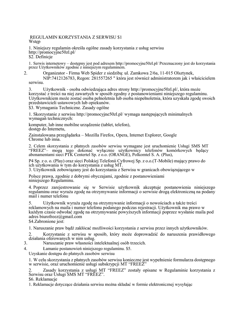 REGULAMIN KORZYSTANIA Z SERWISU $1 Wstęp 1. Niniejszy regulamin określa ogólne zasady korzystania z usług serwisu http://promocyjne50zl.pl/ $2. Definicje 1. Serwis internetowy – dostępny jest pod adresem http://promocyjne50zl.pl/ Przeznaczony jest do korzystania przez Użytkowników zgodnie z niniejszym regulaminem. 2. Organizator - Firma Web Spider z siedzibą: ul. Zamkowa 2/6a, 11-015 Olsztynek, NIP:7412126783, Regon: 281557265 " która jest również administratorem jak i właścicielem serwisu. 3. Użytkownik - osoba odwiedzająca adres strony http://promocyjne50zl.pl/, która może korzystać z treści na niej zawartych w sposób zgodny z postanowieniami niniejszego regulaminu. Użytkownikiem może zostać osoba pełnoletnia lub osoba niepełnoletnia, która uzyskała zgodę swoich przedstawicieli ustawowych lub opiekunów. $3. Wymagania Techniczne. Zasady ogólne 1. Skorzystanie z serwisu http://promocyjne50zl.pl/ wymaga następujących minimalnych wymagań technicznych: komputer, lub inne mobilne urządzenie (tablet, telefon), dostęp do Internetu, Zainstalowana przeglądarka – Mozilla Firefox, Opera, Internet Explorer, Google Chrome lub inna. 2. Celem skorzystania z płatnych zasobów serwisu wymagane jest uruchomienie Usługi SMS MT “FREEZ”– mogą tego dokonać wyłącznie użytkownicy telefonów komórkowych będący abonamentami sieci PTK Centertel Sp. z o.o. (ORANGE), Polkomtel S. A. (Plus), P4 Sp. z o. o. (Play) oraz sieci Polskiej Telefonii Cyfrowej Sp. z o.o.(T-Mobile) mający prawo do ich użytkowania w tym do korzystania z usług MT. 3. Użytkownik zobowiązany jest do korzystania z Serwisu w granicach obowiązującego w Polsce prawa, zgodnie z dobrymi obyczajami, zgodnie z postanowieniami niniejszego Regulaminu. 4. Poprzez zarejestrowanie się w Serwisie użytkownik akceptuje postanowienia niniejszego regulaminu oraz wyraża zgodę na otrzymywanie informacji o serwisie drogą elektroniczną na podany mail i numer telefonu 5. Użytkownik wyraża zgodę na otrzymywanie informacji o nowościach a także treści reklamowych na maila i numer telefonu podanego podczas rejestracji. Użytkownik ma prawo w każdym czasie odwołać zgodę na otrzymywanie powyższych informacji poprzez wysłanie maila pod adres [email protected] $4.Zabronione jest: 1. Naruszanie praw bądź zakłócać możliwości korzystania z serwisu przez innych użytkowników. 2. Korzystanie z serwisu w sposób, który może doprowadzić do naruszenia prawidłowego działania oferowanych w nim usług. 3. Naruszanie praw własności intelektualnej osób trzecich. 4. Łamanie postanowień niniejszego regulaminu. $5. Uzyskanie dostępu do płatnych zasobów serwisu 1. W celu skorzystania z płatnych zasobów serwisu konieczne jest wypełnienie formularza dostępnego w serwisie, oraz uruchomienie usługi subskrypcji MT “FREEZ” 2. Zasady korzystania z usługi MT “FREEZ” zostały opisane w Regulaminie korzystania z Serwisu oraz Usługi SMS MT “FREEZ”. $6. Reklamacje 1. Reklamacje dotyczące działania serwisu można składać w formie elektronicznej wysyłając maila na adres: [email protected]. 2. Organizator prosi aby reklamacje zawierały następujące informacje: dokładny opis, powód reklamacji, email na który ma zostać wysłana odpowiedź oraz numer telefonu użytkownika. 3. Organizator zastrzega sobie prawo udzielenia odpowiedzi na reklamację w ciągu 14 dni od daty otrzymania poprawnie złożonej reklamacji i odesłane na adres wskazany przez Użytkownika. $7. Postanowienia końcowe 1. Regulamin usługi dostępny jest na stronie http://promocyjne50zl.pl/regulamin.php 2. Całkowita odpowiedzialność właściciela strony wobec użytkownika, który nie jest konsumentem (dochodzona na podstawie jakiegokolwiek tytułu prawnego) ograniczona jest do wysokości opłat faktycznie uiszczonych przez użytkownika w związku ze skorzystaniem z Serwisu. 3. Użytkownik ma możliwość zapoznania się z Kodeksem dobrych praktyk przedsiębiorców. Kodeks dobrych praktyk znajduje się w ustawie z dnia 23 sierpnia 2007 r. o przeciwdziałaniu nieuczciwym praktykom rynkowym. Ustawa jest dostępna pod adresem http://isap.sejm.gov.pl/DetailsServlet?id=WDU20071711206 4. Administrator serwisu zastrzega sobie prawo w dowolnym czasie do zmiany niniejszego Regulaminu lub innych zasad i warunków świadczenia usług i funkcjonowania Serwisu. Informacja o zmianach będzie umieszczona na stronie internetowej Serwisu. W przypadku zmiany regulaminu Uczestnik ma prawo do rezygnacji z serwisu. 5. Sądem właściwym do rozpatrywania wszelkich sporów związanych z korzystaniem z usług dostępnych w ramach Serwisu jest sąd właściwy miejscowo dla siedziby właściciela serwisu. Postanowienie to nie dotyczy sporów, w których stroną jest konsument 6. Użytkownik będący konsumentem posiada inne możliwości skorzystania z pozasądowych sposobów rozpatrywania reklamacji i dochodzenia roszczeń: Możliwość zwrócenia się do stałego polubownego sądu konsumenckiego Możliwość zwrócenia się do do wojewódzkiego inspektora Inspekcji Handlowej z wnioskiem o wszczęcie postępowania mediacyjnego Możliwość uzyskania bezpłatnej pomocy powiatowego (miejskiego) rzecznika konsumentów lub organizacji społecznej, do której zadań statutowych należy ochrona konsumentów. 7. Zasady korzystania z serwisu i uczestnictwa w konkursie na doładowania 50zł 1. Przyjmowanie zgłoszeń do konkursu trwa od 1 stycznia 2016 roku do 31 grudnia 2016 roku. 2. Oprócz spełnienia warunku uczestnictwa, o których mowa w pkt. 1 powyżej, ponadto warunkiem wzięcia udziału w konkursie jest: a) zapoznanie się i zaakceptowanie niniejszego regulaminu przez uczestnika przed wysłaniem wierszyka o wiośnie na e-mail, który jest dostępny na stronie http://ekonkurs-iphone6.pl/ b) podanie zgodnie z prawdą następujących danych osobowych uczestnika: operatora swojej sieci komórkowej oraz numer telefonu wraz z wyrażeniem zgod