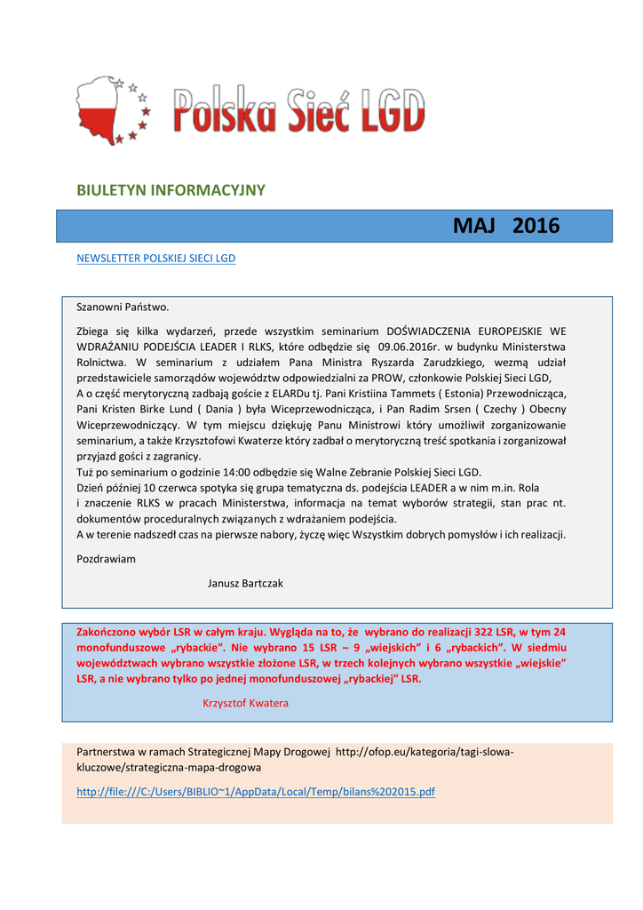 BIULETYN INFORMACYJNY MAJ 2016 NEWSLETTER POLSKIEJ SIECI LGD Szanowni Państwo. Zbiega się kilka wydarzeń, przede wszystkim seminarium DOŚWIADCZENIA EUROPEJSKIE WE WDRAŻANIU PODEJŚCIA LEADER I RLKS, które odbędzie się 09.06.2016r. w budynku Ministerstwa Rolnictwa. W seminarium z udziałem Pana Ministra Ryszarda Zarudzkiego, wezmą udział przedstawiciele samorządów województw odpowiedzialni za PROW, członkowie Polskiej Sieci LGD, A o część merytoryczną zadbają goście z ELARDu tj. Pani Kristiina Tammets ( Estonia) Przewodnicząca, Pani Kristen Birke Lund ( Dania ) była Wiceprzewodnicząca, i Pan Radim Srsen ( Czechy ) Obecny Wiceprzewodniczący. W tym miejscu dziękuję Panu Ministrowi który umożliwił zorganizowanie seminarium, a także Krzysztofowi Kwaterze który zadbał o merytoryczną treść spotkania i zorganizował przyjazd gości z zagranicy. Tuż po seminarium o godzinie 14:00 odbędzie się Walne Zebranie Polskiej Sieci LGD. Dzień później 10 czerwca spotyka się grupa tematyczna ds. podejścia LEADER a w nim m.in. Rola i znaczenie RLKS w pracach Ministerstwa, informacja na temat wyborów strategii, stan prac nt. dokumentów proceduralnych związanych z wdrażaniem podejścia. A w terenie nadszedł czas na pierwsze nabory, życzę więc Wszystkim dobrych pomysłów i ich realizacji. Pozdrawiam Janusz Bartczak Zakończono wybór LSR w całym kraju. Wygląda na to, że wybrano do realizacji 322 LSR, w tym 24 monofunduszowe „rybackie”. Nie wybrano 15 LSR – 9 „wiejskich” i 6 „rybackich”. W siedmiu województwach wybrano wszystkie złożone LSR, w trzech kolejnych wybrano wszystkie „wiejskie” LSR, a nie wybrano tylko po jednej monofunduszowej „rybackiej” LSR. Krzysztof Kwatera Partnerstwa w ramach Strategicznej Mapy Drogowej http://ofop.eu/kategoria/tagi-slowakluczowe/strategiczna-mapa-drogowa http://file:///C:/Users/BIBLIO~1/AppData/Local/Temp/bilans%202015.pdf Zapraszamy do prac w Partnerstwie Tematycznym nr 22. Poniżej, będący przedmiotem dyskusji, materiał „programowy”. http://polskasieclgd.pl/aktualnosci/partnerstwo-tematyczne-nr-22/ Zaktualizowana broszura nt. sieci informacyjnych Unii Europejskiej w Polsce http://ec.europa.eu/polska/information/index_pl.htm DOBRE PRAKTYKI RELACJA Z WARSZTATÓW KUCHNI ŁOTEWSKIEJ W dniu 21 maja 2016 r. w Muzeum Książki Kucharskiej w Chrostowej odbyły się warsztaty pn. „Kuchnia łotewska”. Warsztaty prowadziła pochodząca z Łotwy, a mieszkająca obecnie w Bodzanowie Pani Svetlana Kunc. http://dolinaraby.pl/relacja-z-warsztatow-kuchnia-lotewska/ RELACJA Z IX OGÓLNOPOLSKIEGO FORUM PEŁNOMOCNIKÓW http://nowastrategiasektora.ngo.pl/wiadomosc/1916256.html Upcoming events at European level: 1 June 2016 - RDP workshop on Measure 16 cooperation (Brussels, BE) 14 June 2016 - ENRD workshop on LEADER Cooperation (Brussels, BE) 15 June 2016 - General Assembly of ELARD (Brussels, BE) 16 June 2016 - Rural Networks Steering Group Meeting (Brussels, BE) 24 June 2016 - ENRD Seminar "Promoting Green Economy" (Brussels, BE) 5-6 September 2016 - European Conference on Rural Development (Cork, IE) 22-23 November 2016 - ELARD Leader/CLLD - post 2020 conference (Estonia) 23 November 2016 - General Assembly of ELARD (Tartu, EE) Upcoming events at National level 8-9 June 2016 - LeaderFEST JESENIKY (Czech Republic) 9 June 2016 Poland - ELARD country visit, meetings with LAGs, national network and ministry representatives 24-26 August 2016 - Estonian Rural Network: Leader TNC Fair (Jäneda, EE) 9-10 September 2016 - Festival of Slovenian LAGs, ELARD president´s presentation about LAGs cooperation at regional level (Slovenia) BAZA MAILOWA Jesteśmy w trakcie tworzenia bazy mailingowej wszystkich LGD. Nadal brakuje nam adresów z województwa: świętokrzyskiego, podlaskiego, warmińsko-mazurskiego, śląskiego, mazowieckiego, dolnośląskiego, zachodniopomorskiego, lubuskiego. Prosimy o przesłanie brakujących adresów na [email protected] Aldona Piaskowska PRZYDATNE LINKI https://ec.europa.eu/epale/pl
