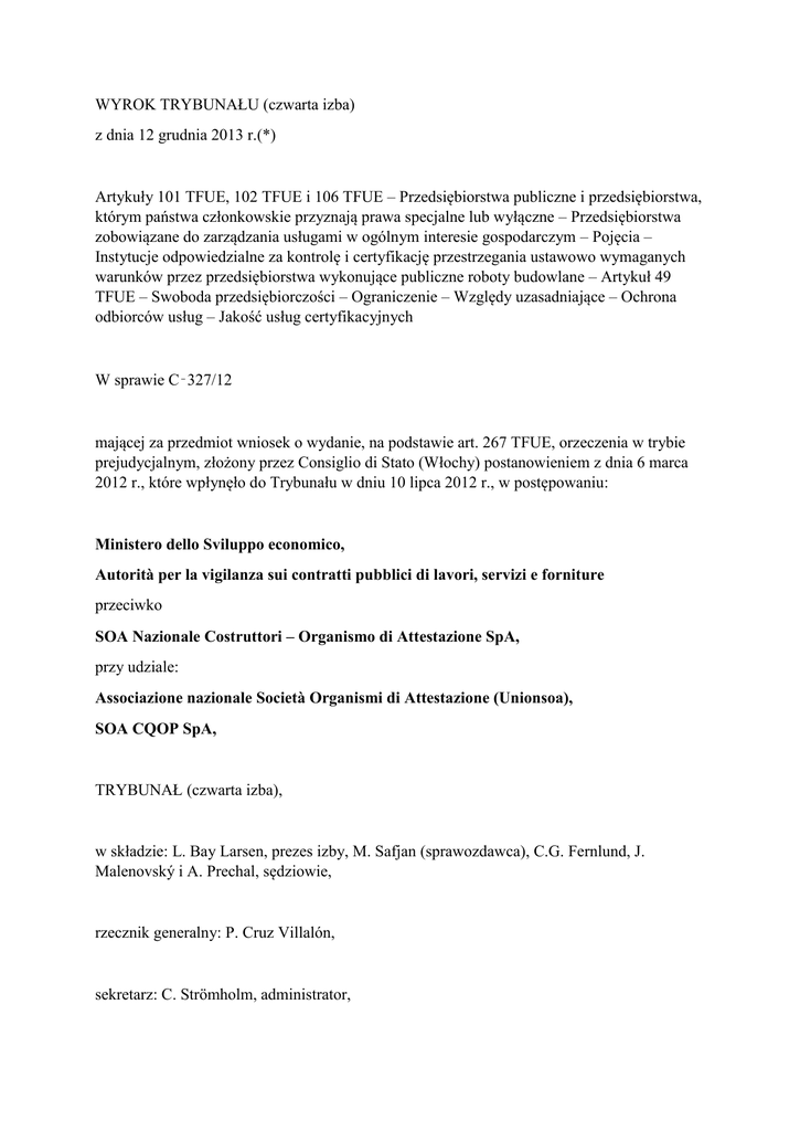 WYROK TRYBUNAŁU (czwarta izba) z dnia 12 grudnia 2013 r.(*) Artykuły 101 TFUE, 102 TFUE i 106 TFUE – Przedsiębiorstwa publiczne i przedsiębiorstwa, którym państwa członkowskie przyznają prawa specjalne lub wyłączne – Przedsiębiorstwa zobowiązane do zarządzania usługami w ogólnym interesie gospodarczym – Pojęcia – Instytucje odpowiedzialne za kontrolę i certyfikację przestrzegania ustawowo wymaganych warunków przez przedsiębiorstwa wykonujące publiczne roboty budowlane – Artykuł 49 TFUE – Swoboda przedsiębiorczości – Ograniczenie – Względy uzasadniające – Ochrona odbiorców usług – Jakość usług certyfikacyjnych W sprawie C‑327/12 mającej za przedmiot wniosek o wydanie, na podstawie art. 267 TFUE, orzeczenia w trybie prejudycjalnym, złożony przez Consiglio di Stato (Włochy) postanowieniem z dnia 6 marca 2012 r., które wpłynęło do Trybunału w dniu 10 lipca 2012 r., w postępowaniu: Ministero dello Sviluppo economico, Autorità per la vigilanza sui contratti pubblici di lavori, servizi e forniture przeciwko SOA Nazionale Costruttori – Organismo di Attestazione SpA, przy udziale: Associazione nazionale Società Organismi di Attestazione (Unionsoa), SOA CQOP SpA, TRYBUNAŁ (czwarta izba), w składzie: L. Bay Larsen, prezes izby, M. Safjan (sprawozdawca), C.G. Fernlund, J. Malenovský i A. Prechal, sędziowie, rzecznik generalny: P. Cruz Villalón, sekretarz: C. Strömholm, administrator, uwzględniając pisemny etap postępowania i po przeprowadzeniu rozprawy w dniu 16 maja 2013 r., rozważywszy uwagi przedstawione: – w imieniu SOA Nazionale Costruttori – Organismo di Attestazione SpA przez S. Cammareriego oraz M. Condinanziego, avvocati, – w imieniu Associazione nazionale Società Organismi di Attestazione (Unionsoa) przez A. Cancriniego, G.M. Di Paola oraz A. Clarizię, avvocati, – w imieniu SOA CQOP SpA przez C. De Portu, avvocato, – w imieniu rządu włoskiego przez G. Palmieri, działającą w charakterze pełnomocnika, wspieraną przez L. D’Ascię, avvocato dello Stato, – w imieniu Komisji Europejskiej przez L. Malferrariego, I. Rogalskiego oraz przez R. Striani, działających w charakterze pełnomocników, po zapoznaniu się z opinią rzecznika generalnego na posiedzeniu w dniu 5 września 2013 r., wydaje następujący Wyrok 1 Wniosek o wydanie orzeczenia w trybie prejudycjalnym dotyczy wykładni art. 101 TFUE, 102 TFUE i 106 TFUE. 2 Wniosek ten został złożony w ramach sporu między Ministero dello Sviluppo economico (ministerstwem rozwoju gospodarczego, zwanym dalej „Ministero”) i Autorità per la vigilanza sui contratti pubblici di lavori, servizi e forniture (urzędem ds. nadzoru nad zamówieniami na publiczne roboty budowlane, usługi i dostawy, zwanym dalej „Autorità”) a spółką SOA Nazionale Costruttori – Organismo di Attestazione SpA (zwaną dalej „SOA Nazionale Costruttori”) w przedmiocie ogłoszenia przez Ministero i Autorità, iż dokonane w ustawie uchylenie obowiązkowych stawek minimalnych stosowanych przy wykonywaniu działalności zawodowej nie ma zastosowania do usług oferowanych przez Società Organismi di Attestazione (spółki mające status instytucji certyfikacyjnych, zwane dalej „SOA”). Ramy prawne Prawo Unii 3 Artykuł 52 ust. 1 akapit pierwszy dyrektywy 2004/18/WE Parlamentu Europejskiego i Rady z dnia 31 marca 2004 r. w sprawie koordynacji procedur udzielania zamówień publicznych na roboty budowlane, dostawy i usługi (Dz.U. L 134, s. 114 – wyd. spec. w jęz. polskim, rozdz. 6, t. 7, s. 132) przewiduje: „Państwa członkowskie mogą wprowadzić urzędowe wykazy zatwierdzonych przedsiębiorców budowlanych, dostawców lub usługodawców albo ich certyfikację przez publiczne lub prywatne instytucje certyfikacyjne”. Prawo włoskie 4 Artykuł 40 decreto legislativo n. 163 del 12 aprile 2006 – Codice dei contratti pubblici relativi a lavori, servizi e forniture in attuazione delle direttive 2004/17/CE e 2004/18/CE (rozporządzenia ustawodawczego nr 163 z dnia 12 kwietnia 2006 r. – kodeks zamówień publicznych na roboty budowlane, usługi i dostawy w wykonaniu dyrektyw 2004/17/WE i 2004/18/WE, dodatek zwyczajny do GURI nr 100 z dnia 2 maja 2006 r., zwanego dalej „kodeksem”) stanowi: „1. Podmioty wykonujące publiczne roboty budowlane na jakiejkolwiek podstawie muszą mieć zezwolenie i zapewniać spełnianie w ramach ich działalności zasad jakości, profesjonalizmu i uczciwości. W tym samym celu produkty, procedury, usługi i systemy jakości w przedsiębiorstwie wykorzystywane przez te podmioty podlegają certyfikacji zgodnie z obowiązującymi przepisami. 2. Rozporządzenie [...] reguluje jednolity system zezwoleń dla wszystkich podmiotów wykonujących na jakiejkolwiek podstawie publiczne roboty budowlane o wartości przewyższającej 150 000 EUR w zależności od rodzaju i wartości robót. Rozporządzenie [...] umożliwia również okresowe przeglądy kategorii zezwoleń i ewentualne ustanawianie nowych kategorii zezwoleń. 3. Wdrażanie systemu zezwoleń zapewniają instytucje certyfikacyjne prawa prywatnego działające w tym celu z upoważnienia Autorità. Działalność certyfikacyjna jest wykonywana z poszanowaniem zasady niezależności oceny i przy zagwarantowaniu braku jakiegokolwiek interesu gospodarczego lub finansowego mogącego wywoływać stronnicze lub dyskryminacyjne zachowania. W ramach wykonywania działalności certyfikacyjnej w stosunku do podmiotów wykonujących publiczne roboty budowlane SOA pełnią zadania publicznoprawne [...]. W wypadku wydania przez nie fałszywych certyfikatów zastosowanie mają art. 476 i 479 kodeksu karnego. Przed wydaniem certyfikatów SOA sprawdzają spełnienie wszystkich warunków wymaganych od wnioskującego przedsiębiorstwa. Instytucje certyfikacyjne mają obowiązek zaświadczać, że mające zezwolenie podmioty: a) posiadają certyfikat poświadczający, że ich system jakości jest