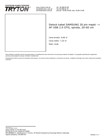 www.tryton.com.pl [email protected] [email protected] tel. 56 658 62 00 fax 56 658 62 19 pon-pt: 10.00-18.00, sob: 10.00-14.00 Delock kabel SAMSUNG 30 pin męski -> AF USB 2.0 OTG, spirala, 20-60 cm Cena brutto: 9,00 zł Cena netto: 7,32 zł Stan: brak Mimo dołożenia wszelkich starań nie gwarantujemy, że publikowane dane techniczne nie zawierają uchybień lub błędów. W przypadku jakichkolwiek wątpliwości prosimy przed podjęciem decyzji o kontakt z handlowcem. Przedstawiona oferta cenowa ma charakter informacyjny, nie stanowi oferty handlowej w rozumieniu Art.66 par.1 Kodeksu Cywilnego oraz innych właściwych przepisów prawnych. TRYTON Sp. z o.o. Szosa Lubicka 13, 87-100 Toruń NIP 956-20-37-243, REGON 871526851 KRS 0000006913, Sąd Rejonowy w Toruniu, VII Wydział Gospodarczy Krajowego Rejestru Sądowego kapitał zakładowy: 250 000 PLN Strona 1 z 1
