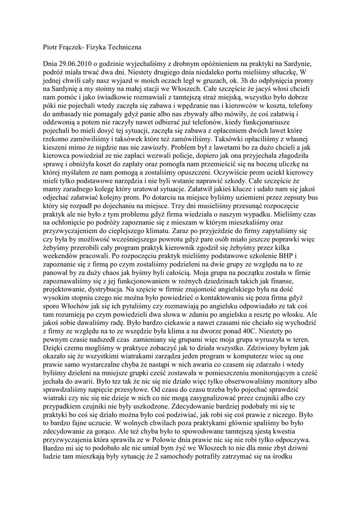 Piotr Frączek- Fizyka Techniczna Dnia 29.06.2010 o godzinie wyjechaliśmy z drobnym opóźnieniem na praktyki na Sardynie, podróż miała trwać dwa dni. Niestety drugiego dnia niedaleko portu mieliśmy stłuczkę, W jednej chwili cały nasz wyjazd w moich oczach legł w gruzach, ok. 3h do odpłynięcia promy na Sardynię a my stoimy na małej stacji we Włoszech. Całe szczęście że jacyś włosi chcieli nam pomóc i jako świadkowie rozmawiali z tamtejszą straż miejską, wszystko było dobrze póki nie pojechali wtedy zaczęła się zabawa i wpędzanie nas i kierowców w koszta, telefony do ambasady nie pomagały gdyż panie albo nas zbywały albo mówiły, że coś załatwią i oddzwonią a potem nie raczyły nawet odbierać już telefonów, kiedy funkcjonariusze pojechali bo mieli dosyć tej sytuacji, zaczęła się zabawa z opłaceniem dwóch lawet które rzekomo zamówiliśmy i taksówek które też zamówiliśmy. Taksówki opłaciliśmy z własnej kieszeni mimo że nigdzie nas nie zawiozły. Problem był z lawetami bo za dużo chcieli a jak kierowca powiedział ze nie zapłaci wezwali policje, dopiero jak ona przyjechała złagodziła sprawę i obniżyła koszt do zapłaty oraz pomogła nam przemieścić się na boczną uliczkę na której myślałem ze nam pomogą a zostaliśmy opuszczeni. Oczywiście prom uciekł kierowcy mieli tylko podstawowe narzędzia i nie byli wstanie naprawić szkody. Całe szczęście że mamy zaradnego kolegę który uratował sytuacje. Załatwił jakieś klucze i udało nam się jakoś odjechać załatwiać kolejny prom. Po dotarciu na miejsce byliśmy uziemieni przez zepsuty bus który się rozpadł po dojechaniu na miejsce. Trzy dni musieliśmy przesunąć rozpoczęcie praktyk ale nie było z tym problemu gdyż firma wiedziała o naszym wypadku. Mieliśmy czas na ochłonięcie po podróży zapoznanie się z mieszam w którym mieszkaliśmy oraz przyzwyczajeniem do cieplejszego klimatu. Zaraz po przyjeździe do firmy zapytaliśmy się czy była by możliwość wcześniejszego powrotu gdyż pare osób miało jeszcze poprawki więc żebyśmy przerobili cały program praktyk kierownik zgodził się żebyśmy przez kilka weekendów pracowali. Po rozpoczęciu praktyk mieliśmy podstawowe szkolenie BHP i zapoznanie się z firmą po czym zostaliśmy podzieleni na dwie grupy ze względu na to ze panował by za duży chaos jak byśmy byli całością. Moja grupa na początku została w firnie zapoznawaliśmy się z jej funkcjonowaniem w rożnych dziedzinach takich jak finanse, projektowanie, dystrybucja. Na szęście w firmie znajomość angielskiego była na dość wysokim stopniu czego nie można było powiedzieć o kontaktowaniu się poza firma gdyż sporo Włochów jak się ich pytaliśmy czy rozmawiają po angielsku odpowiadało ze tak coś tam rozumieją po czym powiedzieli dwa słowa w zdaniu po angielsku a resztę po włosku. Ale jakoś sobie dawaliśmy radę. Było bardzo ciekawie a nawet czasami nie chciało się wychodzić z firmy ze względu na to ze wszędzie była klima a na dworze ponad 40C. Niestety po pewnym czasie nadszedł czas zamieniany się grupami więc moja grupa wyruszyła w teren. Dzięki czemu mogliśmy w praktyce zobaczyć jak to działa wszystko. Zdziwiony byłem jak okazało się że wszystkimi wiatrakami zarządza jeden program w komputerze wiec są one prawie samo wystarczalne chyba że nastąpi w nich awaria co czasem się zdarzało i wtedy byliśmy dzieleni na mniejsze grupki cześć zostawała w pomieszczeniu monitorującym a cześć jechała do awarii. Było tez tak że nic się nie działo więc tylko obserwowaliśmy monitory albo sprawdzaliśmy napięcie przesyłowe. Od czasu do czasu trzeba było pojechać sprawdzić wiatraki czy nic się nie dzieje w nich co nie mogą zasygnalizować przez czujniki albo czy przypadkiem czujniki nie były uszkodzone. Zdecydowanie bardziej podobały mi się te praktyki bo coś się działo można było coś podziwiać, jak robi się coś prawie z niczego. Było to bardzo fajne uczucie. W wolnych chwilach poza praktykami głównie spaliśmy bo było zdecydowanie za gorąco. Ale też chyba było to spowodowane tamtejszą sjestą kwestia przyzwyczajenia która sprawiła ze w Polowie dnia prawie nic się nie robi tylko odpoczywa. Bardzo mi się to podobało ale nie umiał bym żyć we Włoszech to nie dla mnie zbyt dziwni ludzie tam mieszkają były sytuację że 2 samochody potrafiły zatrzymać się na środku skrzyżowania tylko po to żeby kierowcy sobie pogadali i nie interesowali ich inni, Kolejną dziwną rzeczą dla mnie była cieknąca rura którą włosi reperowali przez prawie miesiąc, ciekaw jestem ile wody poszło w czyszczenie ulicy dzięki temu. U nas taki wyciekł był by nie do pomyślenia zaraz przyjechała by ekipa i go naprawiła i zalała dziurę a nie pozostawiła na miesiąc żeby sobie była. W weekendy jeździliśmy po wyspie na różne wycieczki do innych miast albo po prostu zęby coś zobaczyć. Dzięki za wszystko dostępowi do Internetu z pobliskiej szkoły która nadawała niezabezpieczony sygnał byliśmy na bieżąco z tym co się dzieje w kraju albo każdy z nas mógł się skontaktować z rodziną bez problemów i ponoszonych dodatkowych kosztów. Niestety musieliśmy wrócić tydzień wcześniej gdyż kilka osób miało poprawki. Więc powrót nastąpił 22.09.2010 i tym razem podróż przebiegła bez problemów. Cały wyjazd był bardzo ciekawy i pouczający na pewno w jakimś stopniu staliśmy się bardziej zgrani lecz też nastąpił podział na mniejsze grupki wynikający z kłótni do jakich dochodziło lecz, i tak nie żałuje tego czasu spędzonego na Sardynii.