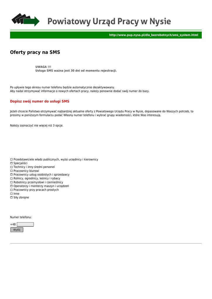 http://www.pup.nysa.pl/dla_bezrobotnych/sms_system.html Oferty pracy na SMS UWAGA !!! Usługa SMS ważna jest 30 dni od momentu rejestracji. Po upływie tego okresu numer telefonu będzie automatycznie dezaktywowany. Aby nadal otrzymywać informacje o nowych ofertach pracy, należy ponownie dodać swój numer do bazy. Dopisz swój numer do usługi SMS Jeżeli chcecie Państwo otrzymywać najbardziej aktualne oferty z Powiatowego Urzędu Pracy w Nysie, dopasowane do Waszych potrzeb, to prosimy w poniższym formularzu podać Własny numer telefonu i wybrać grupy wiadomości, które Was interesują. Należy zaznaczyć nie więcej niż 3 opcje. Telefon musi być uruchomiony w Polsce, a format podanego numeru zawierać cyfry podawane bez odstępów np 60000000. Przedstawiciele władz publicznych, wyżsi urzędnicy i kierownicy Specjaliści Technicy i inny średni personel Pracownicy biurowi Pracownicy usług osobistych i sprzedawcy Rolnicy, ogrodnicy, leśnicy i rybacy Robotnicy przemysłowi i rzemieślnicy Operatorzy i monterzy maszyn i urządzeń Pracownicy przy pracach prostych Inne Siły zbrojne Numer telefonu: +48 Wyślij