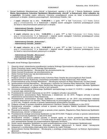 Katowice, dnia 18.04.2016 r. KOMUNIKAT I. Zarząd Spółdzielni Mieszkaniowej „Górnik” w Katowicach, zgodnie z § 65 ust. 1 Statutu Spółdzielni, zwołuje Walne Zgromadzenie Członków Spółdzielni Mieszkaniowej „Górnik” w Katowicach, które odbędzie się w częściach. Do każdej części zaliczono Członków posiadających prawa do lokali w nieruchomościach położonych w obrębie działania poszczególnych Administracji Osiedla, i tak: o I część odbędzie się w dniu 13.06.2016 r. o godz. 17°° w Sali Turkusowej 1,2,3 Hotelu Qubus przy ul. Uniwersyteckiej 13 w Katowicach i obejmie swoim zasięgiem Członków posiadających prawa do lokali w nieruchomościach położonych w obrębie: - Administracji Osiedla „Centrum”, - Administracji Osiedla „Rolna”. o II część odbędzie się w dniu 14.06.2016 r. o godz. 17°° w Sali Turkusowej 1,2,3 Hotelu Qubus przy ul. Uniwersyteckiej 13 w Katowicach i obejmie swoim zasięgiem Członków posiadających prawa do lokali w nieruchomościach położonych w obrębie: - Administracji Osiedla „Kokociniec”, - Administracji Osiedla „Zadole”. o III część odbędzie się w dniu 15.06.2016 r. o godz. 17°° w Sali Turkusowej 1,2,3 Hotelu Qubus przy ul. Uniwersyteckiej 13 w Katowicach i obejmie swoim zasięgiem Członków posiadających prawa do lokali w nieruchomościach położonych w obrębie: - Administracji Osiedla „Słoneczna”, - Administracji Osiedla „Załęże”, oraz Członków Oczekujących. Porządek obrad Walnego Zgromadzenia: 1. 2. 3. 4. 5. 6. 7. 8. 9. 10. 11. 12. 13. 14. 15. 16. 17. 18. 19. 20. 21. 22. 23. 24. Otwarcie obrad i stwierdzenie prawidłowości zwołania Walnego Zgromadzenia odbywanego w częściach. Wybór Prezydium danej części Walnego Zgromadzenia. Wybór Komisji Mandatowo – Skrutacyjnej i jej ukonstytuowanie się. Wybór Komisji Wnioskowej i jej ukonstytuowanie się. Wybór Komisji Wyborczej i jej ukonstytuowanie się. Przyjęcie porządku obrad. Podjęcie uchwał w sprawie ustalenia liczby Członków Rady Osiedla dla poszczególnych Rad Osiedli. Sprawozdanie Komisji Wyborczej i prezentacja kandydatów do Rady Nadzorczej i Rad Osiedli. Przeprowadzenie przez Komisję Mandatowo – Skrutacyjną wyborów do Rady Nadzorczej i do Rad Osiedli. Sprawozdanie Komisji Mandatowo – Skrutacyjnej z wyborów na Członków Rady Nadzorczej i Rad Osiedli. Rozpatrzenie odwołań od uchwał Rady Nadzorczej dotyczących wykreślenia z rejestru członków Spółdzielni członków oczekujących i podjęcie uchwał w tych sprawach. Omówienie sprawozdania finansowego Spółdzielni sporządzonego na dzień 31.12.2015 r. i podjęcie uchwały w sprawie jego zatwierdzenia. Przedstawienie nadwyżki bilansowej za rok 2015 i podjęcie uchwały o jej podziale. Przedstawienie sprawozdania Rady Nadzorczej z działalności za rok 2015. Podjęcie uchwały w sprawie zatwierdzenia sprawozdania Rady Nadzorczej. Przedstawienie sprawozdania Zarządu Spółdzielni z działalności za rok 2015 oraz omówienie realizacji wniosków skierowanych do Zarządu i Rady Nadzorczej na poszczególnych częściach Walnego Zgromadzenia w 2015 roku. Podjęcie uchwały w sprawie zatwierdzenia sprawozdania Zarządu. Podjęcie uchwały w sprawie udzielenia absolutorium Członkom Zarządu działającym w roku 2015. Rozpatrzenie wniosków i podjęcie uchwał w sprawie zmian zapisów Statutu Spółdzielni Mieszkaniowej „Górnik” w Katowicach. Rozpatrzenie wniosku i podjęcie uchwały w sprawie zmian zapisów „Regulaminu Rady Nadzorczej Spółdzielni Mieszkaniowej „Górnik” w Katowicach”. Przedstawienie strategii remontowej Spółdzielni na lata 2016-2020. Podjęcie uchwały w sprawie zatwierdzenia strategii remontowej Spółdzielni na lata 2016-2020. Rozpatrzenie wniosku i podjęcie uchwały w sprawie zgody na zbycie posiadanej przez Spółdzielnię na podstawie zasiedzenia działki nr 17/3 karta mapy 24 obręb Ligota o pow. 145 m 2 na rzecz Miasta Katowice oraz upoważnienie Zarządu do przeprowadzenia negocjacji cenowych. Wybór dwóch delegatów Spółdzielni na zjazd przedkongresowy przed VI Kongresem Spółdzielczości. Sprawozdanie Komisji Wnioskowej dotyczące wniosków zgłoszonych w trakcie obrad i tematycznie związanych z problematyką obejmującą teren działania tej części Walnego. Sprawozdanie Komisji Mandatowo - Skrutacyjnej z przebiegu przeprowadzonych na Walnym Zgromadzeniu głosowań. Zakończenie Walnego Zgromadzenia. II. Jednocześnie Zarząd informuje: 1. Członkowie Spółdzielni w terminie do 27.05.2016 r. mogą zgłaszać na piśmie projekty uchwał, sprawy do umieszczenia w porządku obrad. 2. Członkowie Spółdzielni mają prawo do zapoznania się ze sprawozdaniami za rok 2015, protokołem lustracji oraz projektami uchwał, które będą przedmiotem obrad każdej części Walnego Zgromadzenia, a wyłożone zostaną do wglądu od dnia 30.05.2016 r. w siedzibie Zarządu Spółdzielni przy ul. Mikołowskiej 125A w Katowicach - pokój nr 4 (zgodnie z zapisami § 66¹ Statutu Spółdzielni). 3. Poprawki do wyłożonych projektów uchwał, o których mowa w pkt II.2, Członkowie Spółdzielni mogą zgłaszać na piśmie w terminie do 10.06.2016 r. w siedzibie Zarządu - pokój nr 4. 4. Kandydatów na Członków Rady Nadzorczej jak i Rady Osiedla należy zgłaszać na piśmie, na wzorze udostępnionym przez Spółdzielnię, w terminie do 27.05.2016 r. w siedzibie Zarządu Spółdzielni - pokój nr 4. Zgłoszenie kandydata na Członka Rady Nadzorczej oraz Rady Osiedla winno zawierać - określenie, którego organu samorządowego zgłoszenie dotyczy, - nazwisko i imię oraz adres osoby zgłaszającej, - nazwisko i imię oraz adres kandydata . Zgłoszenie danego kandydata winno być poparte imiennymi podpisami, minimum 10 Członków, wraz ze wskazaniem miejsca zamieszkania. Kandydaci na Członków Rady Nadzorczej oraz Rady Osiedla składają w siedzibie Zarządu Spółdzielni - pokój nr 4 zgodnie z § 69 ust. 1