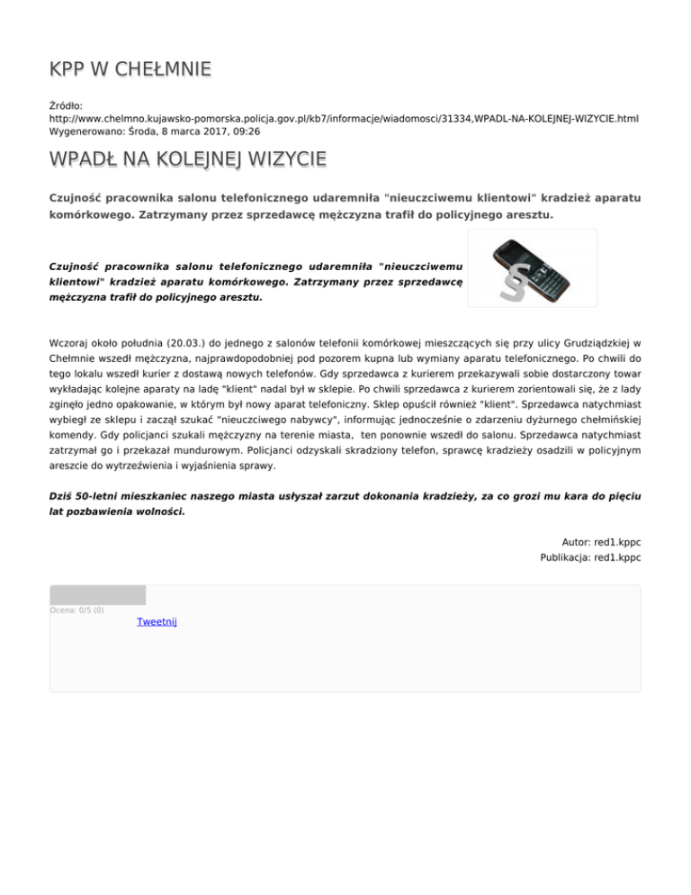 KPP W CHEŁMNIE Źródło: http://www.chelmno.kujawsko-pomorska.policja.gov.pl/kb7/informacje/wiadomosci/31334,WPADL-NA-KOLEJNEJ-WIZYCIE.html Wygenerowano: Środa, 8 marca 2017, 09:26 WPADŁ NA KOLEJNEJ WIZYCIE Czujność pracownika salonu telefonicznego udaremniła "nieuczciwemu klientowi" kradzież aparatu komórkowego. Zatrzymany przez sprzedawcę mężczyzna trafił do policyjnego aresztu. Czujność pracownika salonu telefonicznego udaremniła "nieuczciwemu klientowi" kradzież aparatu komórkowego. Zatrzymany przez sprzedawcę mężczyzna trafił do policyjnego aresztu. Wczoraj około południa (20.03.) do jednego z salonów telefonii komórkowej mieszczących się przy ulicy Grudziądzkiej w Chełmnie wszedł mężczyzna, najprawdopodobniej pod pozorem kupna lub wymiany aparatu telefonicznego. Po chwili do tego lokalu wszedł kurier z dostawą nowych telefonów. Gdy sprzedawca z kurierem przekazywali sobie dostarczony towar wykładając kolejne aparaty na ladę "klient" nadal był w sklepie. Po chwili sprzedawca z kurierem zorientowali się, że z lady zginęło jedno opakowanie, w którym był nowy aparat telefoniczny. Sklep opuścił również "klient". Sprzedawca natychmiast wybiegł ze sklepu i zaczął szukać "nieuczciwego nabywcy", informując jednocześnie o zdarzeniu dyżurnego chełmińskiej komendy. Gdy policjanci szukali mężczyzny na terenie miasta, ten ponownie wszedł do salonu. Sprzedawca natychmiast zatrzymał go i przekazał mundurowym. Policjanci odzyskali skradziony telefon, sprawcę kradzieży osadzili w policyjnym areszcie do wytrzeźwienia i wyjaśnienia sprawy. Dziś 50-letni mieszkaniec naszego miasta usłyszał zarzut dokonania kradzieży, za co grozi mu kara do pięciu lat pozbawienia wolności. Autor: red1.kppc Publikacja: red1.kppc Ocena: 0/5 (0) Tweetnij