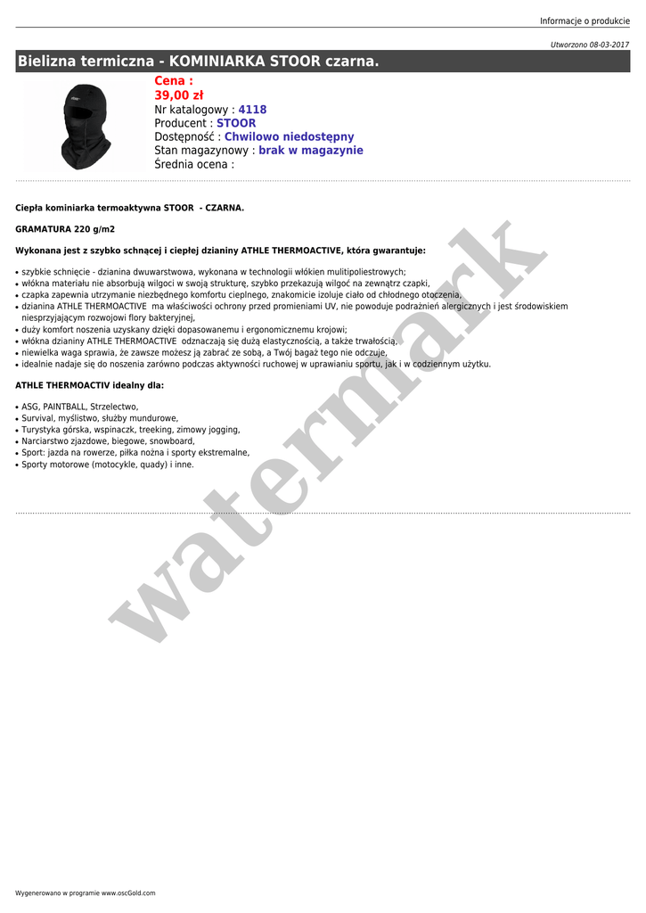 Informacje o produkcie Utworzono 08-03-2017 Bielizna termiczna - KOMINIARKA STOOR czarna. Cena : 39,00 zł Nr katalogowy : 4118 Producent : STOOR Dostępność : Chwilowo niedostępny Stan magazynowy : brak w magazynie Średnia ocena : Ciepła kominiarka termoaktywna STOOR - CZARNA. GRAMATURA 220 g/m2 ● ● ● ● ● ● ● ● szybkie schnięcie - dzianina dwuwarstwowa, wykonana w technologii włókien mulitipoliestrowych; włókna materiału nie absorbują wilgoci w swoją strukturę, szybko przekazują wilgoć na zewnątrz czapki, czapka zapewnia utrzymanie niezbędnego komfortu cieplnego, znakomicie izoluje ciało od chłodnego otoczenia, dzianina ATHLE THERMOACTIVE ma właściwości ochrony przed promieniami UV, nie powoduje podrażnień alergicznych i jest środowiskiem niesprzyjającym rozwojowi flory bakteryjnej, duży komfort noszenia uzyskany dzięki dopasowanemu i ergonomicznemu krojowi; włókna dzianiny ATHLE THERMOACTIVE odznaczają się dużą elastycznością, a także trwałością, niewielka waga sprawia, że zawsze możesz ją zabrać ze sobą, a Twój bagaż tego nie odczuje, idealnie nadaje się do noszenia zarówno podczas aktywności ruchowej w uprawianiu sportu, jak i w codziennym użytku. ATHLE THERMOACTIV idealny dla: ● ● ● ● ● ASG, PAINTBALL, Strzelectwo, Survival, myślistwo, służby mundurowe, Turystyka górska, wspinaczk, treeking, zimowy jogging, Narciarstwo zjazdowe, biegowe, snowboard, Sport: jazda na rowerze, piłka nożna i sporty ekstremalne, Sporty motorowe (motocykle, quady) i inne. w at ● er m ar k Wykonana jest z szybko schnącej i ciepłej dzianiny ATHLE THERMOACTIVE, która gwarantuje: Wygenerowano w programie www.oscGold.com