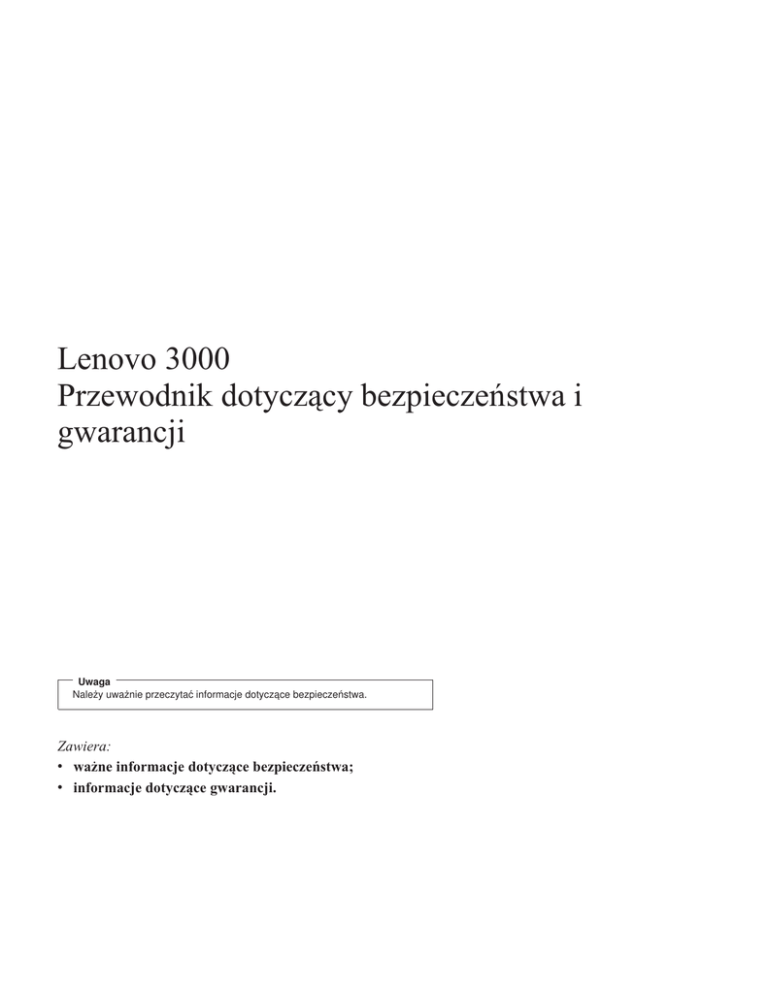 Lenovo 3000 Przewodnik dotyczący bezpieczeństwa i gwarancji Uwaga Należy uważnie przeczytać informacje dotyczące bezpieczeństwa. Zawiera: v ważne informacje dotyczące bezpieczeństwa; v informacje dotyczące gwarancji. Lenovo 3000 Przewodnik dotyczący bezpieczeństwa i gwarancji Uwaga Przed użyciem produktu przeczytaj Rozdział 1, “Ważne informacje dotyczące bezpieczeństwa”, na stronie 1. Wydanie pierwsze (Styczeń 2006) © Copyright Lenovo 2006. Wszelkie prawa zastrzeżone. Spis treści Rozdział 1. Ważne informacje dotyczące bezpieczeństwa . . . . . . . . . . . 1 Zdarzenia wymagające natychmiastowej reakcji . . 1 Ogólne wytyczne dotyczące bezpieczeństwa . . . 2 Naprawa . . . . . . . . . . . . . 2 Kable zasilające i zasilacze . . . . . . . 3 Przedłużacze i urządzenia powiązane . . . . 4 Wtyczki i gniazda zasilające . . . . . . . 4 Baterie i akumulatory . . . . . . . . . 5 Ciepło i wentylacja produktu . . . . . . . 5 Bezpieczeństwo napędów CD i DVD . . . . 6 Dodatkowe informacje dotyczące bezpieczeństwa . 7 © Copyright Lenovo 2006 Oświadczenie o zgodności z normami dla produktów laserowych . . . . . . . . 10 Rozdział 2. Informacje dotyczące gwarancji Warunki Ograniczonej Gwarancji Lenovo . . . Część 1 - Warunki ogólne . . . . . . . Część 2 - Warunki specyficzne dla poszczególnych krajów . . . . . . . . Część 3 - Informacje gwarancyjne . . . . . Załącznik dotyczący gwarancji dla Meksyku . . 13 13 13 17 32 37 iii iv Lenovo 3000 Przewodnik dotyczący bezpieczeństwa i gwarancji Rozdział 1. Ważne informacje dotyczące bezpieczeństwa Uwaga Należy uważnie przeczytać informacje dotyczące bezpieczeństwa. Niniejsze informacje pomagają bezpiecznie korzystać z komputera osobistego desktop lub notebook. Należy zachować wszelkie informacje dołączone do komputera i stosować się do nich. Informacje zamieszczone w niniejszym dokumencie nie wpływają ani na warunki zawarte w umowie nabycia, ani na Warunki Ograniczonej Gwarancji Lenovo. Bezpieczeństwo klienta jest bardzo ważne. Nasze produkty są projektowane tak, aby były skuteczne i bezpieczne w użytkowaniu. Jednak komputery osobiste są urządzeniami elektronicznymi. Kable zasilające, zasilacze i inne elementy mogą stanowić potencjalne zagrożenie bezpieczeństwa i przy niewłaściwym użytkowaniu mogą spowodować obrażenia lub szkody materialne. Aby zmniejszyć to zagrożenie, należy postępować zgodnie z instrukcjami dołączonymi do produktu, przestrzegać ostrzeżeń znajdujących się na produkcie i w instrukcjach obsługi oraz przejrzeć dokładnie informacje zawarte w niniejszym dokumencie. Uważne stosowanie się do informacji zawartych w niniejszym dokumencie i dostarczonych wraz z produktem pomoże ochronić się przed niebezpieczeństwem i utworzyć bezpieczne środowisko pracy z komputerem. Uwaga: Informacje te zawierają odniesienia do zasilaczy i baterii. Oprócz komputerów notebook, niektóre dostarczane produkty, takie jak głośniki i monitory, są wyposażone w zewnętrzny zasilacz. Do nich właśnie odnoszą się informacje z tego rozdziału. Ponadto w komputerze może znajdować się wewnętrzna bateria wielkości monety zapewniająca zasilanie zegarowi systemowemu w czasie, gdy komputer jest wyłączony, dlatego uwagi związane z baterią i dotyczące bezpieczeństwa odnoszą się do wszystkich komputerów. Zdarzenia wymagające natychmiastowej reakcji Produkty mogą ulec uszkodzeniu wskutek niewłaściwego użytkowania lub zaniedbania. Niektóre uszkodzenia są poważne i wymagają, aby zaprzestać używania produktu do czasu jego przeglądu oraz, jeśli niezbędna okaże się naprawa, do czasu jej wykonania przez autoryzowany serwis. Podobnie jak na każde urządzenie elektroniczne, na produkt należy zwracać szczególną uwagę, gdy jest on włączony. W bardzo rzadkich przypadkach można poczuć jakiś zapach, zauważyć smugę dymu lub iskrzenie wydobywające się z maszyny. Czasem również można usłyszeć odgłosy trzasków, pękania lub syczenia. © Copyright Lenovo 2006 1 Może to oznaczać, że wewnętrzny komponent elektroniczny zepsuł się w sposób kontrolowany i bezpieczny. Może to jednak również wskazywać na ewentualne zagrożenie bezpieczeństwa. W żadnym z tych przypadków nie należy podejmować ryzyka ani prób samodzielnej diagnozy sytuacji. Komputer i jego komponenty należy często przeglądać pod kątem uszkodzeń, śladów zużycia lub innych oznak zagrożenia. W przypadku jakichkolwiek wątpliwości dotyczących stanu któregokolwiek z komponentów nie należy używać produktu. Aby uzyskać informacje na temat sprawdzania produktu i, jeśli okaże się to konieczne, jego naprawy, należy skontaktować się z Centrum Wsparcia Klienta lub producentem produktu. Lista numerów telefonów serwisu i wsparcia znajduje się w podrozdziale “Ogólnoświatowa lista telefonów” na stronie 34. W tych rzadkich przypadkach, gdy można zauważyć objawy wymienione poniżej, albo jeśli wystąpią jakiekolwiek zastrzeżenia związane z bezpieczeństwem, należy zaprzestać używania produktu, wyłączyć go z zasilania oraz odłączyć od linii telefonicznych do czasu skontaktowania się z Centrum Wsparcia Klienta i uzyskania dalszych wskazówek. v Kable zasilające, wtyczki, przedłużacze, zabezpieczenia przeciwprzepięciowe oraz zasilacze, na których pojawiły się pęknięcia, które zostały złamane albo zniszczone. v Oznaki przegrzania, dym, iskrzenie lub pojawienie się ognia. v Uszkodzenie baterii (pęknięcia, wgniecenia, zgięcia), wyciek z baterii lub gromadzenie się na niej nieznanych substancji. v Odgłosy trzasków, pękania, syczenie albo silny zapach dobywający się z produktu. v Oznaki rozlania płynu lub ślady po upadku jakiegoś przedmiotu na produkt, kabel zasilający lub zasilacz. v Komputer, kabel zasilający lub zasilacz zostały narażone na kontakt z wodą. v Produkt został upuszczony lub w ja