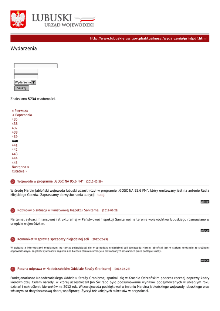 http://www.lubuskie.uw.gov.pl/aktualnosci/wydarzenia/printpdf.html Wydarzenia Wydarzenia ▼ Szukaj Znaleziono 5734 wiadomości. « Pierwsza < Poprzednia 435 436 437 438 439 440 441 442 443 444 445 Następna > Ostatnia » Wojewoda w programie „GOŚĆ NA 95,6 FM” (2012-02-29) W środę Marcin Jabłoński wojewoda lubuski uczestniczył w programie „GOŚĆ NA 95,6 FM”, który emitowany jest na antenie Radia Miejskiego Gorzów. Zapraszamy do wysłuchania audycji - tutaj. więcej Rozmowy o sytuacji w Państwowej Inspekcji Sanitarnej (2012-02-29) Na temat sytuacji finansowej i strukturalnej w Państwowej Inspekcji Sanitarnej na terenie województwa lubuskiego rozmawiano w urzędzie wojewódzkim. więcej Komunikat w sprawie sprzedaży niejadalnej soli (2012-02-29) W związku z informacjami medialnymi na temat pojawiającej się w sprzedaży niejadalnej soli Wojewoda Marcin Jabłoński jest w stałym kontakcie ze służbami odpowiedzialnymi za jakość żywności w regionie i na bieżąco zbiera informacje o prowadzonych działaniach przez podległe służby. więcej Roczna odprawa w Nadodrzańskim Oddziale Straży Granicznej (2012-02-28) Funkcjonariusze Nadodrzańskiego Oddziału Straży Granicznej spotkali się w Krośnie Odrzańskim podczas rocznej odprawy kadry kierowniczej. Celem narady, w której uczestniczył Jan Świrepo było podsumowanie wyników podejmowanych w ubiegłym roku działań i nakreślenie kierunków na 2012 rok. Wicewojewoda podziękował w imieniu Marcina Jabłońskiego wojewody lubuskiego oraz własnym za dotychczasową dobrą współpracę. Życzył też kolejnych sukcesów w przyszłości. więcej Wojewoda na Konwencie Starostów i Wicestarostów (2012-02-28) Finansowanie samorządów, polityka społeczna oraz zmiany w ustawie o działalności leczniczej – to tylko niektóre z tematów poruszanych podczas Konwentu, który odbył się w Żaganiu. W debacie uczestniczył Wojewoda Marcin Jabłoński. więcej Uratowali życie (2012-02-28) Policjant Robert Wawryn oraz pracownicy pogotowia Zofia Nosko i Sylwia Kazan to ludzie, których cechuje opanowanie i profesjonalizm. Dzięki ich telefonicznym wskazówkom udało się ocalić życie dwóch osób. We wtorek wojewoda Marcin Jabłoński podziękował całej trójce za bohaterską postawę. więcej Zadania związane z usuwaniem skutków powodzi zatwierdzone przez ministra (2012-02-27) Za 1,3 mln zł ma zostać wyremontowana droga wojewódzka 278 Szklarka Radnicka – Brody. Na naprawę kanałów i wałów, czyli infrastrukturę przeciwpowodziową, przeznaczone mają być pozostałe 2 mln zł. Minister Spraw Wewnętrznych zatwierdził zadania związane z usuwaniem skutków powodzi w naszym regionie. więcej Kolejne pieniądze na usuwawanie szkód powodzi (2012-02-24) Minister Spraw Wewnętrznych zatwierdził „Wykaz zadań jednostek samorządu terytorialnego związanych z usuwaniem szkód powodzi z maja i czerwca 2010 roku do sfinansowania w ramach środków Funduszu Solidarności Unii Europejskiej do realizacji w 2012 roku”. więcej Rusza konkurs z okazji Międzynarodowego Dnia Obrony Cywilnej (2012-02-24) Marcin Jabłoński wojewoda lubuski ogłasza konkurs „Obrona Cywilna 2012”. Od dziś do 5 marca czekamy na odpowiedzi. Wszystko w związku z obchodami Międzynarodowego Dnia Obrony Cywilnej. więcej OSP Santocko w Krajowym Systemie Ratowniczo-Gaśniczym (2012-02-24) Ochotnicza Straż Pożarna w Santocku została włączona do Krajowego Systemu Ratowniczo-Gaśniczego. więcej « Pierwsza < Poprzednia 435 436 437 438 439 440 441 442 443 444 445 Następna > Ostatnia »