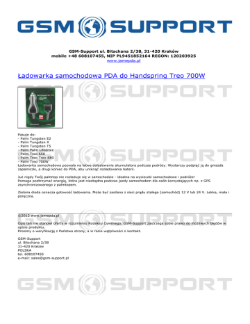 GSM-Support ul. Bitschana 2/38, 31-420 Kraków mobile +48 608107455, NIP PL9451852164 REGON: 120203925 www.jamepda.pl Ładowarka samochodowa PDA do Handspring Treo 700W Pasuje do: - Palm Tungsten E2 - Palm Tungsten X - Palm Tungsten T5 - Palm Palm Lifedrive - Palm Treo 650 - Palm Treo Treo 680 - Palm Treo 700W Ładowarka samochodowa pozwala na łatwe doładowanie akumulatora podczas podróży. Wystarczy podpiąć ją do gniazda zapalniczki, a drugi koniec do PDA, aby uniknąć rozładowania baterii. Już nigdy Twój palmtop nie rozładuje się w samochodzie - idealna na wycieczki samochodowe i podróże! Pomaga podtrzymać energię, która jest niezbędna podczas jazdy samochodem dla osób korzystających np. z GPS zsynchronizowanego z palmtopem. Zielona dioda oznacza gotowość ładowania. Może być zasilana z sieci prądu stałego (samochód) 12 V lub 24 V. Lekka, mała i poręczna. ©2012 www.jamepda.pl Opis ten nie stanowi oferty w rozumieniu Kodeksu Cywilnego. GSM-Support zastrzega sobie prawo do możliwych błędów w opisie produktu. Prosimy o weryfikację z Państwa strony, a w razie wątpliwości o kontakt. GSM-Support ul. Bitschana 2/38 31-420 Kraków POLSKA tel. 608107455 e-mail: [email protected] Powered by TCPDF (www.tcpdf.org)