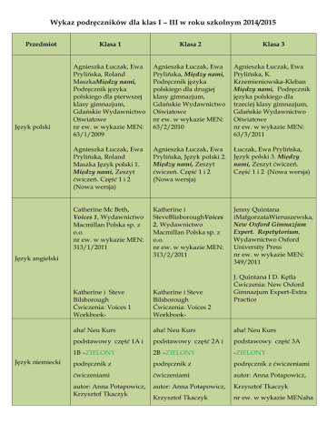Wykaz podręczników dla klas I – III w roku szkolnym 2014/2015 Przedmiot Język polski Klasa 1 Klasa 2 Klasa 3 Agnieszka Łuczak, Ewa Prylińska, Roland MaszkaMiędzy nami, Podręcznik języka polskiego dla pierwszej klasy gimnazjum, Gdańskie Wydawnictwo Oświatowe nr ew. w wykazie MEN: 63/1/2009 Agnieszka Łuczak, Ewa Prylińska, Między nami, Podręcznik języka polskiego dla drugiej klasy gimnazjum, Gdańskie Wydawnictwo Oświatowe nr ew. w wykazie MEN: 63/2/2010 Agnieszka Łuczak, Ewa Prylińska, K. Krzemieniowska-Kleban Między nami, Podręcznik języka polskiego dla trzeciej klasy gimnazjum, Gdańskie Wydawnictwo Oświatowe nr ew. w wykazie MEN: 63/3/2011 Agnieszka Łuczak, Ewa Prylińska, Roland Maszka Język polski 1. Między nami, Zeszyt ćwiczeń. Część 1 i 2 (Nowa wersja) Agnieszka Łuczak, Ewa Prylińska, Język polski 2. Między nami, Zeszyt ćwiczeń. Część 1 i 2 (Nowa wersja) Łuczak, Ewa Prylińska, Język polski 3. Między nami, Zeszyt ćwiczeń. Część 1 i 2 (Nowa wersja) Catherine Mc Beth, Voices 1, Wydawnictwo Macmillan Polska sp. z o.o. nr ew. w wykazie MEN: 313/1/2011 Katherine i SteveBlisboroughVoices 2, Wydawnictwo Macmillan Polska sp. z o.o. nr ew. w wykazie MEN: 313/2/2011 Jenny Quintana iMałgorzataWieruszewska, New Oxford Gimnazjum Expert. Repetytorium, Wydawnictwo Oxford University Press nr ew. w wykazie MEN: 349/2011 Język angielski Język niemiecki J. Quintana I D. Kętla Ćwiczenia: New Oxford Gimnazjum Expert-Extra Practice Katherine i Steve Bilsborough Ćwiczenia: Voices 1 Workbook- Katherine i Steve Bilsborough Ćwiczenia: Voices 2 Workbook- aha! Neu Kurs aha! Neu Kurs aha! Neu Kurs podstawowy część 1A i podstawowy część 2A i podstawowy część 3A 1B –ZIELONY 2B –ZIELONY -ZIELONY podręcznik z podręcznik z podręcznik z ćwiczeniami ćwiczeniami ćwiczeniami autor: Anna Potapowicz, autor: Anna Potapowicz, Krzysztof Tkaczyk autor: Anna Potapowicz, Krzysztof Tkaczyk Krzysztof Tkaczyk nr ew. w wykazie MENaha nr ew. w wykazie MEN nr ew. w wykazie aha 1a 13/1/2009 aha 1b MENaha 2a 13/3/2009 13/1/2009 aha 2b 13/4/2010 3a 13/6/2011 Klasa pierwsza z Klasa II d językowa Klasa III d językowa aha! Neu Kurs aha! Neu Kurs aha! Neu Kurs rozszerzony rozszerzony część 1A i rozszerzony część 2A i część 3A i 3B –NIEBIESKI 1B – NIEBIESKI 2B –NIEBIESKI podręcznik z ćwiczeniami podręcznik z podręcznik z autor: Anna Potapowicz, ćwiczeniami ćwiczeniami Krzysztof Tkaczyk autor: Anna Potapowicz, Krzysztof Tkaczyk nr ew. w wykazie MENaha 1a 86/1/2009 aha 1b 86/2/2009 autor: Anna Potapowicz, nr ew. w wykazie MENaha Krzysztof Tkaczyk 3a 86/5/2009 nr ew. w wykazie aha 3b 86/6/2009 dodatkowymi zajęciami z języków obcych MENaha 2a 86/3/2009 aha 2b 86/4/2009 Historia Lech Trzcionkowski, Leszek Wojciechowski. Historia. Podręcznik dla gimnazjum. Klasa I, Wydawnictwo Szkolne PWN nr ew. w wykazie MEN: 129/1/2009 WOS Matematyka Praca zbiorowa pod red. Małgorzaty Dobrowolskiej Matematyka z plusem Gdańskie Wydawnictwo Oświatowe Jacek Chachaj, Janusz Drob, Historia. Czasy nowożytne. Podręcznik dla gimnazjum. Klasa II, Wydawnictwo Szkolne PWN nr ew. w wykazie MEN: 129/2/2010 Jacek Chachaj, Janusz Drob, Historia. Wiek XIX i wielka wojna. Podręcznik dla gimnazjum. Klasa III, Wydawnictwo Szkolne PWN nr ew. w wykazie MEN: 129/3/2011 Elżbieta Dobrzycka, Krzysztof Makara, Wiedza o społeczeństwie 1, Wydawnictwo Operon, nr ew. w wykazie MEN: 96/1/2009 Elżbieta Dobrzycka, Krzysztof Makara, Wiedza o społeczeństwie 2, Wydawnictwo Operon, nr ew. w wykazie MEN: 96/2/2010 Praca zbiorowa pod redakcja Małgorzaty Dobrowolskiej Matematyka z plusem Gdańskie Wydawnictwo Oświatowe Praca zbiorowa pod redakcja Małgorzaty Dobrowolskiej Matematyka z plusem Gdańskie Wydawnictwo Oświatowe Fizyka Chemia nr ew. w wykazie MEN: 168/1/2009 nr ew. w wykazie MEN: 168/2/2010 nr ew. w wykazie MEN: 168/3/2011 Barbara Sagnowska, Maria Rozenbajgier, Ryszard Rozenbajgier, Świat fizyki. Świat fizyki. 1, Wydawnictwo Zamkornr ew. w wykazie MEN: 11/1/2009 Barbara Sagnowska, Maria Rozenbajgier, Ryszard Rozenbajgier, Świat fizyki. Świat fizyki. 2, Wydawnictwo Zamkor nr ew. w wykazie MEN: 11/2/2010 Barbara Sagnowska, Maria Rozenbajgier, Ryszard Rozenbajgier, Świat fizyki3 , Wydawnictwo Zamkor nr ew. w wykazie MEN: 11/3/2010 Bożena Kupczyk, Wiesława Nowak , Maria Barbara Szczepaniak, Chemia 1 WydawnictwoOperon nr ew. w wykazie MEN: 44/1/2009, Maria Barbara Szczepaniak, Janina Waszczuk Chemia 2 Wydawnictwo WydawnictwoOperon nr ew. w wykazie MEN: 44/2/2010 Maria Barbara Szczepaniak, Janina Waszczuk Chemia 3Wydawnictwo WydawnictwoOperon nr ew. w wykazie MEN: 44/3/2011 Małgorzata Jefimow, Puls życia 2, Wydawnictwo Nowa Era, nr ew. w wykazie MEN: 58/2/2010 Beata Sągin, Andrzej Boczarowski, Marian Sęktas, Puls życia 3, Wydawnictwo Nowa Era, nr ew. w wykazie MEN: 5/3/2010 Bożena Dobosik, Adam Hibszer, Józefa Soja Podręcznik do klasy 3Puls ziemi , Wydawnictwo Nowa Era nr ew. w wykazie MEN: 5/2/2010 Roman Malarz, Podręcznik do klasy 2 Puls ziemi , Wydawnictwo Nowa Era nr ew. w wykazie MEN: 5/3/2010 Bożena Kupczyk, Wiesław Nowak, Mirosława Pryka Zeszyt ćwiczeń dla ucznia 1 Biologia Geografia Małgorzata Jefimow, Marian Sęktas, Puls życia 1, Wydawnictwo Nowa Era, nr ew. w wykazie MEN: 58/1/2009 E. Mazurek, Ji J. Pawłowscy, A. ZdziennickaPuls życia. Zeszyt ćwiczeń, wydawnictwo Nowa era Roman Malarz, Podręcznik do Klasy 1Puls ziemi , Wydawnictwo Nowa Era nr ew. w wykazie MEN: 5/1/2009 Muzyka Religia Edukacja dla bezpieczeństwa Piotr Kaja, Od chorału do rap – songu, Wydawnictwo Juka, nr ew. w wykazie MEN: 174/09 Red. Jan Szpet, Danuta Jackowiak Spotkanie ze Słowem Wydawnictwo Święty Wojciech nr ew. w wykazie MEN: AZ-31-01/10-PO-1/11 Red. Jan Szpet, Danuta Jackowiak Aby nie ustać w drodze Wydawnictwo Święty Wojciech nr ew. w wykazie MEN: AZ-32-01/10-PO-1/12 Red. Jan Szpet, Danuta Jackowiak Żyć w miłości Boga. Wydawnictwo Święty Wojciech nr ew.