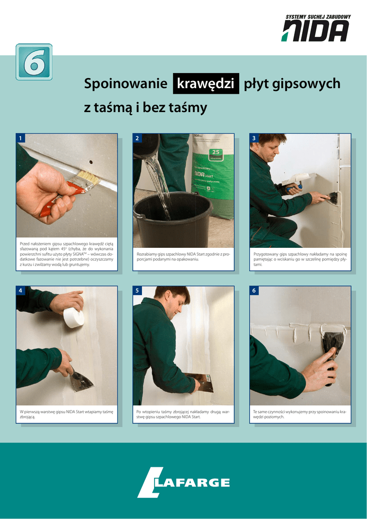 Spoinowanie krawędzi płyt gipsowych z taśmą i bez taśmy 1 Przed nałożeniem gipsu szpachlowego krawędź ciętą sfazowaną pod kątem 45o (chyba, że do wykonania powierzchni sufitu użyto płyty SIGNATM – wówczas dodatkowe fazowanie nie jest potrzebne) oczyszczamy z kurzu i zwilżamy wodą lub gruntujemy. 2 Rozrabiamy gips szpachlowy NIDA Start zgodnie z proporcjami podanymi na opakowaniu. 3 Przygotowany gips szpachlowy nakładamy na spoinę pamiętając o wciskaniu go w szczelinę pomiędzy płytami. 4 5 6 W pierwszą warstwę gipsu NIDA Start wtapiamy taśmę zbrojącą. Po wtopieniu taśmy zbrojącej nakładamy drugą warstwę gipsu szpachlowego NIDA Start. Te same czynności wykonujemy przy spoinowaniu krawędzi poziomych. 7 8 9 Kolejnym etapem jest przygotowanie gipsu szpachlowego NIDA Finisz. Następnie na spoinę nakładamy ostateczną warstwę gipsu NIDA Finisz za pomocą pacy. 10 11 Do spoinowania połączeń pomiędzy płytami gipsowymi można stosowac również gips szpachlowy NIDA Planfix Fresh. Gips ten nie wymaga użycia taśmy zbrojącej. Wyschniętą spoinę wygładzamy zacieraczką z papierem siateczkowym. 12 Po zaspoinowaniu wszystkich połączeń powierzchnia płyt jest przygotowana do ostatecznego wykończenia; jak malowanie, tapetowanie, nakładanie tynków japońskich. Gwarantujemy uzyskanie wysokiej jakości wykończenia przy zastosowaniu elementów systemu NIDA. Zużycie gipsów szpachlowych na 1 m2 spoinowanej płyty gipsowej (bez odpadów): Materiał Ilość j.m. 0,3 kg gips szpachlowy NIDA Finisz 0,1 kg taśma zbrojąca NIDA 1,2 m gips szpachlowy NIDA Planfix Fresh** 0,25 kg gips szpachlowy NIDA Start* Cena u Twojego Dystrybutora * zużycie przy zastosowaniu płyt SIGNATM ** przy zastosowaniu gipsu NIDA Planfix Fresh nie ma konieczności stosowania taśmy zbrojącej LAFARGE GIPS SP. Z O.O. ul. Iłżecka 24 bud. F, 02-135 Warszawa tel. +48 (41) 35 78 200 www.lafargegips.pl