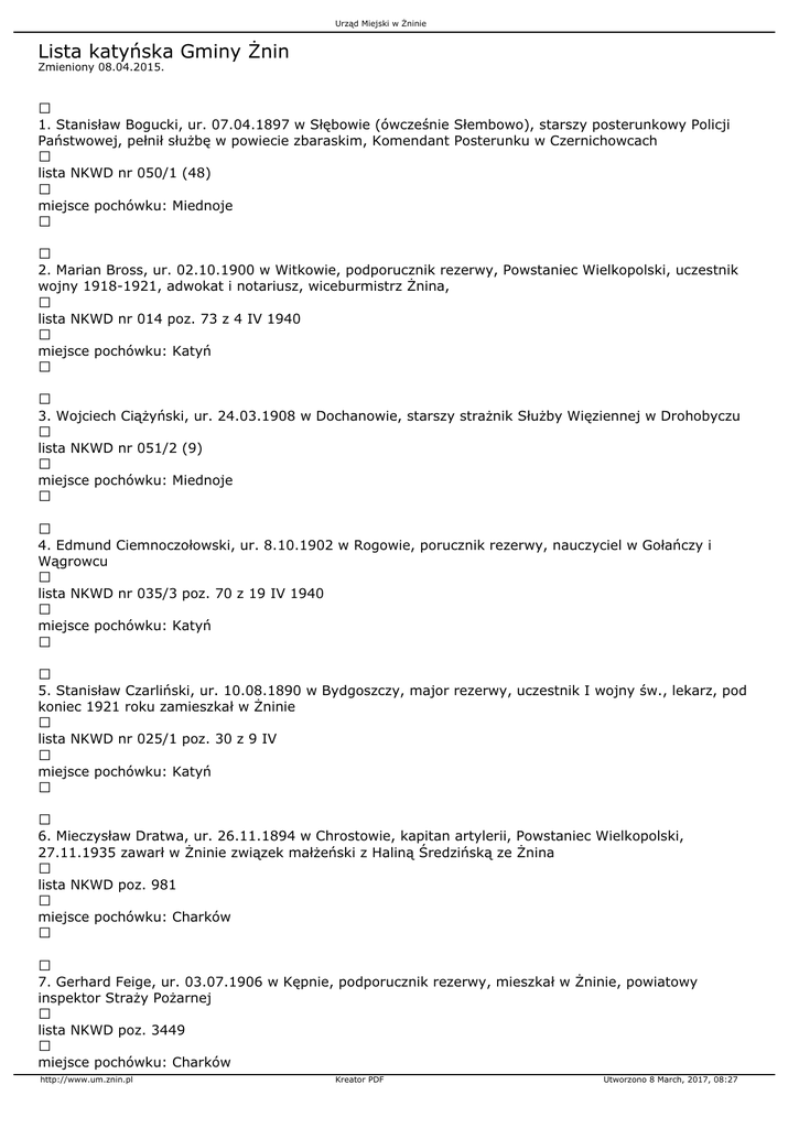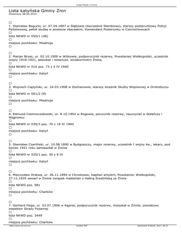 Urząd Miejski w Żninie Lista katyńska Gminy Żnin Zmieniony 08.04.2015. 1. Stanisław Bogucki, ur. 07.04.1897 w Słębowie (ówcześnie Słembowo), starszy posterunkowy Policji Państwowej, pełnił służbę w powiecie zbaraskim, Komendant Posterunku w Czernichowcach lista NKWD nr 050/1 (48) miejsce pochówku: Miednoje 2. Marian Bross, ur. 02.10.1900 w Witkowie, podporucznik rezerwy, Powstaniec Wielkopolski, uczestnik wojny 1918-1921, adwokat i notariusz, wiceburmistrz Żnina, lista NKWD nr 014 poz. 73 z 4 IV 1940 miejsce pochówku: Katyń 3. Wojciech Ciążyński, ur. 24.03.1908 w Dochanowie, starszy strażnik Służby Więziennej w Drohobyczu lista NKWD nr 051/2 (9) miejsce pochówku: Miednoje 4. Edmund Ciemnoczołowski, ur. 8.10.1902 w Rogowie, porucznik rezerwy, nauczyciel w Gołańczy i Wągrowcu lista NKWD nr 035/3 poz. 70 z 19 IV 1940 miejsce pochówku: Katyń 5. Stanisław Czarliński, ur. 10.08.1890 w Bydgoszczy, major rezerwy, uczestnik I wojny św., lekarz, pod koniec 1921 roku zamieszkał w Żninie lista NKWD nr 025/1 poz. 30 z 9 IV miejsce pochówku: Katyń 6. Mieczysław Dratwa, ur. 26.11.1894 w Chrostowie, kapitan artylerii, Powstaniec Wielkopolski, 27.11.1935 zawarł w Żninie związek małżeński z Haliną Średzińską ze Żnina lista NKWD poz. 981 miejsce pochówku: Charków 7. Gerhard Feige, ur. 03.07.1906 w Kępnie, podporucznik rezerwy, mieszkał w Żninie, powiatowy inspektor Straży Pożarnej lista NKWD poz. 3449 miejsce pochówku: Charków http://www.um.znin.pl Kreator PDF Utworzono 8 March, 2017, 08:27 Urząd Miejski w Żninie 8. Leonard Fibak, ur. 29.08.1903 w Żninie, podporucznik rezerwy, technik farmacji lista NKWD nr 035/2 poz. 82 z 16 IV miejsce pochówku: Katyń 9. Tadeusz Jeszke, ur. 18.02.1894 w Gorzycach, kapitan, uczestnik I wojny św., wojny 1919-21, Powstaniec Wielkopolski, urzędnik lista NKWD nr 052/4 poz. 87 z 27 IV miejsce pochówku: Katyń 10. Antoni Jeszkowski, ur. 06.01.1895 w Chomiąży Księżej, starszy posterunkowy Policji Państwowej, zast. komendanta posterunku w Drawsku lista NKWD nr 023/2 poz. 26 z 10 IV miejsce pochówku: Miednoje 11. Ludomir Katafiasz, ur. 02.11.1912 w Jaroszewie, podporucznik rezerwy, rolnik lista NKWD nr 035/4 poz. 37 z 16 IV miejsce pochówku: Katyń 12. Władysław Klucz, ur. 27.07.1897 w Górze, major, Powstaniec Wielkopolski, uczestnik wojny 1919-21 lista NKWD nr 022/3 poz. 25 z 9 IV miejsce pochówku: Katyń 13. Wacław Kołodziejczak, ur. 18.05.1897 w Jaroszewie, kapitan rezerwy, Powstaniec Wielkopolski, uczestnik wojny 1919-21, rolnik lista NKWD z 02/2 poz. 99 z 2 IV miejsce pochówku: Katyń 14. Antoni Kruszka, ur. 14.01.1890 w Dochanowie, major weterynarii rezerwy lista NKWD poz. 1723 miejsce pochówku: Charków http://www.um.znin.pl Kreator PDF Utworzono 8 March, 2017, 08:27 Urząd Miejski w Żninie 15. Adam Lisiecki, ur. 18.12.1895 w Janowcu, podporucznik rezerwy, Powstaniec Wielkopolski, uczestnik akcji plebiscytowej na Górnym Śląsku, nauczyciel w Bydgoszczy lista NKWD nr 052/2 poz. 19 z 27 IV miejsce pochówku: Katyń 16. Władysław Markowski, ur. 20.10.1907 w Dąbrowie, starszy posterunkowy Policji Państwowej, funkcjonariusz Komendy Powiatowej PP w Żninie lista NKWD nr 023/3 poz. 36 z 10 IV miejsce pochówku: Miednoje 17. Jan Mazanek, ur. 26.06.1895 w Albigowej, podkomisarz PP, Komendant Komendy Powiatowej Policji Państwowej w Żninie lista NKWD r. 05/4 poz. 24 z 5 IV miejsce pochówku: Miednoje 18. Tadeusz Pietrykowski, ur. 14.10.1895 w Gorzycach, porucznik rezerwy, Powstaniec Wielkopolski, uczestnik wojny 1919-21, prawnik lista ukraińska NKWD nr 41/2 poz. 12 z 20 IV miejsce pochówku: nieznane (różne źródła podają Katyń, Tarnopol, Charków) 19. Wincenty Pietrykowski, ur. 28.03.1898 w Gorzycach, porucznik rezerwy, Powstaniec Wielkopolski, lekarz lista NKWD poz. 2524 miejsce pochówku: Charków 20. Józef Pituła, ur. 11.03.1903 w Dziewierzewie, podporucznik rezerwy, nauczyciel w Obrze k. Wolsztyna lista NKWD nr 035/2 poz. 67 z 16 IV miejsce pochówku: Katyń 21. Tadeusz Pixa, ur. 01.10.1911 w Żninie, podporucznik rezerwy, nauczyciel w Wolsztynie lista NKWD poz. 2520 miejsce pochówku: Charków 22. Feliks Pogorzelski, ur. 05.10.1894 w Pogorzelu, kapitan rezerwy, uczestnik I wojny św. i wojny 1919http://www.um.znin.pl Kreator PDF Utworzono 8 March, 2017, 08:27 Urząd Miejski w Żninie 21, inżynier chemik, wicedyrektor cukrowni w Żninie lista NKWD nr 022/2 poz. 58 z 9 IV lub 11 IV miejsce pochówku: Katyń 23. Rafał Sławoszewski, ur. 15.09.1900 w Sławoszewie, podporucznik rezerwy, pracował w Straży Granicznej lista NKWD nr 032/2 poz. 66 z 14 IV miejsce pochówku: Katyń 24. Franciszek Springer, ur. 21.10.1899 w Cerekwicy, st. posterunkowy Policji Państwowej (m.in. w woj. tarnopolskim) lista NKWD nr 037/3 (41) miejsce pochówku: Miednoje 25. Antoni Sulczyński, ur. 25.06.1906 w Daleszycach (pow. kielecki), podporucznik rezerwy, nauczyciel w szkole powszechnej w Żninie lista NKWD poz. 3256 miejsce pochówku: Charków 26. Władysław Szmidt, ur. 26.07.1890 w Gąsawie, podporucznik rezerwy, kupiec ze Żnina lista NKWD nr 014 poz. 29 z 4 IV miejsce pochówku: Katyń 27. Franciszek Śmigaj, ur. 09.09.1884 w Żninie, st. posterunkowy Policji Państwowej, Komenda Wojewódzka Policji w Toruniu lista NKWD nr 044/2 (51) miejsce pochówku: Miednoje 28. Roman Święcicki, ur. 15.07.1898 w Żernikach, podporucznik rezerwy – pilot, Powstaniec Wielkopolski, w roku 1919 walczył m.in. pod Żninem, mieszkał w Janowcu, urzędnik lista NKWD nr 017/1 poz. 48 z 4 IV lub 7 IV miejsce pochówku: Katyń http://www.um.znin.pl Kreator PDF Utworzono 8 March, 2017, 08:27
