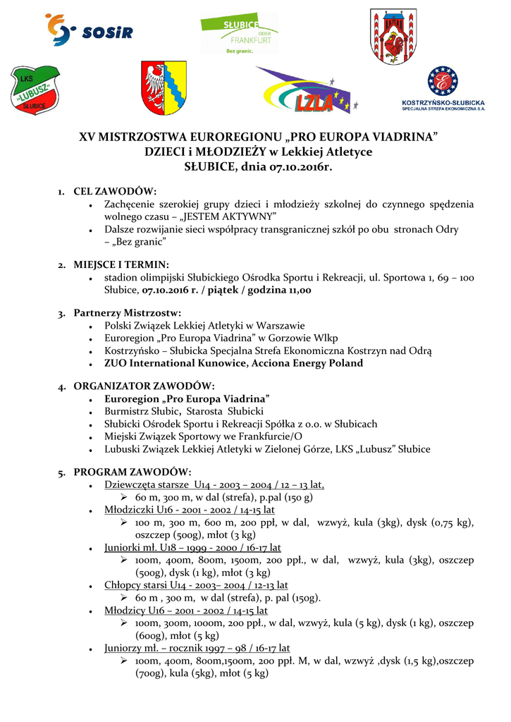 XV MISTRZOSTWA EUROREGIONU „PRO EUROPA VIADRINA” DZIECI i MŁODZIEŻY w Lekkiej Atletyce SŁUBICE, dnia 07.10.2016r. 1. CEL ZAWODÓW: Zachęcenie szerokiej grupy dzieci i młodzieży szkolnej do czynnego spędzenia wolnego czasu – „JESTEM AKTYWNY” Dalsze rozwijanie sieci współpracy transgranicznej szkół po obu stronach Odry – „Bez granic” 2. MIEJSCE I TERMIN: stadion olimpijski Słubickiego Ośrodka Sportu i Rekreacji, ul. Sportowa 1, 69 – 100 Słubice, 07.10.2016 r. / piątek / godzina 11,00 3. Partnerzy Mistrzostw: Polski Związek Lekkiej Atletyki w Warszawie Euroregion „Pro Europa Viadrina” w Gorzowie Wlkp Kostrzyńsko – Słubicka Specjalna Strefa Ekonomiczna Kostrzyn nad Odrą ZUO International Kunowice, Acciona Energy Poland 4. ORGANIZATOR ZAWODÓW: Euroregion „Pro Europa Viadrina” Burmistrz Słubic, Starosta Słubicki Słubicki Ośrodek Sportu i Rekreacji Spółka z o.o. w Słubicach Miejski Związek Sportowy we Frankfurcie/O Lubuski Związek Lekkiej Atletyki w Zielonej Górze, LKS „Lubusz” Słubice 5. PROGRAM ZAWODÓW: Dziewczęta starsze U14 - 2003 – 2004 / 12 – 13 lat, 60 m, 300 m, w dal (strefa), p.pal (150 g) Młodziczki U16 - 2001 - 2002 / 14-15 lat 100 m, 300 m, 600 m, 200 ppł, w dal, wzwyż, kula (3kg), dysk (0,75 kg), oszczep (500g), młot (3 kg) Juniorki mł. U18 – 1999 - 2000 / 16-17 lat 100m, 400m, 800m, 1500m, 200 ppł., w dal, wzwyż, kula (3kg), oszczep (500g), dysk (1 kg), młot (3 kg) Chłopcy starsi U14 - 2003– 2004 / 12-13 lat 60 m , 300 m, w dal (strefa), p. pal (150g). Młodzicy U16 – 2001 - 2002 / 14-15 lat 100m, 300m, 1000m, 200 ppł., w dal, wzwyż, kula (5 kg), dysk (1 kg), oszczep (600g), młot (5 kg) Juniorzy mł. – rocznik 1997 – 98 / 16-17 lat 100m, 400m, 800m,1500m, 200 ppł. M, w dal, wzwyż ,dysk (1,5 kg),oszczep (700g), kula (5kg), młot (5 kg) 6. ZASADY I WARUNKI UCZESTNICTWA: w zawodach prawo startu mają dzieci i młodzież w poszczególnych kategoriach wiekowych zgodnie z programem zawodów, a w kat. seniorzy zawodniczka /zawodnik ma prawo startu w dwóch konkurencjach indywidualnych zgodnie ze zgłoszeniem Opłata startowa zgodna z regulaminem PZLA (kat junior młodszy) tj. 5,00 PLN od każdej konkurencji 7. TERMIN I MIEJSCE ZGŁOSZENIA: imienne zgłoszenie obowiązuje wyłącznie systemem zgłoszeń elektronicznych, który wraz z instrukcją zamieszczony jest pod adresem:http://www.domtelsport.pl/zgłoszenia/. System zgłoszeń otwarty jest od dnia 16 września 2016r do godziny 20,00 w dniu 04.10.2016r. W przypadku problemów ze zgłoszeniem prosimy o kontakt z organizatorem: Słubicki Ośrodek Sportu i Rekreacji w Słubicach Spółka z o.o., ul. Sportowa 1, 69 – 100 Słubice, fax (095) 758 4778, tel.758 2501, e-mail: [email protected] podając imię i nazwisko dziecka /zawodnika, rok urodzenia szkołę / klub i konkurencję zgodną z regulaminem. 8. SYSTEM I SPOSÓB PRZEPROWAZENIA ZAWODÓW: zawody zostaną rozegrane zgodnie z przepisami PZLA oraz ustaleniami niniejszego regulaminu 9. NAGRODY: Najlepsi zawodnicy za uzyskane wyniki otrzymają pamiątkowe puchary (po 3 puchary w kategorii wiekowej) w konkurencjach indywidualnych za miejsce I- III - pamiątkowe medale – Mistrza Euroregionu ”Pro Europa Viadrina” 10. KOSZTY UDZIAŁU W ZAWODACH: Koszty organizacyjne pokrywa organizator, a koszta osobowe startujące reprezentacje szkolne / klubowe opłata startowa zgodnie z pkt. 6 regulaminu zawodów i par. 3 – opłata regulaminowa terminarza imprez / regulaminy PZLA na sezon 2016. 11. UBEZPIECZENIE UCZESTNIKÓW: organizator ubezpiecza wszystkich uczestników ( ubezpieczenie NW) 12. SPRAWY RÓŻNE: biuro zawodów czynne w dniu 06.10.2016 r. w godz. 7,00-15,00 i w dniu 07.10.2016r. w godz. 7,00-10,00, gdzie nastąpi weryfikacja zawodników / weryfikator LZLA Zielona Góra /, Organizator może zabezpieczyć dla zainteresowanych noclegi i wyżywienie na koszt zamawiającego. Koszt noclegu oraz wyżywienia (nocleg, kolacja 06.10.2016 r., śniadanie , obiad 07.10.2016) wynosi 85 zł /osobę, sam obiad w dniu zawodów: 15 zł Zgłoszenia należy dokonać do dnia 04.10.2016r r. u Organizatora– tj. SOSIR Słubice, e-mail: [email protected] 13. SPRAWOZDAWCZOŚĆ: oficjalny komunikat zawodów zostanie umieszczony na stronach internetowych SOSIR Słubice i LZLA Zielona Góra ORGANIZATOR