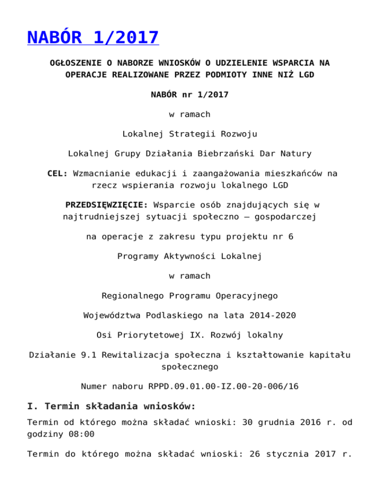 NABÓR 1/2017 OGŁOSZENIE O NABORZE WNIOSKÓW O UDZIELENIE WSPARCIA NA OPERACJE REALIZOWANE PRZEZ PODMIOTY INNE NIŻ LGD NABÓR nr 1/2017 w ramach Lokalnej Strategii Rozwoju Lokalnej Grupy Działania Biebrzański Dar Natury CEL: Wzmacnianie edukacji i zaangażowania mieszkańców na rzecz wspierania rozwoju lokalnego LGD PRZEDSIĘWZIĘCIE: Wsparcie osób znajdujących się w najtrudniejszej sytuacji społeczno – gospodarczej na operacje z zakresu typu projektu nr 6 Programy Aktywności Lokalnej w ramach Regionalnego Programu Operacyjnego Województwa Podlaskiego na lata 2014-2020 Osi Priorytetowej IX. Rozwój lokalny Działanie 9.1 Rewitalizacja społeczna i kształtowanie kapitału społecznego Numer naboru RPPD.09.01.00-IZ.00-20-006/16 I. Termin składania wniosków: Termin od którego można składać wnioski: 30 grudnia 2016 r. od godziny 08:00 Termin do którego można składać wnioski: 26 stycznia 2017 r. do godziny 15:00 Termin rozstrzygnięcia konkursu: maj – sierpień 2017 roku II. Miejsce składania wniosków Lokalna Grupa Działania Biebrzański Dar Natury Wojewodzin 2, 19-200 Grajewo III. Sposób składania wniosków o dofinansowanie Wnioski o dofinansowanie projektów składane są w terminie określonym powyżej: – w wersji elektronicznej (plik xml.) za pomocą aplikacji Generator Wniosków Aplikacyjnych na lata 2014-2020 GWA2014 (EFS), wniosek o dofinansowanie projektu należy wypełnić w wersji instalacyjnej GWA2014 (EFS) nie starszej niż 1.1.2. Co do zasady po ww. terminie nie będzie możliwe przesłanie wniosku; – w wersji papierowej do siedziby LGD należy złożyć: 2 egzemplarze wniosku o dofinansowanie (oryginał i kopia lub dwa oryginały), 2 egzemplarze Potwierdzenia przesłania do IZ RPOWP elektronicznej wersji wniosku o dofinansowanie, oświadczenie do LGD (załącznik nr 2 do Ogłoszenia). Ponadto do wersji papierowej należy dołączyć elektroniczną wersję wniosku (pdf) nagraną na nośniku elektronicznym (CD/ DVD) – 2 egzemplarze. IV. Forma wsparcia Dofinansowanie na operację (projekt) przekazywane jest jako refundacja poniesionych i udokumentowanych wydatków kwalifikowalnych lub jako zaliczka na poczet przyszłych wydatków kwalifikowalnych. V. Warunki udzielania wsparcia Zakres tematyczny operacji Przedmiotem naboru jest udzielenie wsparcia projektom wpisującym się w cel główny 1: Wzmacnianie edukacji i zaangażowania mieszkańców na rzecz wspierania rozwoju lokalnego LGD, cel szczegółowy 1.2 Zwiększenie uczestnictwa osób defaworyzowanych w życiu społeczności LGD, przedsięwzięcie 1.2.1. Wsparcie osób znajdujących się w najtrudniejszej sytuacji społeczno-gospodarczej. Powyższe przedsięwzięcie zgodnie z Lokalną Strategią Rozwoju Lokalnej Grupy Działania Biebrzański Dar Natury wpisuje się w cele szczegółowe Działania 9.1 Rewitalizacja społeczna i kształtowanie kapitału społecznego określone dla Osi Priorytetowej IX. Rozwój lokalny – typ projektu 6 Regionalnego Programu Operacyjnego Województwa Podlaskiego na lata 2014-2020. W ramach przedsięwzięcia przewiduje się realizację projektów mających na celu realizację Programów Aktywności Lokalnej. Kto może składać wnioski? 1. Podmioty z obszaru realizacji LSR (inne niż Lokalne Grupy Działania) lub realizujące projekty na obszarze LSR z wyłączeniem osób fizycznych, w szczególności: 1. instytucje pomocy i integracji społecznej: jednostki organizacyjne pomocy społecznej określone w ustawie z dnia 12 marca 2004 r. o pomocy społecznej; jednostki organizacyjne wspierania rodziny i systemu pieczy zastępczej określone w ustawie o wspieraniu rodziny i systemie pieczy zastępczej; inne podmioty prowadzące działalność w sferze pomocy i integracji społecznej (których głównym celem nie jest prowadzenie działalności gospodarczej); 2. podmioty ekonomii społecznej: przedsiębiorstwa społeczne, w tym spółdzielnie socjalne; podmioty reintegracyjne realizujące usługi reintegracji społecznej i zawodowej (CIS, KIS, ZAZ, WTZ); organizacje pozarządowe lub podmioty, o których mowa w art. 3 ust. 3 pkt 1 ustawy z dnia 24 kwietnia 2003 r. o działalności pożytku publicznego i o wolontariacie; podmioty sfery gospodarczej utworzone w związku z realizacją celu społecznego bądź dla których leżący we wspólnym interesie cel społeczny jest racją bytu działalności komercyjnej. 3. jednostki sektora finansów publicznych (w tym JST), instytucje publicznych i niepublicznych służb zatrudnienia (w zakresie wspólnych działań partnerskich z instytucjami pomocy i integracji społecznej). Na co można otrzymać dofinansowanie? W ramach naboru mogą być składane projekty realizujące typ projektu nr 6 zgodnie z SZOOP RPOWP na lata 2014-2020 tj.: Programy aktywności lokalnej – wsparcie skierowane do środowisk zagrożonych ubóstwem lub wykluczeniem społecznym, w szczególności do lokalnych społeczności na obszarach zdegradowanych objętych rewitalizacją odbywające się z wykorzystaniem instrumentów aktywnej integracji: · Instrumenty aktywnej integracji o charakterze społecznym, których celem jest przywrócenie lub wzmocnienie kompetencji społecznych, zaradności, samodzielności i aktywności; np.: – działania z zakresu poradnictwa specjalistycznego (m.in. socjoterapeuty, psychologa, prawnika, mediatora) oraz jako element uzupełniający – udzielanie informacji o prawach i uprawnieniach (poradnictwo prawne i obywatelskie), służące przywróceniu lub wzmocnieniu kompetencji społecznych, zaradności, samodzielności i aktywności społecznej; – działania z zakresu poradnictwa i wsparcia indywidualnego oraz grupowego w zakresie podniesienia kompetencji życiowych i umiejętności społeczno-zawodowych umożliwiających docelowo powrót do życia społecznego, w tym powrót na rynek pracy i aktywizację zawodową (m.in. warsztaty rozwoju osobistego, indywidualny coaching, warsztaty kompetencji pedagogicznowychowawczyc
