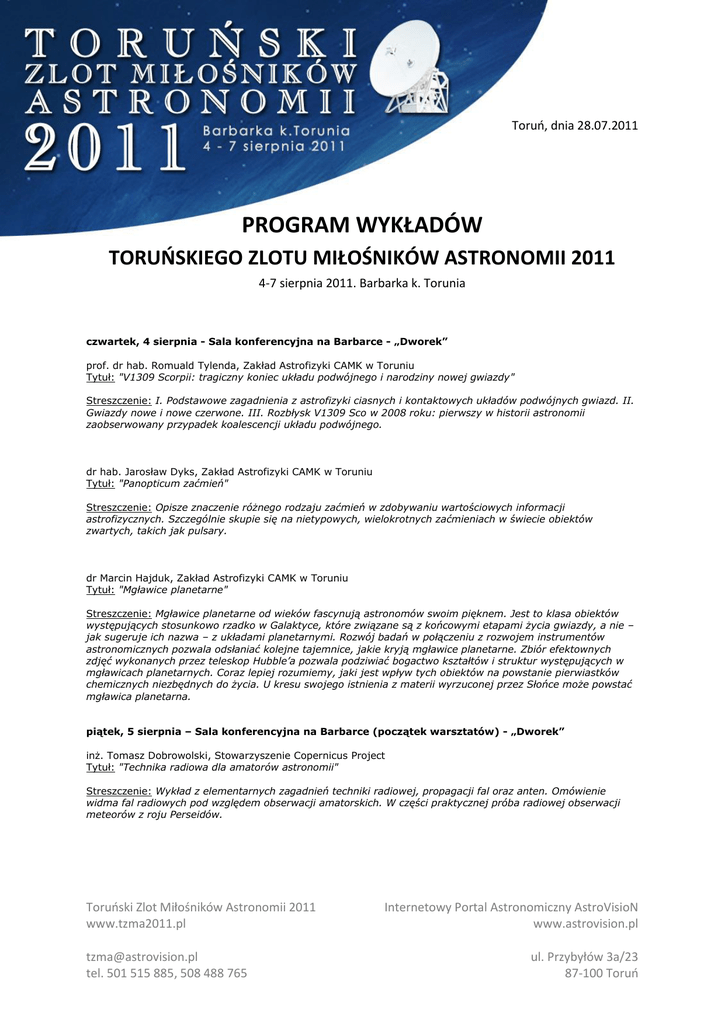 Toruo, dnia 28.07.2011 PROGRAM WYKŁADÓW TORUOSKIEGO ZLOTU MIŁOŚNIKÓW ASTRONOMII 2011 4-7 sierpnia 2011. Barbarka k. Torunia czwartek, 4 sierpnia - Sala konferencyjna na Barbarce - „Dworek” prof. dr hab. Romuald Tylenda, Zakład Astrofizyki CAMK w Toruniu Tytuł: "V1309 Scorpii: tragiczny koniec układu podwójnego i narodziny nowej gwiazdy" Streszczenie: I. Podstawowe zagadnienia z astrofizyki ciasnych i kontaktowych układów podwójnych gwiazd. II. Gwiazdy nowe i nowe czerwone. III. Rozbłysk V1309 Sco w 2008 roku: pierwszy w historii astronomii zaobserwowany przypadek koalescencji układu podwójnego. dr hab. Jarosław Dyks, Zakład Astrofizyki CAMK w Toruniu Tytuł: "Panopticum zaćmień" Streszczenie: Opisze znaczenie różnego rodzaju zaćmień w zdobywaniu wartościowych informacji astrofizycznych. Szczególnie skupie się na nietypowych, wielokrotnych zaćmieniach w świecie obiektów zwartych, takich jak pulsary. dr Marcin Hajduk, Zakład Astrofizyki CAMK w Toruniu Tytuł: "Mgławice planetarne" Streszczenie: Mgławice planetarne od wieków fascynują astronomów swoim pięknem. Jest to klasa obiektów występujących stosunkowo rzadko w Galaktyce, które związane są z końcowymi etapami życia gwiazdy, a nie – jak sugeruje ich nazwa – z układami planetarnymi. Rozwój badań w połączeniu z rozwojem instrumentów astronomicznych pozwala odsłaniać kolejne tajemnice, jakie kryją mgławice planetarne. Zbiór efektownych zdjęć wykonanych przez teleskop Hubble’a pozwala podziwiać bogactwo kształtów i struktur występujących w mgławicach planetarnych. Coraz lepiej rozumiemy, jaki jest wpływ tych obiektów na powstanie pierwiastków chemicznych niezbędnych do życia. U kresu swojego istnienia z materii wyrzuconej przez Słońce może powstać mgławica planetarna. piątek, 5 sierpnia – Sala konferencyjna na Barbarce (początek warsztatów) - „Dworek” inż. Tomasz Dobrowolski, Stowarzyszenie Copernicus Project Tytuł: "Technika radiowa dla amatorów astronomii" Streszczenie: Wykład z elementarnych zagadnień techniki radiowej, propagacji fal oraz anten. Omówienie widma fal radiowych pod względem obserwacji amatorskich. W części praktycznej próba radiowej obserwacji meteorów z roju Perseidów. Toruoski Zlot Miłośników Astronomii 2011 www.tzma2011.pl [email protected] tel. 501 515 885, 508 488 765 Internetowy Portal Astronomiczny AstroVisioN www.astrovision.pl ul. Przybyłów 3a/23 87-100 Toruo sobota, 6 sierpnia - Sala konferencyjna w Centrum Astronomii UMK w Piwnicach (Katedra Radioastronomii) dr Grzegorz Nowak, Centrum Astronomii UMK w Piwnicach Tytuł: "Podstawy spektroskopii gwiazdowej" Streszczenie: Najważniejsze informacje jakie uzyskaliśmy o gwiazdach zostały zdobyte dzięki analizie ich widm. W trakcie referatu przedstawiony zostanie zarys tego w jaki sposób rozwijała się spektroskopia gwiazdowa, jakie były jej najważniejsze osiągnięcia i jaką wiedzę dzięki nim osiągnęliśmy. Przedstawione zostaną również bazy danych z dostępnymi powszechnie widmami gwiazdowymi oraz strony z pakietami pozwalającymi tworzyć syntetyczne widma gwiazd. Mowa będzie również o amatorskich spektrografach, ich kosztach oraz nowych możliwościach jakie stwarzają. dr hab. Boudewijn Roukema, Centrum Astronomii UMK w Piwnicach Tytuł: "Kształt Wszechświata" Streszczenie: Jaki jest kształt Wszechświata? Według matematyki możliwych jest wiele różnych przestrzeni. Kosmolodzy uważali, że wszystkie przestrzenie są w pewnym sensie sobie równe i nie ma powodu, dla którego powinniśmy sądzić, że żyjemy w takiej a nie w innej przestrzeni. A może jednak niektóre przestrzenie są równiejsze od innych? Czy efekty grawitacyjne są takie same w każdej przestrzeni? A co obecnie obserwujemy przez teleskopy? dr hab. Andrzej Marecki, Centrum Astronomii UMK w Piwnicach Tytuł: "Pierwsze galaktyki" Streszczenie: W 1755 roku Immanuel Kant sugerował, że Wszechświat ma strukturę "wyspową", a tymi "wyspami" są galaktyki. Dziś wiemy na pewno, że Kant miał rację. Wiemy ponadto, iż Wszechświat miał początek. Kiedy zatem miały swój początek galaktyki? Wstępną odpowiedź na to pytanie właśnie otrzymujemy dzięki Kosmicznemu Teleskopowi Hubble'a, a bardziej wyczerpującej udzieli przyszły teleskop kosmiczny: James Webb Space Telescope. W tym wykładzie będzie mowa o tym, jak obserwuje się pierwsze galaktyki, jak one wyglądały i kiedy powstały. Toruoski Zlot Miłośników Astronomii 2011 www.tzma2011.pl [email protected] tel. 501 515 885, 508 488 765 Internetowy Portal Astronomiczny AstroVisioN www.astrovision.pl ul. Przybyłów 3a/23 87-100 Toruo
