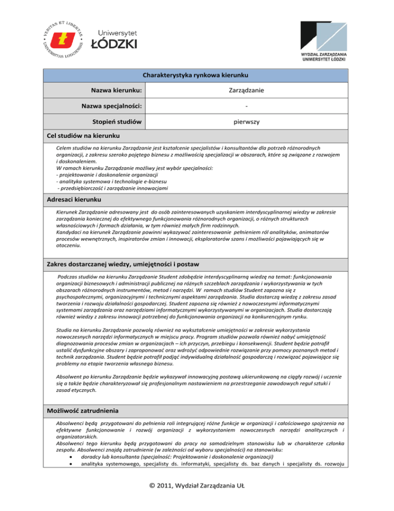 © 2011, Wydział Zarządzania UŁ Charakterystyka rynkowa kierunku
