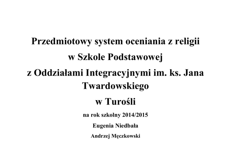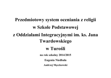 Przedmiotowy system oceniania z religii w Szkole Podstawowej z Oddziałami Integracyjnymi im. ks. Jana Twardowskiego w Turośli na rok szkolny 2014/2015 Eugenia Niedbała Andrzej Męczkowski Podstawa prawna do opracowania Przedmiotowego Systemu Oceniania: 1.Rozporządzenie MEN z 30 kwietnia 2007 roku w sprawie warunków i sposobu oceniania, klasyfikowania i promowania uczniów i słuchaczy oraz przeprowadzania sprawdzianów publicznych (Dz. U. Nr 83, póz. 562, Dz. U. Nr 130, póz 906, z 2008r. Nr 3 póz. 9) 2.Komisja Wychowania Katolickiego Konferencji Episkopatu Polski katolickiej w szkołach” (KWEP-C-464/08) z dn. 25 sierpnia 2008 roku. i egzaminów w szkołach „Zasady oceniania osiągnięć edukacyjnych z religii rzymsko- 3. Statut Szkoły. 4. Wewnątrzszkolny System Oceniania SP w Turośli 5. Podstawa programowa dla szkoły podstawowej – program nauczania religii rzymskokatolickiej dla klas I – III „Jesteśmy dziećmi Bożymi” Nr AZ-1-01/1; program nauczania religii rzymsko-katolickiej dla klas IV-VI „Wezwani przez Boga” Nr AZ-2-01/1. Cele katechetyczne wynikające z podstawy programowej Przedszkole W okresie dzieciństwa proces katechizacji będzie miał charakter wychowawczy, zwracający uwagę na rozwój tych wartości ludzkich, które stanowią podstawę antropologiczną życia wiary, jak zmysł ufności, darmowości, daru z siebie, prośby, radosnego uczestnictwa” (DOK 178). Cele te będą realizowane poprzez: 1. Zapoczątkowanie pierwszej socjalizacji umożliwiającej poznawanie oraz rozumienie siebie i świata w świetle Bożego objawienia; 2. Zapoczątkowanie inspirowanego wiarą wychowania ludzkiego i chrześcijańskiego w rodzinie, przedszkolu i Kościele (odkrywanie swojego miejsca w grupie rówieśniczej i we wspólnocie Kościoła); 3. Nabywanie umiejętności wyrażania w znakach własnej religijności; 4. Religijne wyjaśnianie zdobywanych doświadczeń; 5. Wprowadzanie w rzeczywistość niematerialną; 6. Odkrywanie Boga jako osoby; 7. Odkrywanie przydzielonego przez Boga miejsca w świecie; 8. Uczenie rozumienia istoty modlitwy; 9. Uczenie modlitwy; 10. Wprowadzanie w rozumienie podstawowych znaków i czynności liturgicznych; 11. Uczenie wykonywania podstawowych znaków religijnych; 12. Wprowadzanie do uczestnictwa w liturgii; 13. Wprowadzanie do procesów socjalizacji religijnych motywów postępowania; 14. Uświadamianie potrzeby rozwijania własnej dojrzałości; 15. Odkrywanie potrzeby stawania się odpowiedzialnym za innych; 16. Tworzenie opartego na wierze systemu wartości; 17. Poznawanie Bożego zamiaru, by ludzie wzajemnie sobie pomagali; 18. Rozwijanie umiejętności poznawania prawdy o sobie i innych ludziach; 19. Uświadamianie motywów, dla których wierzący przyznaje innym te same prawa, którymi sam się w życiu kieruje; 20. Rozpoznawanie w społeczności wierzących – Kościele znaku życia wiarą. I-III 1. Kształtowanie świadomości dziecięctwa Bożego rozpoczętego na chrzcie świętym; 2. Kształtowanie umiejętności odnajdywania śladów Boga w otaczającym świecie; 3. Budzenie zainteresowania życiem wiary i doświadczenia radości z wiary; 4. Poznanie podstawowych prawd wiary wpływających na kształtowanie postaw; 5. Wprowadzanie w historię zbawienia celem ukazania działania miłosiernego Boga w historii świata i ludzi; 6. Kształtowanie umiejętności włączenia się w świętowanie wiary ludu Bożego (liturgia, rok liturgiczny, polska tradycja okresów liturgicznych); 7. Formacja postawy zaufania jako podstawy nawrócenia i pokuty – fundamentów pełnego przeżycia sakramentu pojednania; 8. Uzdolnienie do pełnego i aktywnego uczestnictwa w Eucharystii; 9. Uczenie nawiązywania dialogu z Bogiem i udzielania odpowiedzi na Jego apel; 10. Wdrożenie do modlitwy dziękczynnej, chwalebnej, przebłagalnej, błagalnej, prywatnej i liturgicznej; 11. Poznanie wybranych wydarzeń z historii zbawienia urzeczywistniających się w życiu ucznia (dla kształtowania jego osobowości); 12. Zdolność kształtowania sumienia na podstawie przykazania miłości w Dekalogu i Ewangelii; 13. Zdolność szukania płaszczyzn szerzenia dobra i królestwa Bożego w swoim środowisku; 14. Kształtowanie osobowości (odpowiednio do wieku) na przykładzie wzoru święty; 15. Kształtowanie umiejętności nawiązywania kontaktów z rówieśnikami i dorosłymi; 16. Kształtowanie świadomości przynależenia do społeczności Kościoła; 17. Pogłębienie związku swojego życia z życiem Kościoła i odnajdywanie swojego miejsca w nim; 18. Świadczenie codziennym życiem o włączeniu się w misyjne dzieło Kościoła. Kl.IV-VI 1. Budzenie zainteresowania przesłaniem Bożym; 2. Uzdolnienie do odczytania w nauczaniu biblijnym wezwania Bożego dla swojego życia; 3. Przygotowanie do samodzielnego odbioru tekstów; 4. Ukazywanie wiary jako pomocy w zrozumieniu swego życia i świata; 5. Zdobycie umiejętności symbolizowania, czynnego, świadomego i radosnego włączenia się w liturgię Kościoła; 6. Pogłębione przeżywanie roku liturgicznego i sakramentów; 7. Interpretacja ludzkiego (ucznia) doświadczenia w świetle wezwania Bożego – kształtowanie sumienia; 8. Kształtowanie refleksyjnej postawy wobec różnych sytuacji życiowych i zobowiązań moralnych; 9. Pomoc w przygotowaniu do przemian okresu dojrzewania; 10. Gotowość otwarcia się na Boga w modlitwie; 11. Poczucie przynależności, posiadanie własnego miejsca i odczytywanie własnych zadań w społeczności Kościoła, narodzie, rodzinie, grupie szkolnej i koleżeńskiej; 12. Przyjęcie postawy motywującej do odpowiedzialnego uczestnictwa; 13. Kształtowanie postawy odpowiedzialności; 14. Odpowiedzialne podjęcie zadań w najbliższym otoczeniu; 15. Odnajdywanie własnego miejsca i zadań w życiu rodziny, szkoły, Kościoła i innych społecznościach. 16. Świadectwo życia; 17. Budowanie postawy świadectwa. 2.Program i podręczniki Program nauczania religii za