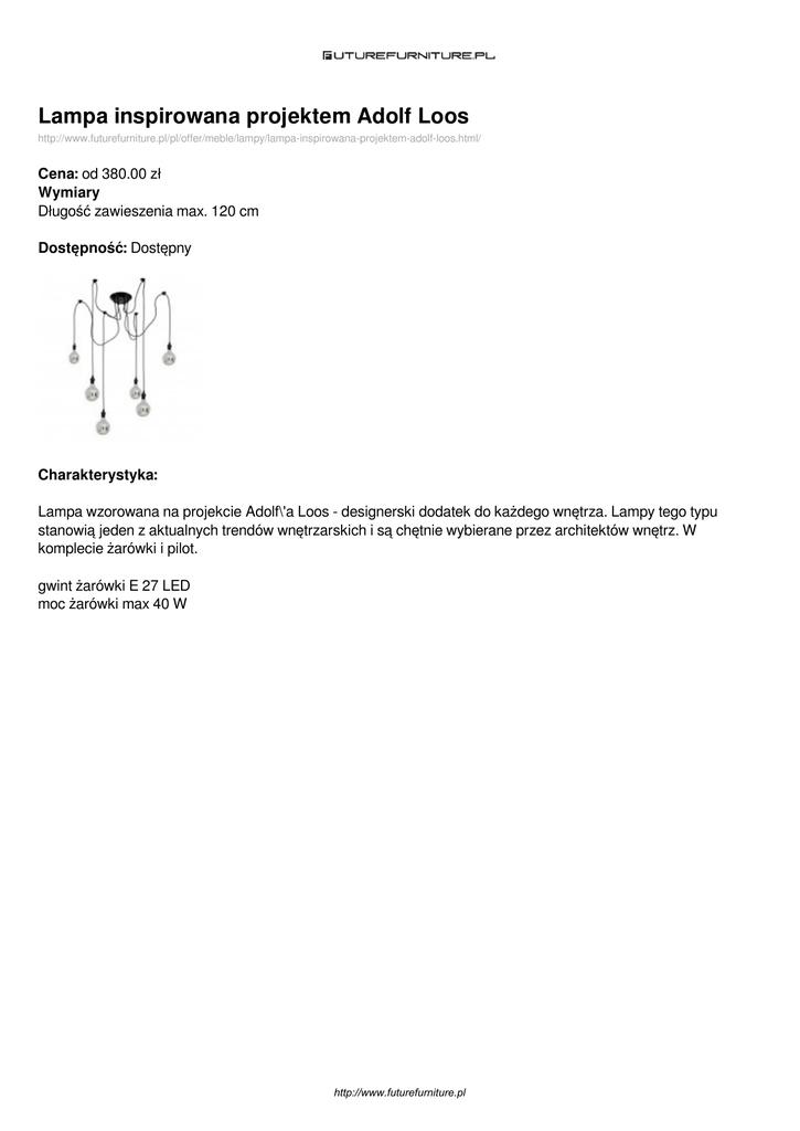 Lampa inspirowana projektem Adolf Loos http://www.futurefurniture.pl/pl/offer/meble/lampy/lampa-inspirowana-projektem-adolf-loos.html/ Cena: od 380.00 zł Wymiary Długość zawieszenia max. 120 cm Dostępność: Dostępny Charakterystyka: Lampa wzorowana na projekcie Adolf\'a Loos - designerski dodatek do każdego wnętrza. Lampy tego typu stanowią jeden z aktualnych trendów wnętrzarskich i są chętnie wybierane przez architektów wnętrz. W komplecie żarówki i pilot. gwint żarówki E 27 LED moc żarówki max 40 W http://www.futurefurniture.pl Dostępne wersje produktu: nazwa produktu warianty Lampa inspirowana 6 żarówek projektem Adolf Loos Lampa inspirowana 10 żarówek projektem Adolf Loos cena 380.00zł dostępne Dostępny 920.00zł Dostępny http://www.futurefurniture.pl Zdjęcia produktu: http://www.futurefurniture.pl Powered by TCPDF (www.tcpdf.org)