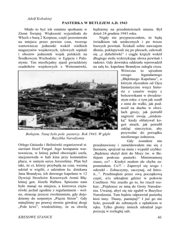 Adolf Kołodziej PASTERKA W BETLEJEM A.D. 1943 Miało to być ich ostatnie spotkanie w Ziemi Świętej. Większość wyjeżdżała do Włoch z bazą 2 Korpusu, część pozostawała na miejscu przez pewien czas, tworząc wartownicze jednostki wokół wielkich magazynów wojskowych, tyłowych szpitali i obozów jednostek wojsk polskich na Środkowym Wschodzie: w Egipcie i Palestynie. Ten nieoficjalny zjazd gwiaździsty osadników wojskowych z Weteranówki, będziemy na przedmieściach miasta. Był dzień 24 grudnia 1943 roku. Nigdy nie przypuszczałem, że będę świadkiem tak serdecznych i po trosze łzawych powitań. Ściskali sobie nawzajem dłonie, poklepywali się po plecach, całowali się „z dubeltówki” i ciągle krążyli wokół długiego stołu wykrzykując słowa powitań i radości. Gdy dowódca oddziału wprowadził na salę ks. kapelana Brandysa zaległa cisza. Wówczas to ujrzałem owego legendarnego „Błękitnego Kapelana”, o którym słyszałem od Ojca fantastyczne wręcz historie z czasów wojny z bolszewikami w dwudziestym roku: o tym jak szedł z nimi do walki, jak podnosił na duchu w chwilach grozy, jak potrafił zagrozić swoją „siódemką” kiedy oblatywał kogoś strach, jak potrafił zakląć siarczyście, aby przywołać do porządku Betlejem. Tutaj było pole pasterzy. Rok 1943. W głębi niesfornego żołnierza. Bazylika Narodzenia Gdy zostałem mu Orlego Gniazda i Belinówki organizował st. przedstawiony i zameldowałem mu się z sierżant Józef Furgał. Jego kompania warfasonem, spojrzał na mnie i wypalił szybko: townicza, w której pełnił obowiązki szefa, „Będziesz służył dziś do Mszy św. w Bestacjonowała w hali kina przy komendzie tlejem podczas pasterki. Ministranturę placu, w samym sercu Jerozolimy. Plan był znasz, co? - Kiedyś znałem ale chyba zataki, że ci, którzy przybędą na czas, wezmą pomniałem. Co?! - Zaperzył się srogo i udział w wigilii, z udziałem ks. dziekana odrzekł - Zobaczymy, zaczynaj, od IntroJana Brandysa, ich dawnego kapelana w 12 it...”. Przebrnąłem przez ową początkową Dywizji Strzelców Kresowych Armii Błęczęść, a1e utknąłem gdzieś w połowie kitnej gen. Józefa Hallera. Spieszno nam Confiteor. Nie zraziło go to, bo rzucił rozbyło stanąć na miejscu, a kierowca ciężakaz: „Pójdziesz ze mną do Groty Narodzerówki jechał zgodnie z regulaminem - wolnia. Uważaj, abyś się nie zgubił w Bazylice no, strasząc jeszcze zwolnieniem, gdy dojeNarodzenia. Tam będzie odprawiał pasterkę dziemy do serpentyn „Pięciu Sióstr”. Gdy ktoś inny. Tłumy, pamiętaj!” I już go nie minęliśmy po prawej stronie górskiej drogi było, poszedł do zebranych z opłatkiem w „Pole krwi”, wiedzieliśmy, że za chwilę ręku. Tylko głośny śmiech zdradzał jego pozycję w rozległej sali. KRESOWE STANICE 41 Grota Narodzenia Chrystusa. Fot. z 43 r. Przed sobą miałem sierżanta Andrzeja Jarzębskiego z opłatkiem w dłoni i z uśmiechem na twarzy. Wigilia wydłużyła się niezmiernie. Z radością przyjąłem rozkaz wyjścia z sali i ładowania się do ciężarówek. Była ciemna noc, której ponurość pogłębiały ciemne i obce ulice świętego miasta. W Betlejem zatrzymaliśmy się na rozległym placu przed Bazyliką Narodzenia, wzniesioną w IV wieku przez cesarza Konstantyna na gruzach pogańskiej świątyni Adonisa. Wyskakiwaliśmy z ciężarówek i maszerowaliśmy za księdzem dziekanem. Głos w ciemności przynaglał by się pośpieszyć, aby zająć miejsca na przedzie. Ktoś inny, idący z przodu, ostrzegał: „Uważać na głowy, uważać na głowy, niskie wejście.” Powodem były niskie drzwi wstawione w miejsce dawnych szerokich i wysokich, aby uniemożliwić muzułmanom wjeżdżanie do świątyni na koniach, co działo się wieki 42 temu. Weszliśmy do wnętrza przybytku. Maszerując środkiem długiej nawy osiągnęliśmy ołtarz i po schodach w górę, później w dół, znaleźliśmy się w Grocie Narodzenia Pana Jezusa. Światła oślepiały nas początkowo, ale potem wzrok się z nimi oswoił: przed sobą mieliśmy grotę ze sczerniałym sklepieniem. Na lewo stał ołtarz, poniżej, w kręgu świateł, dużych rozmiarów gwiazda w marmurowej podłodze, znacząca miejsce, gdzie prawie dwa tysiące lat temu stał żłobek. Obok głównego wejścia rzucała się w oczy mozaika przedstawiająca Trzech Króli. W czasie najazdu Persów obraz ten uratował się przed dewastacją tylko dzięki i temu, że jeden z Królów był w stroju perskim. Było duszno. Zimowe płaszcze okazały się za ciepłe. Żołnierska masa gęstniała z każdą minutą, przelewając się w bocznej Grocie Mlecznej. Ktoś zaintonował kolędę „Wśród nocnej ciszy”, próbowałem przebić się do przodu, aby zgodnie z umowę służyć do Mszy św. Widziałem ks. Brandysa jak rozglądał się za mną. Gdy zobaczył, że jestem zaklinowany w tłumnie dał ręką znak by puszczono mnie do przodu. Ponaglany jego oczyma dotarłem wreszcie i zająłem miejsce po jego prawej stronie. Coś mówił szeptem, ale nie dosłyszałem. Zaczęła się Msza św. pasterska. Zbita masa zielonych mundurów śpiewała „Przybieżeli do Betlejem pasterze”, potem inne kolędy, kończąc piękną „Bóg się rodzi moc truchleje”. Tu i tam widziałem płaczących. Później szedł korowód braci żołnierskiej do owej Gwiazdy kładąc na niej medaliki, krzyże jerozolimskie, różańce i inne dewocjonalia, ufając, że sam fakt złożenia ich w tym miejscu, czyni je poświęconymi. Gdy znalazło się miejsce zginano kolano, czyniono znak krzyża robiąc pośpiesznie miejsce dla innych. Ze sczerniałego sklepienia groty kapały wolno krople wody pochodzącej z oddechów polskich żołnierzy, którzy tutaj składali swe troski przed narodzonym z Maryi Synem Bożym. KRESOWE STANICE