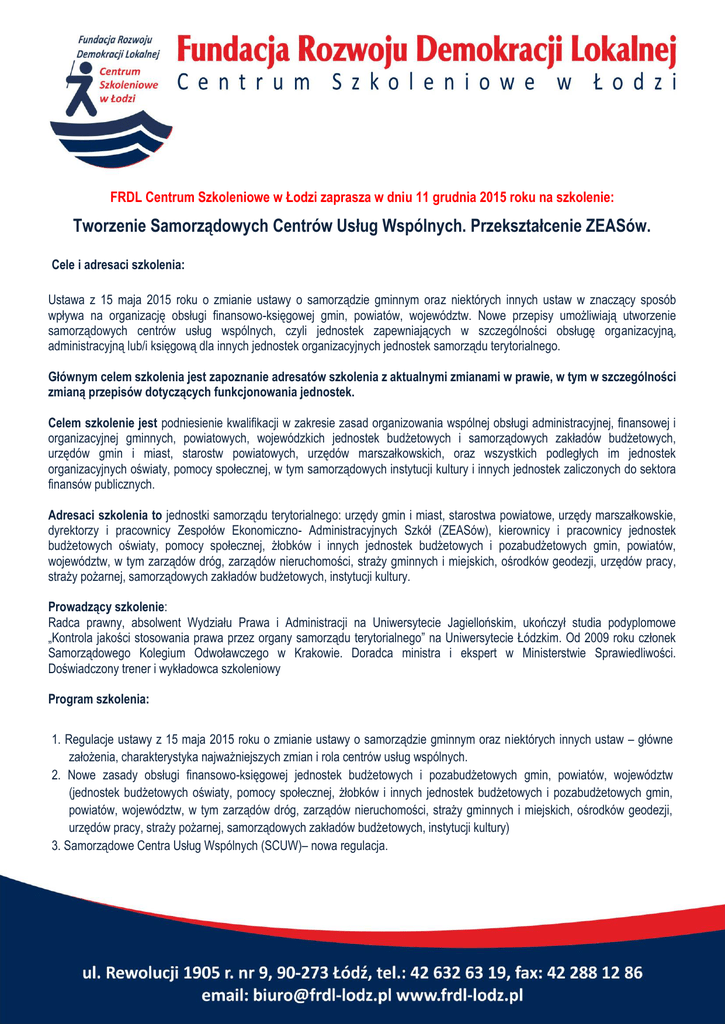 FRDL Centrum Szkoleniowe w Łodzi zaprasza w dniu 11 grudnia 2015 roku na szkolenie: Tworzenie Samorządowych Centrów Usług Wspólnych. Przekształcenie ZEASów. Cele i adresaci szkolenia: Ustawa z 15 maja 2015 roku o zmianie ustawy o samorządzie gminnym oraz niektórych innych ustaw w znaczący sposób wpływa na organizację obsługi finansowo-księgowej gmin, powiatów, województw. Nowe przepisy umożliwiają utworzenie samorządowych centrów usług wspólnych, czyli jednostek zapewniających w szczególności obsługę organizacyjną, administracyjną lub/i księgową dla innych jednostek organizacyjnych jednostek samorządu terytorialnego. Głównym celem szkolenia jest zapoznanie adresatów szkolenia z aktualnymi zmianami w prawie, w tym w szczególności zmianą przepisów dotyczących funkcjonowania jednostek. Celem szkolenie jest podniesienie kwalifikacji w zakresie zasad organizowania wspólnej obsługi administracyjnej, finansowej i organizacyjnej gminnych, powiatowych, wojewódzkich jednostek budżetowych i samorządowych zakładów budżetowych, urzędów gmin i miast, starostw powiatowych, urzędów marszałkowskich, oraz wszystkich podległych im jednostek organizacyjnych oświaty, pomocy społecznej, w tym samorządowych instytucji kultury i innych jednostek zaliczonych do sektora finansów publicznych. Adresaci szkolenia to jednostki samorządu terytorialnego: urzędy gmin i miast, starostwa powiatowe, urzędy marszałkowskie, dyrektorzy i pracownicy Zespołów Ekonomiczno- Administracyjnych Szkół (ZEASów), kierownicy i pracownicy jednostek budżetowych oświaty, pomocy społecznej, żłobków i innych jednostek budżetowych i pozabudżetowych gmin, powiatów, województw, w tym zarządów dróg, zarządów nieruchomości, straży gminnych i miejskich, ośrodków geodezji, urzędów pracy, straży pożarnej, samorządowych zakładów budżetowych, instytucji kultury. Prowadzący szkolenie: Radca prawny, absolwent Wydziału Prawa i Administracji na Uniwersytecie Jagiellońskim, ukończył studia podyplomowe „Kontrola jakości stosowania prawa przez organy samorządu terytorialnego” na Uniwersytecie Łódzkim. Od 2009 roku członek Samorządowego Kolegium Odwoławczego w Krakowie. Doradca ministra i ekspert w Ministerstwie Sprawiedliwości. Doświadczony trener i wykładowca szkoleniowy Program szkolenia: 1. Regulacje ustawy z 15 maja 2015 roku o zmianie ustawy o samorządzie gminnym oraz niektórych innych ustaw – główne założenia, charakterystyka najważniejszych zmian i rola centrów usług wspólnych. 2. Nowe zasady obsługi finansowo-księgowej jednostek budżetowych i pozabudżetowych gmin, powiatów, województw (jednostek budżetowych oświaty, pomocy społecznej, żłobków i innych jednostek budżetowych i pozabudżetowych gmin, powiatów, województw, w tym zarządów dróg, zarządów nieruchomości, straży gminnych i miejskich, ośrodków geodezji, urzędów pracy, straży pożarnej, samorządowych zakładów budżetowych, instytucji kultury) 3. Samorządowe Centra Usług Wspólnych (SCUW)– nowa regulacja. ul. Rewolucji 1905 r. nr 9, 90-273 Łódź, tel.: 42 632 63 19, fax: 42 288 12 86 email: [email protected] www.frdl-lodz.pl 3. Podział kompetencji pomiędzy kierownika SCUW oraz kierownika jednostek obsługiwanych. 4. Powierzanie obowiązków w zakresie rachunkowości i sprawozdawczości do SCUW. 5. Przepisy przejściowe dt. ZEAS-ów – praktyczne propozycje przekształceń. Likwidacja z mocy prawa dotychczas funkcjonujących ZEAS, biur obsługi oświaty, łączenie placówek wsparcia dziennego, domów pomocy społecznej z jednostkami pomocy społecznej, likwidacja centrów administracyjnych do obsługi placówek opiekuńczo-wychowawczych, nowe zasady obsługi finansowej żłobków, klubów dziecięcych i ich zespołów. 6. Pytania i odpowiedzi. Dyskusja. ul. Rewolucji 1905 r. nr 9, 90-273 Łódź, tel.: 42 632 63 19, fax: 42 288 12 86 email: [email protected] www.frdl-lodz.pl Informacje organizacyjne i warunki zgłoszeń: Szkolenie odbędzie się w siedzibie FRDL Centrum Szkoleniowego w Łodzi, ul. Rewolucji 1905 roku nr 9, II PIĘTRO (DOMOFON NR 36) 11 grudnia 2015 r. w godzinach 10.00 – 15.00. Cena szkolenia wynosi 319 zł netto do dnia 1 grudnia, po 1 grudnia 359,00 netto. RABAT 10% dla drugiej i następnej osoby z tej samej instytucji. Zwolnione z VAT w przypadku finansowania ze środków publicznych. W cenie szkolenia materiały szkoleniowe, zaświadczenie, lunch oraz przerwy kawowe. Płatność przelewem na podstawie wystawionej faktury w dniu szkolenia. Prosimy o przesyłanie zgłoszeń do 7 grudnia. na adres mailowy [email protected] wysyłając uzupełnioną kartę zgłoszenia faksem na numer wysyłając uzupełnioną kartę zgłoszenia 42 / 288 12 86 przez formularz elektroniczny zamieszczony na www.frdl-lodz.pl Szkolenia realizujemy również w formie zamkniętej na terenie instytucji. Zapytania prosimy kierować na adres mailowy [email protected] Zgłoszenie na szkolenie nt. Tworzenie Samorządowych Centrów Usług Wspólnych. Przekształcenie ZEASów.. w dniu 11 grudnia 2015 r. Instytucja (dane do faktury) ……………………………………………………………………………………………………………………………………………………………….. Adres: ....................................................................................................................................................... Tel: ...................................................................................................................... NIP: ..................................................................................... E-mail: ....................................................................................................................... Osoby delegowane do udziału w szkoleniu (prosimy o podanie imienia i nazwiska oraz stanowiska uczestnika szkolenia): 1. .......................