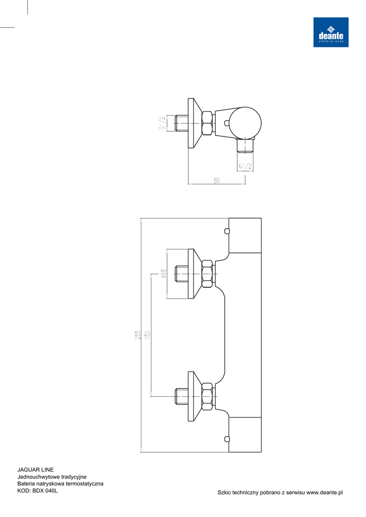 JAGUAR LINE Jednouchwytowe tradycyjne Bateria natryskowa termostatyczna KOD: BDX 040L Szkic techniczny pobrano z serwisu www.deante.pl
