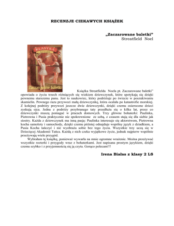 RECENZJE CIEKAWYCH KSIĄŻEK „Zaczarowane baletki” Streatfield Noel Książka Streatfielda Noela pt. Zaczarowane baletki” opowiada o życiu trzech różniących się wiekiem dziewczynek, które spotykają się dzięki pewnemu starszemu panu. Jest to naukowiec, który podróżuje po świecie w poszukiwaniu skamielin. Pewnego razu przywozi małą dziewczynkę, która ocalała po katastrofie morskiej. Z kolejnej podróży przywozi jeszcze dwie dziewczynki, dzięki czemu osierocone dzieci zyskują ojca. Jedna z podróży przybranego taty przedłuża się o kilka lat, przez co dziewczynki muszą pomagać w pracach domowych. Trzy główne bohaterki: Paulinka, Pietrowna i Pusia praktycznie nie spokrewnione ze sobą, z czasem stają się dla siebie jak siostry. Każda z dziewczynek ma inną pasję: Paulinka interesuje się aktorstwem, Pietrowna kocha samoloty i samochody, dzięki czemu później odnajduje wspólny język z dziadkiem, a Pusia Kocha tańczyć i nie wyobraża sobie bez tego życia. Wszystkie trzy uczą się w Dziecięcej Akademii Tańca. Każdą z nich czeka wyjątkowe życie, jednak najpierw wspólnie przeżywają wiele przygód. Wybrałam tę książkę, ponieważ wywarła na mnie ogromne wrażenie. Można przeżywać wszystkie rozterki i przygody wraz z bohaterkami. Jest napisana prostym językiem, dzięki czemu szybko i z przyjemnością się ją czyta. Gorąco polecam!!! Irena Białas z klasy 2 LS