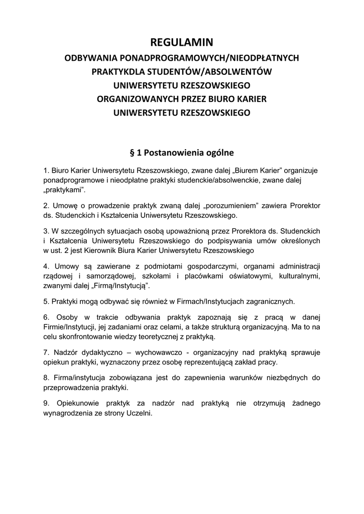 REGULAMIN ODBYWANIA PONADPROGRAMOWYCH/NIEODPŁATNYCH PRAKTYKDLA STUDENTÓW/ABSOLWENTÓW UNIWERSYTETU RZESZOWSKIEGO ORGANIZOWANYCH PRZEZ BIURO KARIER UNIWERSYTETU RZESZOWSKIEGO § 1 Postanowienia ogólne 1. Biuro Karier Uniwersytetu Rzeszowskiego, zwane dalej „Biurem Karier” organizuje ponadprogramowe i nieodpłatne praktyki studenckie/absolwenckie, zwane dalej „praktykami”. 2. Umowę o prowadzenie praktyk zwaną dalej „porozumieniem” zawiera Prorektor ds. Studenckich i Kształcenia Uniwersytetu Rzeszowskiego. 3. W szczególnych sytuacjach osobą upoważnioną przez Prorektora ds. Studenckich i Kształcenia Uniwersytetu Rzeszowskiego do podpisywania umów określonych w ust. 2 jest Kierownik Biura Karier Uniwersytetu Rzeszowskiego 4. Umowy są zawierane z podmiotami gospodarczymi, organami administracji rządowej i samorządowej, szkołami i placówkami oświatowymi, kulturalnymi, zwanymi dalej „Firmą/Instytucją”. 5. Praktyki mogą odbywać się również w Firmach/Instytucjach zagranicznych. 6. Osoby w trakcie odbywania praktyk zapoznają się z pracą w danej Firmie/Instytucji, jej zadaniami oraz celami, a także strukturą organizacyjną. Ma to na celu skonfrontowanie wiedzy teoretycznej z praktyką. 7. Nadzór dydaktyczno – wychowawczo - organizacyjny nad praktyką sprawuje opiekun praktyki, wyznaczony przez osobę reprezentującą zakład pracy. 8. Firma/instytucja zobowiązana jest do zapewnienia warunków niezbędnych do przeprowadzenia praktyki. 9. Opiekunowie praktyk za nadzór nad praktyką nie otrzymują żadnego wynagrodzenia ze strony Uczelni. § 2 Organizacja i przebieg praktyk 1. Praktyki mogą się odbywać w ciągu całego roku kalendarzowego, a czas ich trwania nie może być krótszy niż 1 miesiąc, a minimalna liczba godzin nie może być mniejsza niż 60 h. 2. Ilość ponadprogramowych/ bezpłatnych praktyk jest nieograniczona. 3. Praktyki się nieodpłatne. Nie są pokrywane koszty przejazdów praktykantów do i z miejsca ich odbywania, utrzymania i zakwaterowania oraz ubezpieczenia chorobowego i od następstw nieszczęśliwych wypadków. 4. Praktykant samodzielnie znajduje i wskazuje Firmę/Instytucję, która wyrazi gotowość jego przyjęcia na praktykę. 5. Praktykant podlega opiekunowi praktyk wyznaczonemu przez osobę reprezentującą zakład pracy. Opiekun zapewnia studentowi odpowiednie miejsce pracy oraz zaznajamia go z obowiązującymi przepisami. 6. Osoby zainteresowane odbyciem praktyki zobowiązane są do zgłoszenia planowanej praktyki w Biurze Karier na co najmniej 14 dni przed jej rozpoczęciem poprzez osobiste złożenie w Biurze Karier następujących dokumentów: a) formularz wypełniony przez pracodawcę, stanowiący załącznik nr 1 niniejszego Regulaminu (dostępny także na stronie internetowej lub bezpośrednio w Biurze Karier), b) ksero legitymacji studenckiej lub dyplomu ukończenia studiów, c) oryginał dowodu ubezpieczenia NNW (od następstw nieszczęśliwych wypadków) obejmującego okres trwania praktyki. Dowodem poświadczającym fakt ubezpieczenia jest w szczególności zaświadczenie z uczelni, polisa towarzystwa ubezpieczeniowego, Karta Euro 26, ISIC. d) oświadczenie potwierdzające zapoznanie się praktykanta z Regulaminem praktyk według wzoru zawartego w załączniku nr 4 do niniejszego Regulaminu. 7. Dokumenty, o których mowa w ust. 6 mogą zostać przesłane drogą elektroniczną. W takiej sytuacji oryginały należy przedłożyć najpóźniej w dniu odebrania podpisanego porozumienia o rozpoczęciu praktyki. 8. Niedotrzymanie terminu o którym mowa w ust.6 oraz dostarczenie niekompletnej lub niepoprawnie wypełnionej dokumentacji skutkuje odmową jej przyjęcia. 9. O terminie podpisania i odebrania porozumienia, o którym mowa w §1 ust. 2 kandydat jest informowany telefonicznie lub drogą elektroniczną. 10. Student/Absolwent odbiera w Biurze Karier podpisane przez Prorektora ds. Studenckich i Kształcenia porozumienie w trzech jednobrzmiących egzemplarzach,po jednym dla każdej ze stron i dostarcza je Firmie/Instytucji w celu ich podpisania. 11. Firma/instytucja potwierdza odbycie praktyk poprzez wystawienie Zaświadczenia o ukończeniu praktyki, stanowiącego załącznik nr 5 do niniejszego Rozporządzenia. 12. Zaświadczenie, o którym mowa w §2 ust. 10 musi zostać doręczone wraz z Porozumieniem, o którym mowa w §1 ust.2 podpisanym przez pracodawcę oraz osobę odbywającą praktykę w ciągu 7 dni roboczych od dnia zakończenia praktyki. 13. Po zakończeniu praktyki Student/Absolwent wypełnia w Biurze Karier krótką, anonimową ankietę ewaluacyjną dotyczącą przebiegu i oceny praktyki. § 3 Prawa i obowiązki stron porozumienia w związku z odbywaniem praktyk 1. Student/Absolwent zobowiązuje się do: a) zapoznania się z Regulaminem ponadprogramowych praktyk studenckich/absolwenckich, b) ubezpieczenia na czas trwania praktyki, jeśli takowego nie posiada, c) zrealizowania wymaganego minimalnego wymiaru czasowego odbywania praktyki określonego w § 2 ust. 1. d) sumiennego realizowania ustalonego programu praktyki, respektując jednocześnie zasady obowiązujące w Firmie/Instytucji, w której Student/Absolwent odbywa praktyki jak również przestrzegania dyscypliny oraz regulaminu pracy, e) pokrycia kosztów transportu z miejsca stałego zamieszkania lub siedziby uczelni do miejsca odbywania praktyki, f) godnego reprezentowania Uczelni w Firmie/Instytucji, w której jest odbywana praktyka, g) poinformowania Biura Karier Uniwersytetu Rzeszowskiego o podjęciu zatrudnienia po zakończeniu ponadprogramowej praktyki studenckiej/absolwenckiej. 2. Firma/Instytucja zobowiązuje się do zapewnienia warunków niezbędnych do przeprowadzenia praktyki, a w szczególności: a) ustalenia w porozumieniu ze studentem/absolwentem, zadowalającego obie strony programu praktyki, b) wyznaczenia zakładowego opiekuna praktyk, c) zapoznania studenta/absolwenta z zakładowym regulaminem pracy, przepisami o be