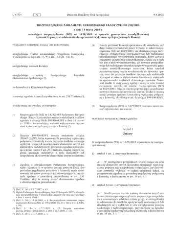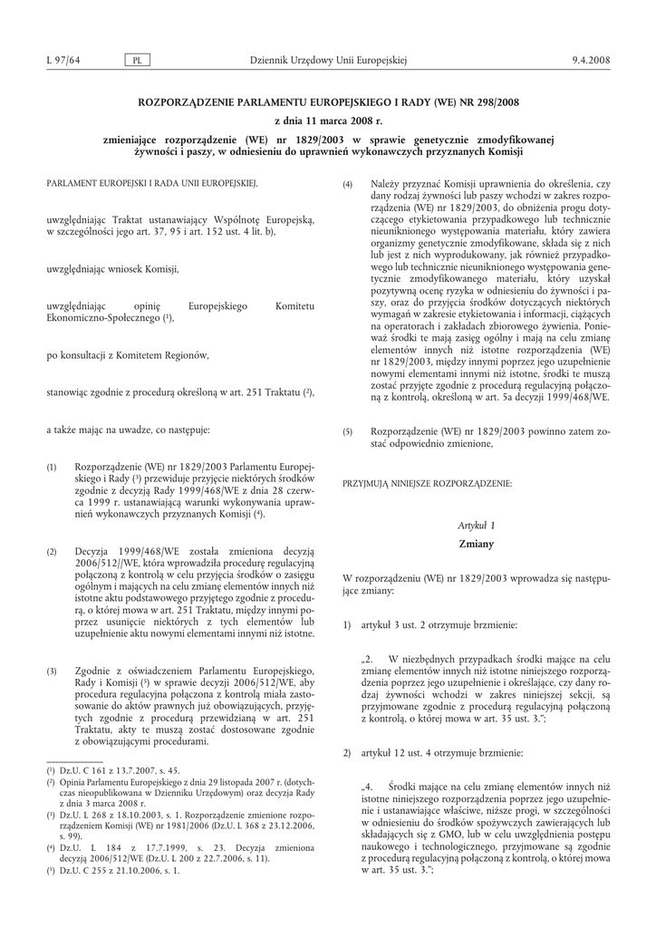 L 97/64 Dziennik Urzędowy Unii Europejskiej PL 9.4.2008 ROZPORZĄDZENIE PARLAMENTU EUROPEJSKIEGO I RADY (WE) NR 298/2008 z dnia 11 marca 2008 r. zmieniające rozporządzenie (WE) nr 1829/2003 w sprawie genetycznie zmodyfikowanej żywności i paszy, w odniesieniu do uprawnień wykonawczych przyznanych Komisji PARLAMENT EUROPEJSKI I RADA UNII EUROPEJSKIEJ, (4) Należy przyznać Komisji uprawnienia do określenia, czy dany rodzaj żywności lub paszy wchodzi w zakres rozporządzenia (WE) nr 1829/2003, do obniżenia progu dotyczącego etykietowania przypadkowego lub technicznie nieuniknionego występowania materiału, który zawiera organizmy genetycznie zmodyfikowane, składa się z nich lub jest z nich wyprodukowany, jak również przypadkowego lub technicznie nieuniknionego występowania genetycznie zmodyfikowanego materiału, który uzyskał pozytywną ocenę ryzyka w odniesieniu do żywności i paszy, oraz do przyjęcia środków dotyczących niektórych wymagań w zakresie etykietowania i informacji, ciążących na operatorach i zakładach zbiorowego żywienia. Ponieważ środki te mają zasięg ogólny i mają na celu zmianę elementów innych niż istotne rozporządzenia (WE) nr 1829/2003, między innymi poprzez jego uzupełnienie nowymi elementami innymi niż istotne, środki te muszą zostać przyjęte zgodnie z procedurą regulacyjną połączoną z kontrolą, określoną w art. 5a decyzji 1999/468/WE. (5) Rozporządzenie (WE) nr 1829/2003 powinno zatem zostać odpowiednio zmienione, uwzględniając Traktat ustanawiający Wspólnotę Europejską, w szczególności jego art. 37, 95 i art. 152 ust. 4 lit. b), uwzględniając wniosek Komisji, uwzględniając opinię Ekonomiczno-Społecznego (1), Europejskiego Komitetu po konsultacji z Komitetem Regionów, stanowiąc zgodnie z procedurą określoną w art. 251 Traktatu (2), a także mając na uwadze, co następuje: (1) Rozporządzenie (WE) nr 1829/2003 Parlamentu Europejskiego i Rady (3) przewiduje przyjęcie niektórych środków zgodnie z decyzją Rady 1999/468/WE z dnia 28 czerwca 1999 r. ustanawiającą warunki wykonywania uprawnień wykonawczych przyznanych Komisji (4). PRZYJMUJĄ NINIEJSZE ROZPORZĄDZENIE: Artykuł 1 (2) (3) Decyzja 1999/468/WE została zmieniona decyzją 2006/512//WE, która wprowadziła procedurę regulacyjną połączoną z kontrolą w celu przyjęcia środków o zasięgu ogólnym i mających na celu zmianę elementów innych niż istotne aktu podstawowego przyjętego zgodnie z procedurą, o której mowa w art. 251 Traktatu, między innymi poprzez usunięcie niektórych z tych elementów lub uzupełnienie aktu nowymi elementami innymi niż istotne. Zgodnie z oświadczeniem Parlamentu Europejskiego, Rady i Komisji (5) w sprawie decyzji 2006/512/WE, aby procedura regulacyjna połączona z kontrolą miała zastosowanie do aktów prawnych już obowiązujących, przyjętych zgodnie z procedurą przewidzianą w art. 251 Traktatu, akty te muszą zostać dostosowane zgodnie z obowiązującymi procedurami. Zmiany W rozporządzeniu (WE) nr 1829/2003 wprowadza się następujące zmiany: 1) artykuł 3 ust. 2 otrzymuje brzmienie: „2. W niezbędnych przypadkach środki mające na celu zmianę elementów innych niż istotne niniejszego rozporządzenia poprzez jego uzupełnienie i określające, czy dany rodzaj żywności wchodzi w zakres niniejszej sekcji, są przyjmowane zgodnie z procedurą regulacyjną połączoną z kontrolą, o której mowa w art. 35 ust. 3.”; 2) artykuł 12 ust. 4 otrzymuje brzmienie: (1) Dz.U. C 161 z 13.7.2007, s. 45. (2) Opinia Parlamentu Europejskiego z dnia 29 listopada 2007 r. (dotychczas nieopublikowana w Dzienniku Urzędowym) oraz decyzja Rady z dnia 3 marca 2008 r. (3) Dz.U. L 268 z 18.10.2003, s. 1. Rozporządzenie zmienione rozporządzeniem Komisji (WE) nr 1981/2006 (Dz.U. L 368 z 23.12.2006, s. 99). (4) Dz.U. L 184 z 17.7.1999, s. 23. Decyzja zmieniona decyzją 2006/512/WE (Dz.U. L 200 z 22.7.2006, s. 11). (5) Dz.U. C 255 z 21.10.2006, s. 1. „4. Środki mające na celu zmianę elementów innych niż istotne niniejszego rozporządzenia poprzez jego uzupełnienie i ustanawiające właściwe, niższe progi, w szczególności w odniesieniu do środków spożywczych zawierających lub składających się z GMO, lub w celu uwzględnienia postępu naukowego i technologicznego, przyjmowane są zgodnie z procedurą regulacyjną połączoną z kontrolą, o której mowa w art. 35 ust. 3.”; 9.4.2008 PL Dziennik Urzędowy Unii Europejskiej 3) artykuł 14 otrzymuje brzmienie: 6) artykuł 26 otrzymuje brzmienie: „Artykuł 14 „Artykuł 26 Środki wykonawcze Środki wykonawcze 1. Komisja może przyjąć następujące środki: — środki niezbędne operatorom do spełnienia wymogów właściwych organów określonych w art. 12 ust. 3, — środki niezbędne operatorom do spełnienia wymogów etykietowania przewidzianych w art. 13, — szczególne przepisy dotyczące informacji podawanych przez zakłady zbiorowego żywienia dostarczające posiłki konsumentom końcowym. W celu uwzględnienia szczególnej sytuacji zakładów zbiorowego żywienia zasady te mogą obejmować dostosowanie wymogów art. 13 ust. 1 lit. e). Środki te, mające na celu zmianę elementów innych niż istotne niniejszego rozporządzenia, między innymi poprzez jego uzupełnienie, są przyjmowane zgodnie z procedurą regulacyjną połączoną z kontrolą, o której mowa w art. 35 ust. 3. 2. Ponadto zgodnie z procedurą regulacyjną, o której mowa w art. 35 ust. 2, mogą zostać uchwalone szczegółowe przepisy mające na celu ułatwienie jednolitego stosowania art. 13.”; 4) artykuł 15 ust. 2 otrzymuje brzmienie: „2. W niezbędnych przypadkach środki mające na celu zmianę elementów innych niż istotne niniejszego rozporządzenia poprzez jego uzupełnienie i określające, czy dany rodzaj paszy wchodzi w zakres niniejszej sekcji, przyjmowane są zgodnie z procedurą regulacyjną połączoną z kontrolą, o której
