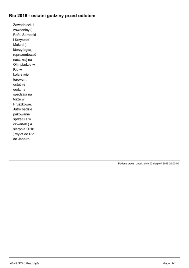 Rio 2016 - ostatni godziny przed odlotem Zawodniczki i zawodnicy ( Rafał Sarnecki i Krzysztof Maksel ), którzy będą reprezentować nasz kraj na Olimpiadzie w Rio w kolarstwie torowym, ostatnie godziny spędzają na torze w Pruszkowie. Jutro będzie pakowanie sprzętu a w czwartek ( 4 sierpnia 2016 ) wylot do Rio de Janeiro. Dodane przez : Jacek, dnia 02 sierpień 2016 20:00:00 ALKS STAL Grudziądz Page: 1/1