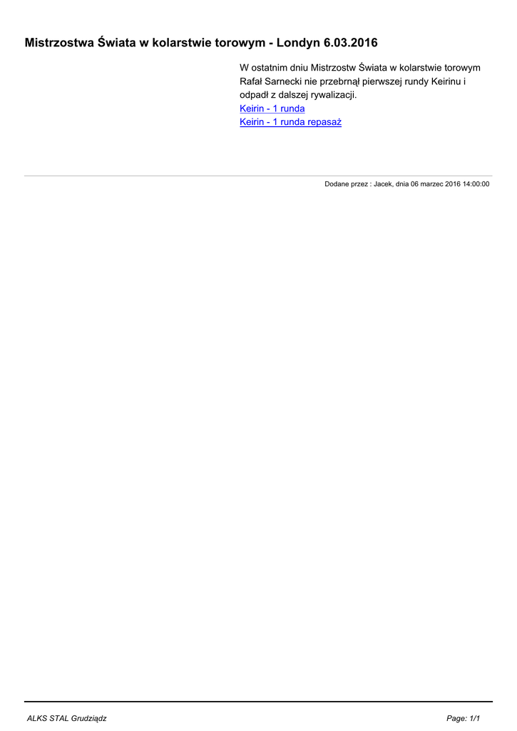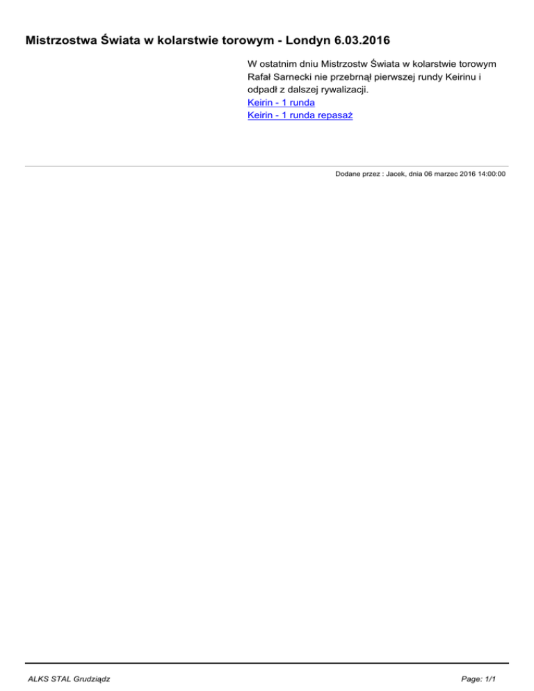 Mistrzostwa Świata w kolarstwie torowym - Londyn 6.03.2016 W ostatnim dniu Mistrzostw Świata w kolarstwie torowym Rafał Sarnecki nie przebrnął pierwszej rundy Keirinu i odpadł z dalszej rywalizacji. Keirin - 1 runda Keirin - 1 runda repasaż Dodane przez : Jacek, dnia 06 marzec 2016 14:00:00 ALKS STAL Grudziądz Page: 1/1