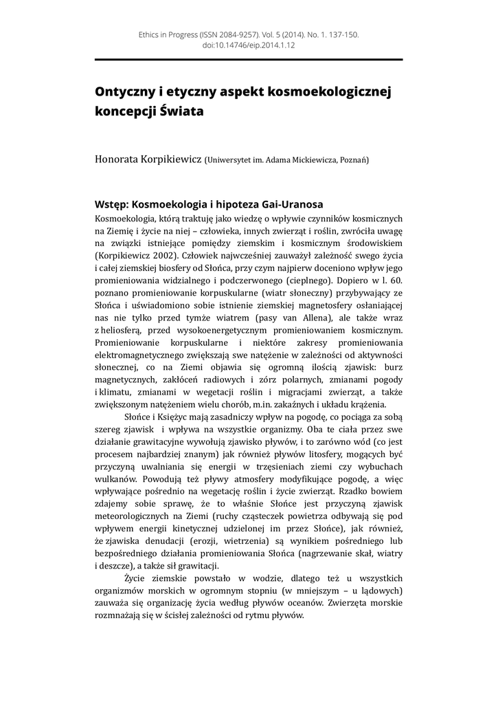 Ethics in Progress (ISSN 2084-9257). Vol. 5 (2014). No. 1. 137-150. doi:10.14746/eip.2014.1.12 Ontyczny i etyczny aspekt kosmoekologicznej koncepcji Świata Honorata Korpikiewicz (Uniwersytet im. Adama Mickiewicza, Poznan) Wstęp: Kosmoekologia i hipoteza Gai-Uranosa Kosmoekologia, ktorą traktuję jako wiedzę o wpływie czynnikow kosmicznych na Ziemię i zycie na niej – człowieka, innych zwierząt i roslin, zwrociła uwagę na związki istniejące pomiędzy ziemskim i kosmicznym srodowiskiem (Korpikiewicz 2002). Człowiek najwczesniej zauwazył zaleznosc swego zycia i całej ziemskiej biosfery od Słonca, przy czym najpierw doceniono wpływ jego promieniowania widzialnego i podczerwonego (cieplnego). Dopiero w l. 60. poznano promieniowanie korpuskularne (wiatr słoneczny) przybywający ze Słonca i uswiadomiono sobie istnienie ziemskiej magnetosfery osłaniającej nas nie tylko przed tymze wiatrem (pasy van Allena), ale takze wraz z heliosferą, przed wysokoenergetycznym promieniowaniem kosmicznym. Promieniowanie korpuskularne i niektore zakresy promieniowania elektromagnetycznego zwiększają swe natęzenie w zaleznosci od aktywnosci słonecznej, co na Ziemi objawia się ogromną iloscią zjawisk: burz magnetycznych, zakłocen radiowych i zorz polarnych, zmianami pogody i klimatu, zmianami w wegetacji roslin i migracjami zwierząt, a takze zwiększonym natęzeniem wielu chorob, m.in. zakaznych i układu krązenia. Słonce i Księzyc mają zasadniczy wpływ na pogodę, co pociąga za sobą szereg zjawisk i wpływa na wszystkie organizmy. Oba te ciała przez swe działanie grawitacyjne wywołują zjawisko pływow, i to zarowno wod (co jest procesem najbardziej znanym) jak rowniez pływow litosfery, mogących byc przyczyną uwalniania się energii w trzęsieniach ziemi czy wybuchach wulkanow. Powodują tez pływy atmosfery modyfikujące pogodę, a więc wpływające posrednio na wegetację roslin i zycie zwierząt. Rzadko bowiem zdajemy sobie sprawę, ze to własnie Słonce jest przyczyną zjawisk meteorologicznych na Ziemi (ruchy cząsteczek powietrza odbywają się pod wpływem energii kinetycznej udzielonej im przez Słonce), jak rowniez, ze zjawiska denudacji (erozji, wietrzenia) są wynikiem posredniego lub bezposredniego działania promieniowania Słonca (nagrzewanie skał, wiatry i deszcze), a takze sił grawitacji. Zycie ziemskie powstało w wodzie, dlatego tez u wszystkich organizmow morskich w ogromnym stopniu (w mniejszym – u lądowych) zauwaza się organizację zycia według pływow oceanow. Zwierzęta morskie rozmnazają się w scisłej zaleznosci od rytmu pływow. Ontyczny i etyczny aspekt kosmoekologicznej koncepcji Świata Od chwili powstania Ziemi opadał na nią pył kosmiczny jak rowniez większe bryły ciał meteorowych. Obecnie w ciągu kazdej doby spada 50-20 ton; w czasach początkow Ziemi gęstosc mgławicy protoplanetarnej była znacznie większa. Ciała meteorowe są przyczyną zmian stanu atmosfery (jej warstwy ozonowej) i zakłocen w propagacji fal radiowych, a nawet katastrof na kosmiczną skalę. Do takich nalezały wielkie zderzenia, pozostawiające po sobie slady w postaci ogromnych, wielokilometrowej srednicy kraterow. Liczne hipotezy łączą wypadki "wielkiego wymierania" zwierząt dawnych epok (m.in. 65 milionow lat temu) z masywnym zderzeniem Ziemi z kosmicznym ciałem. Pył pochodzący z rozpadu takiego ciała moze zahamowac dochodzące do Ziemi promieniowanie słoneczne, co odbija się w tragiczny sposob na biosferze. Rowniez pył z obłokow pyłowych Galaktyki (mgławic ciemnych) moze, podczas wędrowki Słonca wokoł jądra Galaktyki, spowodowac nadejscie epoki lodowej. Nie obojętne dla zycia są takze odleglejsze od Ziemi obiekty i pola siłowe. Promieniowanie widzialne wysyłane przez gwiazdy było podstawą nawigacji ludzi i zwierząt. Promieniowanie jonizujące wybuchających w poblizu Słonca gwiazd supernowych moze byc niszczące dla ziemskiego zycia szczegolnie wtedy, gdy wydarzenie takie zbiegnie się w czasie ze zniknięciem pola magnetycznego Ziemi i pozbawieniem biosfery ochronnej otoczki magnetosfery. Pole elektryczne atmosfery okazało się wręcz niezbędne do zycia. Zwierzęta pozbawione jonow ujemnych umierają nawet wtedy, gdy skład powietrza jest własciwy do oddychania (podobnie kosmonauci w statkach kosmicznych). Pole elektryczne atmosfery powstaje głownie za sprawą kosmicznej jonizacji gornych warstw atmosfery i utrzymuje okreslony stan ładunkow elektrycznych powierzchni Ziemi, a takze i tych, ktore płyną pod jej skorupą w postaci prądow wytwarzając pole magnetyczne naszej planety. Wszelkie zmiany pola magnetycznego, zarowno drastyczne (inwersja biegunow) jak i o słabszym natęzeniu (burze magnetyczne, przebiegające w rytm aktywnosci Słonca) wpływają na organizmy roslin i zwierząt. Najdłuzej nie doceniano wpływu pola grawitacyjnego na rozwoj organizmow, choc przeciez w srodowiskach, gdzie siła wyporu zmniejsza działanie siły grawitacji (np. w wodzie) organizmy charakteryzują się inną anatomią i fizjologią - np. innymi osrodkami wytwarzania krwi. Badania eksperymentalne na Ziemi, jak rowniez kosmiczne pokazują, ze umiarkowanie zwiększona siła grawitacji moze działac na organizmy pozytywnie, szczegolnie na rozrost tkanki mięsniowej i kostnej, natomiast dłuzsze przebywanie w stanie niewazkosci jest niesprzyjające. Wszechswiat jest pełen zjawisk przebiegających rytmicznie; większosc z nich zachodzi pod wpływem ruchow ciał po orbitach i ruchu wirowego wokoł osi. Kosmiczne rytmy nie tylko modyfikują warunki zycia na Ziemi, one są z nimi splecione od początku istnienia zycia, a co więcej – są dla ich 138 Honorata Korpikiewicz istnienia konieczne. Uwarunkowania te sięgają tak daleko, ze bez pewnych grawitacyjnych rytmow – istnienia Księzyca i jego ruchu, nie byłyby spełnione podstawowe warunki dla zycia na Ziemi, do jakich nalezy stabilnosc orbity. Zycie nie mogłoby zaistniec 