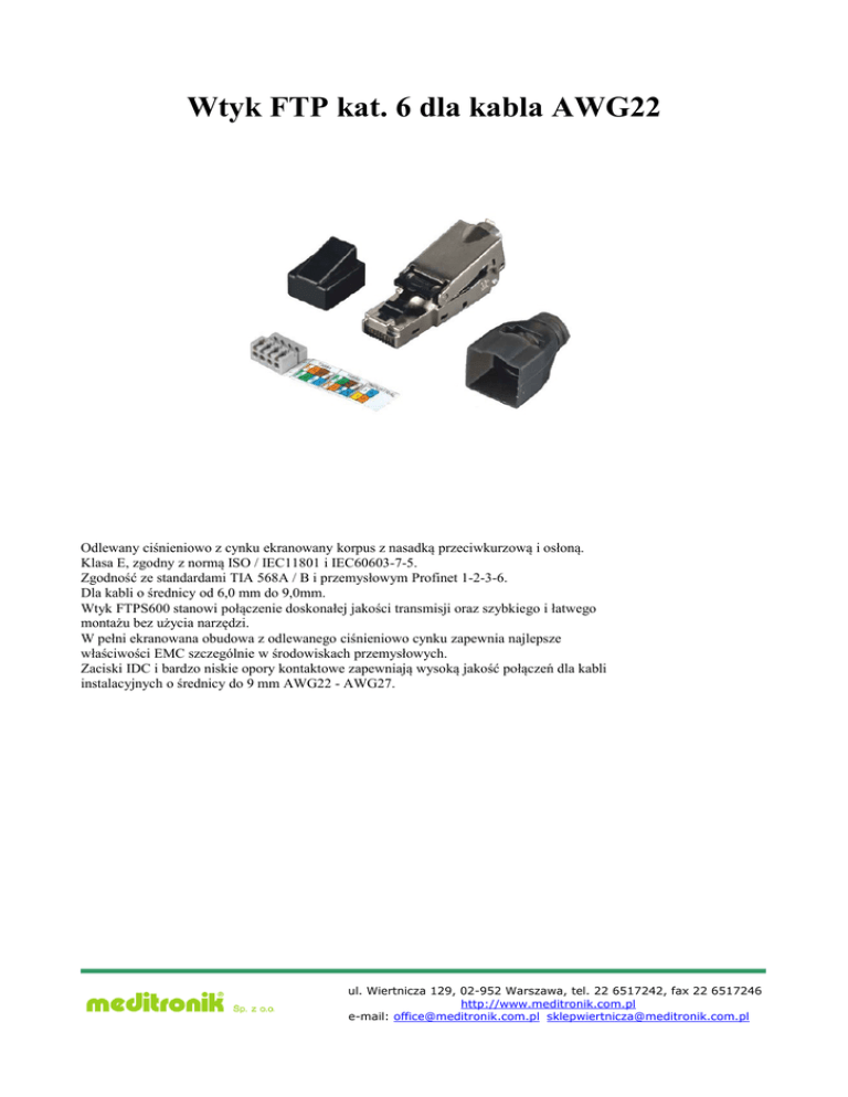 Wtyk FTP kat. 6 dla kabla AWG22 Odlewany ciśnieniowo z cynku ekranowany korpus z nasadką przeciwkurzową i osłoną. Klasa E, zgodny z normą ISO / IEC11801 i IEC60603-7-5. Zgodność ze standardami TIA 568A / B i przemysłowym Profinet 1-2-3-6. Dla kabli o średnicy od 6,0 mm do 9,0mm. Wtyk FTPS600 stanowi połączenie doskonałej jakości transmisji oraz szybkiego i łatwego montażu bez użycia narzędzi. W pełni ekranowana obudowa z odlewanego ciśnieniowo cynku zapewnia najlepsze właściwości EMC szczególnie w środowiskach przemysłowych. Zaciski IDC i bardzo niskie opory kontaktowe zapewniają wysoką jakość połączeń dla kabli instalacyjnych o średnicy do 9 mm AWG22 - AWG27. ul. Wiertnicza 129, 02-952 Warszawa, tel. 22 6517242, fax 22 6517246 http://www.meditronik.com.pl e-mail: [email protected] [email protected]