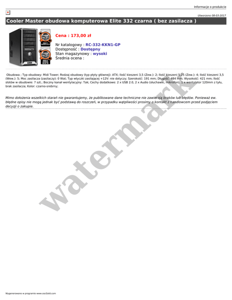 Informacje o produkcie Utworzono 08-03-2017 Cooler Master obudowa komputerowa Elite 332 czarna ( bez zasilacza ) Cena : 173,00 zł Nr katalogowy : RC-332-KKN1-GP Dostępność : Dostępny Stan magazynowy : wysoki Średnia ocena : er m ar k Obudowa ; Typ obudowy: Midi Tower; Rodzaj obudowy (typ płyty głównej): ATX; Ilość kieszeni 3,5 (Zew.): 2; Ilość kieszeni 5,25 (Zew.): 4; Ilość kieszeni 3,5 (Wew.): 5; Moc zasilacza (zasilaczy): 0 Wat; Typ wtyczki zasilającej +12V: nie dotyczy; Szerokość: 191 mm; Długość: 484 mm; Wysokość: 421 mm; Ilość slotów w obudowie: 7 szt.; Boczny kanał wentylacyjny: Tak; Cechy dodatkowe: 2 x USB 2.0, 2 x Audio (słuchawki, mikrofon), 1 x wentylator 120mm z tyłu, brak zasilacza; Kolor: czarno-srebrny; w at Mimo dołożenia wszelkich starań nie gwarantujemy, że publikowane dane techniczne nie zawierają braków lub błędów. Ponieważ ew. błędne opisy nie mogą jednak być podstawą do roszczeń, w przypadku wątpliwości prosimy o kontakt z handlowcem przed podjęciem decyzji o zakupie. Wygenerowano w programie www.oscGold.com