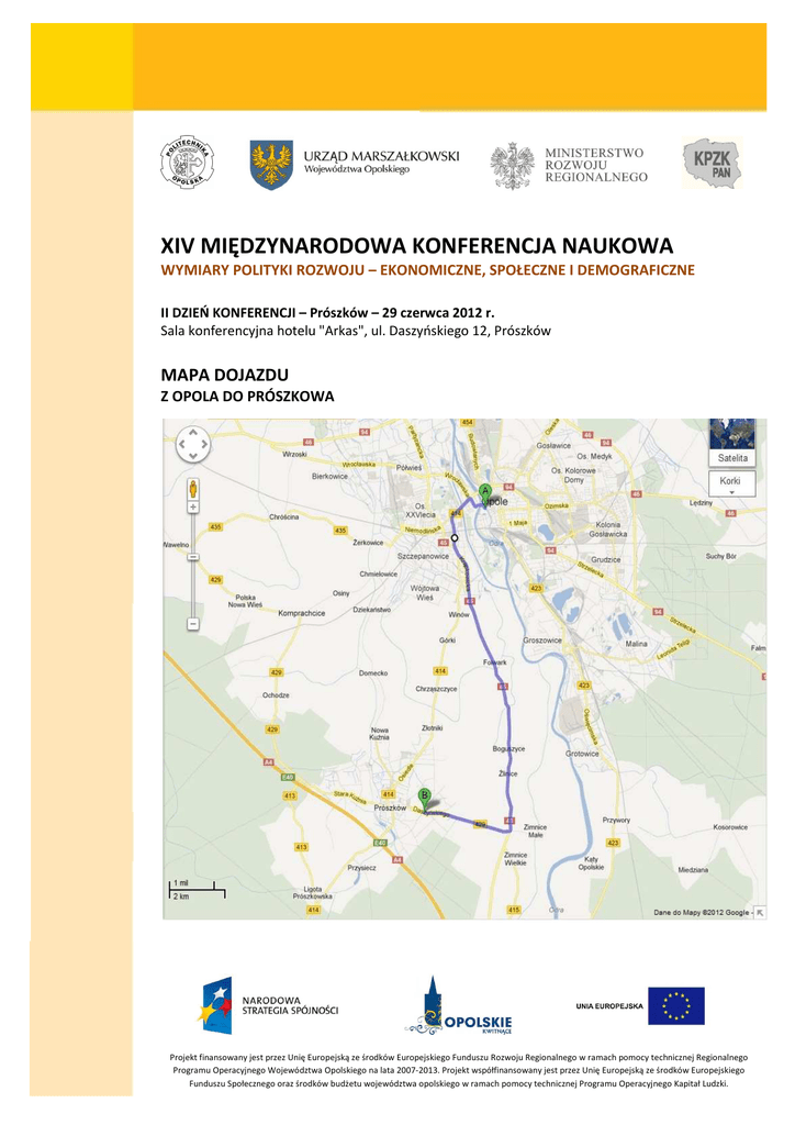 XIV MIĘDZYNARODOWA KONFERENCJA NAUKOWA WYMIARY POLITYKI ROZWOJU – EKONOMICZNE, SPOŁECZNE I DEMOGRAFICZNE II DZIEŃ KONFERENCJI – Prószków – 29 czerwca 2012 r. Sala konferencyjna hotelu "Arkas", ul. Daszyńskiego 12, Prószków MAPA DOJAZDU Z OPOLA DO PRÓSZKOWA Projekt finansowany jest przez Unię Europejską ze środków Europejskiego Funduszu Rozwoju Regionalnego w ramach pomocy technicznej Regionalnego Programu Operacyjnego Województwa Opolskiego na lata 2007-2013. Projekt współfinansowany jest przez Unię Europejską ze środków Europejskiego Funduszu Społecznego oraz środków budżetu województwa opolskiego w ramach pomocy technicznej Programu Operacyjnego Kapitał Ludzki.