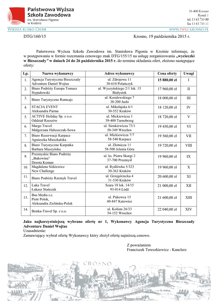 DTG/160/15 Krosno, 19 października 2015 r. Państwowa Wyższa Szkoła Zawodowa im. Stanisława Pigonia w Krośnie informuje, że w postępowaniu w formie rozeznania cenowego znak DTG/155/15 na usługę zorganizowania ,,wycieczki w Bieszczady” w dniach 24 do 26 października 2015 r. do terminu składania ofert, złożono następujące oferty: Lp. Adres wykonawcy Cena oferty Uwagi ul. Zdrojowa 11 38-610 Polańczyk ul. Wyszyńskiego 2/1 lok. 15 Białystok ul. Koralewskiego 7 38-200 Jasło ul. Mikołajska 6/1 30-552 Kraków ul. Mickiewicza 1 39-400 Tarnobrzeg ul. Sienkiewicza 73/1 50-349 Wrocław ul. Mickiewicza 7/7 58-540 Karpacz 15 880,00 zł I 17 960,00 zł II 18 000,00 zł III 18 120,00 zł IV 18 720,00 zł V 19 450,00 zł VI 19 560,00 zł VII ul. Złotnicza 11 58-500 Jelenia Góra 19 720,00 zł VIII ul. ks. Piotra Skargi 2 37-700 Przemyśl 19 960,00 zł IX ul. Rydlówka 5/323 30-363 Kraków ul. Grzegórzecka 4 31-530 Kraków Szara 18 lok. 14/15 93-014 Łódź 19 960,00 zł X 20 600,00 zł XI 21 000,00 zł XII Bus Media s.c. 13. Piotr Polok, Aleksandra Zielińska-Polok ul. Pukowca 15 40-847 Katowice 21 600,00 zł XIII 14. Bratka-Travel Sp. z o.o. ul. Kolista 26/33 54-152 Wrocław 22 040,00 zł XIV 1. 2. 3. Nazwa wykonawcy Agencja Turystyczna Bieszczady Adventure Daniel Wojtas Biuro Podróży Europa Tomasz Stypułowski Biuro Turystyczne Rumcajs STACJA EVENT Aleksandra Parma 5. ACTIVE Holiday Sp. z o.o. Oddział Rzeszów 6. Margo Travel Małgorzata Hałuszczak-Sowa 7. Biuro Rezerwacji Karpacz Agnieszka Mieszkalska 8. Biuro Turystyczne Karpatka Barbara Muszyńska Przemyskie Biuro Podróży 9. ,,Bukowina” Dorota Koman 10. Magdalena Siśkiewicz New Challenge 4. 11. Biuro Podróży Rzemyk Travel 12. Luka Travel Łukasz Stańczak Jako najkorzystniejszą wybrano ofertę nr 1, Wykonawcy Agencja Turystyczna Bieszczady Adventure Daniel Wojtas Uzasadnienie: Zamawiający wybrał ofertę Wykonawcy który złożył ofertę najniższą cenowo. Z poważaniem Franciszek Tereszkiewicz - Kanclerz