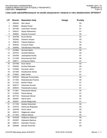 Lista osób zakwalifikowanych na studia stacjonarne I stopnia w roku akademickim 2016/2017 LP Numer Nazwisko Imię 1 206334 Alot Jakub 83 2 209361 Bergiel Paweł 81 3 207785 Czerniecki Tomasz 81 4 202031 Depta Aleksandra 81 5 208664 Deptuła Krzysztof 84 6 202796 Ducki Michał 83 7 202382 Dziedzic Kacper 83 8 208916 Falęcka Martyna 82 9 209440 Forysiuk Adam 84 10 200693 Gierałtowska Weronika 83 11 207864 Gomoła Marta 84 12 207916 Guralski Bartosz 82 13 203769 Jastrzębska Emilia 81 14 211328 Kaczmarczyk Piotr 84 15 206011 Konieczna Marta 81 16 207788 Kruk Adrian 83 17 205052 Kuchta Radosław 84 18 210546 Kurowski Jakub 81 19 201309 Kwiatkowski Adrian 81 20 210600 Małż Adrian 81 21 205030 Matysiak Przemysław 82 22 211393 Modzelewska Paulina 84 23 211232 Mońko Patryk 81 24 209731 Ostrowski Konrad 81 25 206543 Paradowski Łukasz 81 26 211661 Parszewski Maciej 83 27 210923 Pisula Maciej 81 28 207153 Rutkowski Michał 82 29 205297 Sarna Karol 81 30 200847 Subda Małgorzata 81 31 211165 Szelest Alexander 82 32 210519 Szewczyk Bogusław 83 33 202769 Szmit Jakub 82 34 206315 Węgłowski Jakub 82 35 211403 Wikiera Michał 84 36 203328 Wójtowicz Mateusz 84 37 200387 Zalewska Martyna 82 38 206010 Zawadka Tomasz 81 39 200908 Żaczek Dominika 84 COI-PW Rekrutacja letnia 2016/2017 Uwagi 18-07-2016 14:53:59 Punkty Strona: 1 / 1