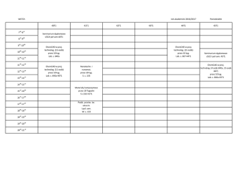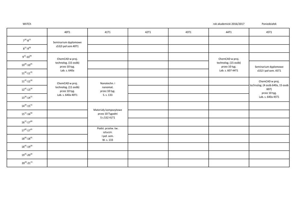 WIiTCh 40T1 730-815 15 8 -9 00 915-1000 1000-1045 00 11 -11 45 1145-1230 1245-1330 1330-1415 41T1 ChemCAD w proj. technolog. (15 osób) przez 10 tyg. Lab. s. 640a ChemCAD w proj. technolog. (11 osób) przez 10 tyg. Lab. s. 640a 40T1 Nanotechn. i nanomat. przez 10 tyg. S. s. 133 Materiały kompozytowe przez 10 Tygodni S s.532 41T1 1615-1700 1700-1745 1800-1845 1845-1930 1945-2030 2030-2115 43T1 Poniedziałek 44T1 45T1 ChemCAD w proj. technolog. (15 osób) przez 10 tyg. Lab. s. 607 44T1 Seminarium dyplomowe s532 I poł sem. 45T1 Seminarium dyplomowe s532I poł sem 40T1 1430-1515 1515-1600 42T1 rok akademicki 2016/2017 Podst. przetw. tw. sztuczn. I poł. sem. W. s. 133 ChemCAD w proj. technolog. (4 osób 640a, 15 osob 607) przez 10 tyg. Lab. s. 640a 45T1 WIiTCh 40T1 41T1 42T1 43T1 rok akademicki 2016/2017 Wtorek 44T1 45T1 730-815 815-900 915-1000 1000-1045 00 11 -11 12 -13 Seminarium dyplomowe s 302 44T1 45 1145-1230 45 Wybr. działy technol. organ. I poł. sem. Lab. s. 638 40T1 ChemCAD w proj. technolog. (15 osób) Lab. s. 640a (14 osób) Lab. S. 607 przez 10 tyg. 41T1 30 1330-1415 1430-1515 1515-1600 1615-1700 1700-1745 1800-1845 1845-1930 1945-2030 2030-2115 Podst. przetw. tw. sztuczn. 11.00-16.15 2 gr. na zmianę po 5 bloków po 6 godz. 41T1 ChemCAD w proj. technolog. przez 10 tyg. Lab. s. 640a 42T1 Zrównoważony rozwój i czystsze technologie przez 10 tyg. S s. 303a 43T1 ChemCAD w proj. technolog. (14 osób 44T1) przez 10 tyg. Lab. s. 607 WIiTCh 40T1 41T1 42T1 730-815 15 8 -9 Biokataliza W. przez 10 tyg s0/19 915-1000 1100-1145 1145-1230 1245-1330 30 13 -14 15 1430-1515 1515-1600 1615-1700 1700-1745 1800-1845 1845-1930 1945-2030 2030-2115 Środa 44T1 45T1 Mat. metaliczne i środowisko I poł sem s135 43T1 00 1000-1045 43T1 rok akademicki 2016/2017 Techn. przetw. sur. odnaw. I poł. sem. S. s. 532 40T1 Enzymy I poł sem S s.532 40T1 ChemCAD w proj. technolog. (11 osób 43T1) przez 10 tyg. Lab. s. 607 Analiza techniczna paliw laboratorium 430 Grupa A- I połowa Grupa B- II połowa Gospodarka surowcami wtórnymi W s 402 Analit. zw. pochodz. natur. I poł. sem. Lab. grA s. 308, 310, 316, 335 Podst. technol. kosmet. przez 10 tyg. Lab. s. 638 45T1 WIiTCh 730-815 15 8 -9 00 915-1000 40T1 41T1 Procesy utleniające w technologii organicznej S s.110 przez 10 tygodni Seminarium dyplomowe S s133 41T1 I poł sem 42T1 43T1 Met adsorpcyjne w kat przemysłowej S I poł sem s607 42T1 1000-1045 1100-1145 1145-1230 ChemCAD w proj. technologicznym – I poł sem W. s. 402 1245-1330 30 13 -14 Seminarium dyplomowe s 302 43T1 15 1430-1515 1515-1600 1615-1700 1700-1745 1800-1845 1845-1930 1945-2030 2030-2115 Metody badań ropy naft. I prod. Naft S s 133 42T1 przez 10 tygodni Monitorowanie i analiza procesów technologicznych S s.302 43T1 rok akademicki 2016/2017 Czwartek 44T1 45T1 WIiTCh 40T1 41T1 42T1 43T1 rok akademicki 2016/2017 Piątek 44T1 45T1 Podst. technol. kosmet. I poł. sem. 45T1 s.133 730-815 815-900 915-1000 1000-1045 1100-1145 1145-1230 45 12 -13 30 1330-1415 1430-1515 1515-1600 1615-1700 1700-1745 1800-1845 1845-1930 1945-2030 2030-2115 Produkty naftowe do specjalnych zastosowań s.134 I poł sem Seminarium dyplomowe I poł sem sem s. 133 42T1 Metateza olefin I poł sem sem s. 133 42T1 Sur. i technol. w prod. śr. czyst. przez 10 tyg. S. s. 302 43T1 Fizykochem. met. rozdz. sur. natur. przez 10 tyg. S. s. 133 Przeciwprądowa chromatografia cieczowa przez 10 tyg S s.302 44T1 Analit. zw. pochodz. natur. I poł. sem. Lab. GrB s. 308, 310, 316, 335