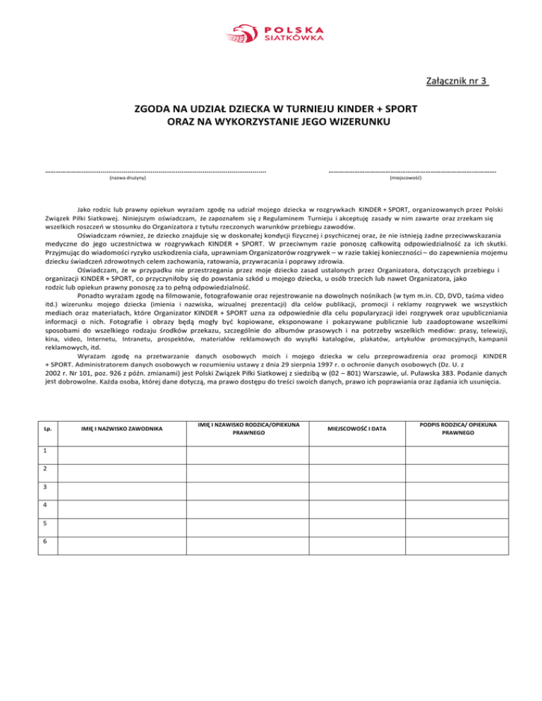 Załącznik nr 3 ZGODA NA UDZIAŁ DZIECKA W TURNIEJU KINDER + SPORT ORAZ NA WYKORZYSTANIE JEGO WIZERUNKU …………………................................................................................................ …………………………………………..…………………………….…………. (nazwa drużyny) (miejscowość) Jako rodzic lub prawny opiekun wyrażam zgodę na udział mojego dziecka w rozgrywkach KINDER + SPORT, organizowanych przez Polski Związek Piłki Siatkowej. Niniejszym oświadczam, że zapoznałem się z Regulaminem Turnieju i akceptuję zasady w nim zawarte oraz zrzekam się wszelkich roszczeń w stosunku do Organizatora z tytułu rzeczonych warunków przebiegu zawodów. Oświadczam również, że dziecko znajduje się w doskonałej kondycji fizycznej i psychicznej oraz, że nie istnieją żadne przeciwwskazania medyczne do jego uczestnictwa w rozgrywkach KINDER + SPORT. W przeciwnym razie ponoszę całkowitą odpowiedzialność za ich skutki. Przyjmując do wiadomości ryzyko uszkodzenia ciała, uprawniam Organizatorów rozgrywek – w razie takiej konieczności – do zapewnienia mojemu dziecku świadczeń zdrowotnych celem zachowania, ratowania, przywracania i poprawy zdrowia. Oświadczam, że w przypadku nie przestrzegania przez moje dziecko zasad ustalonych przez Organizatora, dotyczących przebiegu i organizacji KINDER + SPORT, co przyczyniłoby się do powstania szkód u mojego dziecka, u osób trzecich lub nawet Organizatora, jako rodzic lub opiekun prawny ponoszę za to pełną odpowiedzialność. Ponadto wyrażam zgodę na filmowanie, fotografowanie oraz rejestrowanie na dowolnych nośnikach (w tym m.in. CD, DVD, taśma video itd.) wizerunku mojego dziecka (imienia i nazwiska, wizualnej prezentacji) dla celów publikacji, promocji i reklamy rozgrywek we wszystkich mediach oraz materiałach, które Organizator KINDER + SPORT uzna za odpowiednie dla celu popularyzacji idei rozgrywek oraz upubliczniania informacji o nich. Fotografie i obrazy będą mogły być kopiowane, eksponowane i pokazywane publicznie lub zaadoptowane wszelkimi sposobami do wszelkiego rodzaju środków przekazu, szczególnie do albumów prasowych i na potrzeby wszelkich mediów: prasy, telewizji, kina, video, Internetu, Intranetu, prospektów, materiałów reklamowych do wysyłki katalogów, plakatów, artykułów promocyjnych, kampanii reklamowych, itd. Wyrażam zgodę na przetwarzanie danych osobowych moich i mojego dziecka w celu przeprowadzenia oraz promocji KINDER + SPORT. Administratorem danych osobowych w rozumieniu ustawy z dnia 29 sierpnia 1997 r. o ochronie danych osobowych (Dz. U. z 2002 r. Nr 101, poz. 926 z późn. zmianami) jest Polski Związek Piłki Siatkowej z siedzibą w (02 – 801) Warszawie, ul. Puławska 383. Podanie danych jest dobrowolne. Każda osoba, której dane dotyczą, ma prawo dostępu do treści swoich danych, prawo ich poprawiania oraz żądania ich usunięcia. Lp. 1 2 3 4 5 6 IMIĘ I NAZWISKO ZAWODNIKA IMIĘ I NZAWISKO RODZICA/OPIEKUNA PRAWNEGO MIEJSCOWOŚĆ I DATA PODPIS RODZICA/ OPIEKUNA PRAWNEGO