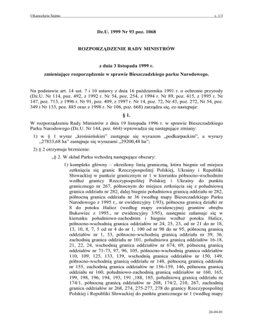 ©Kancelaria Sejmu s. 1/3 Dz.U. 1999 Nr 93 poz. 1068 ROZPORZĄDZENIE RADY MINISTRÓW z dnia 3 listopada 1999 r. zmieniające rozporządzenie w sprawie Bieszczadzkiego parku Narodowego. Na podstawie art. 14 ust. 7 i 10 ustawy z dnia 16 października 1991 r. o ochronie przyrody (Dz.U. Nr 114, poz. 492, z 1992 r. Nr 54, poz. 254, z 1994 r. Nr 89, poz. 415, z 1995 r. Nr 147, poz. 713, z 1996 r. Nr 91, poz. 409, z 1997 r. Nr 14, poz. 72, Nr 43, poz. 272, Nr 54, poz. 349 i Nr 133, poz. 885 oraz z 1998 r. Nr 106, poz. 668) zarządza się, co następuje: § 1. W rozporządzeniu Rady Ministrów z dnia 19 listopada 1996 r. w sprawie Bieszczadzkiego Parku Narodowego (Dz.U. Nr 144, poz. 664) wprowadza się następujące zmiany: 1) w § 1 wyraz „krośnieńskim” zastępuje się wyrazem „podkarpackim”, a wyrazy „27833,68 ha” zastępuje się wyrazami „29200,48 ha”; 2) § 2 otrzymuje brzmienie: „§ 2. W skład Parku wchodzą następujące obszary: 1) kompleks główny – określony linią graniczną, która biegnie od miejsca zetknięcia się granic Rzeczypospolitej Polskiej, Ukrainy i Republiki Słowackiej w punkcie granicznym nr 1 w kierunku północno-wschodnim wzdłuż granicy Rzeczypospolitej Polskiej i Ukrainy do punktu granicznego nr 267, północnym do miejsca zetknięcia się z południową granica oddziału nr 282, dalej biegnie południowa granicą oddziału nr 282, północną granica oddziału nr 36 (według mapy Bieszczadzkiego Parku Narodowego z 1995 r., nr ewidencyjny 1/93), północna granicą działki nr 8 do potoku Halicz (według mapy ewidencyjnej gruntów obrębu Bukowiec z 1995., nr ewidencyjny 3/95), następnie załamuje się w kierunku południowo-zachodnim i biegnie wzdłuż potoku Halicz, północno-wschodnią granica oddziałów nr 24, 25, 23, od nr 21 do nr 18, 13, 10, 8, 7, 5 od nr 4 do nr 1, 100 od nr 98 do nr 95, północną granicą oddziałów nr 1, 33, północno-wschodnią granicą oddziału nr 39, 36, zachodnią granica oddziału nr 101, południowa granicą oddziałów 16-18, 21, 22, 24, wschodnią granica oddziałów nr 674, 69, północną granicą oddziałów nr 71-73, 97, 96, 105, północno-wschodnią granica oddziałów 110, 109, 125, 133, 139, wschodnią granica oddziałów nr 150, 149, północno-wschodnią granicą oddziału nr 148, północną granicą oddziału nr 155, zachodnią granica oddziałów nr 156-159, 146, północna granicą oddziału nr 160, południowo-zachodnią granicą oddziałów nr 160, 165, 199, 198, 196, 194, 193, 191 ,188, 185, południową granicą oddziału nr 174/1, północną granicą oddziałów nr 208, 174/2, 210, 267, zachodnią granica oddziałów nr 268, 274, 275-277, 278 do granicy Rzeczypospolitej Polskiej i Republiki Słowackiej do punktu granicznego nr 1 (według mapy 26-04-01 ©Kancelaria Sejmu s. 2/3 Bieszczadzkiego Parku Narodowego z 1995 r., nr ewidencyjny 1/93 – o powierzchni 27760,24 ha, 2) oddział nr 95/2 (według mapy Bieszczadzkiego Parku Narodowego z dnia 31 grudnia 1994 r., nr ewidencyjny 1031/94/12) – o powierzchni 6,13 ha, 3) działka nr 134/5 (według mapy uzupełniającej obrębu Zatwarnica, gmina Lutowiska z dnia 12 września 1994 r., nr ewidencyjny 1/95) – o powierzchni 0,24 ha, 4) działka nr 67A/7 (według mapy uzupełniającej obrębu Nasiczne, gmina Lutowiska z dnia 12 września 1994 r., nr ewidencyjny 2/95) – o powierzchni 0,78 ha, 5) kompleks „Wierch Mucharin”, obejmujący oddział nr 279 (według mapy Bieszczadzkiego Parku narodowego z dnia 31 grudnia 1994 r., nr ewidencyjny 1031/94/11) – o powierzchni 16,04 ha, 6) kompleks „Nad Staszelem”, obejmujący oddział nr 280 (według mapy Bieszczadzkiego Parku Narodowego z dnia 31 grudnia 1994 r., nr ewidencyjny 1031/94/11) – o powierzchni 29,97 ha, 7) działka nr 185 (według mapy uzupełniającej obrębu Lutowiska, gmina Lutowiska z 1995 r., nr ewidencyjny 5/95) – o powierzchni 0,17 ha, 8) działka nr 288 (według mapy uzupełniającej obrębu Lutowiska, gmina Lutowiska z 1995 r., nr ewidencyjny 5/95) – o powierzchni 0,22 ha, 9) działki nr 156/5 i 156/9 (według mapy ewidencyjnej obrębu Ustrzyki Dolne z 1991 r., nr ewidencyjny 1/91) – o powierzchni 0,09 ha, 10) działki nr 1, 3, 6, 9 (według mapy ewidencyjnej obrębu Bukowiec z 1998 r., nr ewidencyjny 6/98) – o powierzchni 116,60 ha, 11) kompleks Tarnawa – określony linią graniczną, która biegnie od miejsca zetknięcia się granicy Rzeczypospolitej Polskiej i Ukrainy z północnowschodnią granicą oddziału nr 276, w kierunku północno-zachodnim wzdłuż granicy Rzeczypospolitej Polskiej do miejsca zetknięcia się z południowo-wschodnią granicą oddziału nr 136, dalej biegnie południowo-wschodnią granicą oddziału nr 136, północno-wschodnią granicą oddziałów nr 136, 134, od nr 66 do nr 63, 61A, od nr 61 do nr 26, 233, od nr 240 do nr 238, 242, 244, 246, 249, 252, 256, 265, 276, 272, 270, 278, 277 ,269, 268, 176 do miejsca zetknięcia się granicy Rzeczypospolitej Polskiej i Ukrainy z północno-wschodnią granicą oddziału nr 276 (według mapy Bieszczadzkiego Parku Narodowego z 1995 r., nr ewidencyjny pow/1/98) – o powierzchni 1270,00 ha.”; 3) § 3 otrzymuje brzmienie: „§ 3. 1. W zarząd Parku nie przechodzą nieruchomości Skarbu Państwa będące w zarządzie Dyrekcji Okręgowej Dróg Publicznych w Krakowie (zajęte pod drogi publiczne) – o powierzchni 59,41 ha. 2. Z zarządu Parku wyłącza się: 1) nieruchomości Poczty Polskiej zajęte pod budynek poczty w Ustrzykach Górnych działka nr 10 o powierzchni 0,23 ha, 2) rzekę San.”; 26-04-01 ©Kancelaria Sejmu s. 3/3 4) w § 5 w ust. 2 pkt 4 otrzymuje brzmienie: „4) wykonywania zadań z zakresu obronności państwa, ochrony granicy państwowej oraz bezpieczeństwa i porządku publicznego,”; 5) § 6 otrzymuje brzmienie: „§ 6. 1. Wokół Parku tworzy się strefę ochronną, zwaną „otuliną”, o powierzchni 55783,20 ha, położoną w województwie podkarpackim. 