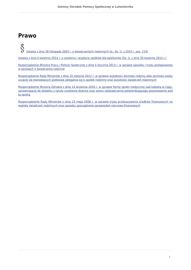 Gminny Ośrodek Pomocy Społecznej w Lutomiersku Prawo Ustawa z dnia 28 listopada 2003 r. o świadczeniach rodzinnych (tj.: Dz. U. z 2015 r. poz. 114) Ustawa z dnia 4 kwietnia 2014 r. o ustaleniu i wypłacie zasiłków dla opiekunów (Dz. U. z dnia 30 kwietnia 2014 r.) Rozporządzenie Ministra Pracy i Polityki Społecznej z dnia 3 stycznia 2013 r. w sprawie sposobu i trybu postępowania w sprawach o świadczenia rodzinne Rozporządzenie Rady Ministrów z dnia 10 sierpnia 2012 r. w sprawie wysokości dochodu rodziny albo dochodu osoby uczącej się stanowiących podstawę ubiegania się o zasiłek rodzinny oraz wysokości świadczeń rodzinnych Rozporządzenie Ministra Zdrowia z dnia 14 września 2010 r. w sprawie formy opieki medycznej nad kobietą w ciąży, uprawniającej do dodatku z tytułu urodzenia dziecka oraz wzoru zaświadczenia potwierdzającego pozostawanie pod tą opieką Rozporządzenie Rady Ministrów z dnia 23 maja 2006 r. w sprawie trybu przekazywania środków finansowych na wypłaty świadczeń rodzinnych oraz sposobu sporządzania sprawozdań rzeczowo-finansowych 1