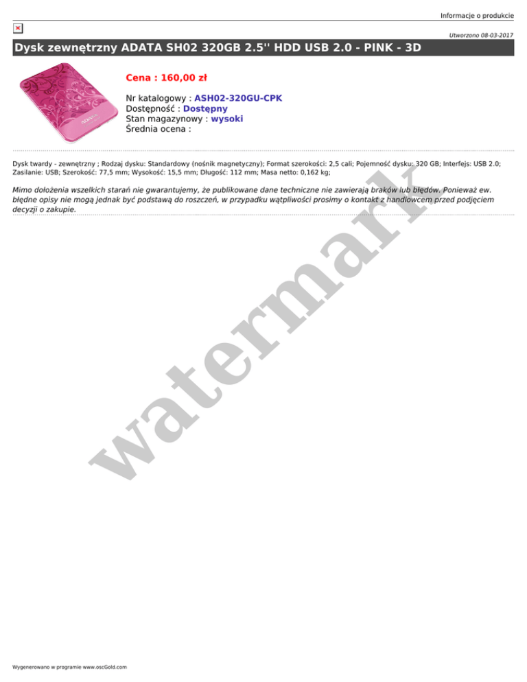 Informacje o produkcie Utworzono 08-03-2017 Dysk zewnętrzny ADATA SH02 320GB 2.5'' HDD USB 2.0 - PINK - 3D Cena : 160,00 zł Nr katalogowy : ASH02-320GU-CPK Dostępność : Dostępny Stan magazynowy : wysoki Średnia ocena : Dysk twardy - zewnętrzny ; Rodzaj dysku: Standardowy (nośnik magnetyczny); Format szerokości: 2,5 cali; Pojemność dysku: 320 GB; Interfejs: USB 2.0; Zasilanie: USB; Szerokość: 77,5 mm; Wysokość: 15,5 mm; Długość: 112 mm; Masa netto: 0,162 kg; w at er m ar k Mimo dołożenia wszelkich starań nie gwarantujemy, że publikowane dane techniczne nie zawierają braków lub błędów. Ponieważ ew. błędne opisy nie mogą jednak być podstawą do roszczeń, w przypadku wątpliwości prosimy o kontakt z handlowcem przed podjęciem decyzji o zakupie. Wygenerowano w programie www.oscGold.com
