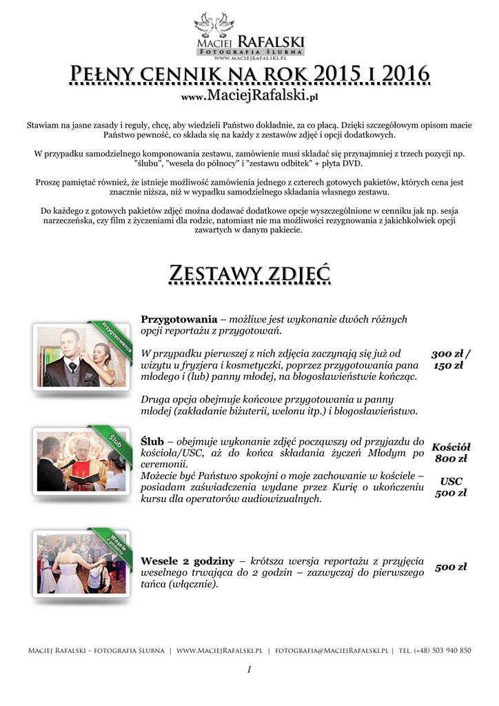 Pełny cennik na rok 2015 i 2016 .MaciejRafalski.pl www Stawiam na jasne zasady i reguły, chcę, aby wiedzieli Państwo dokładnie, za co płacą. Dzięki szczegółowym opisom macie Państwo pewność, co składa się na każdy z zestawów zdjęć i opcji dodatkowych. W przypadku samodzielnego komponowania zestawu, zamówienie musi składać się przynajmniej z trzech pozycji np. "ślubu", "wesela do północy" i "zestawu odbitek" + płyta DVD. Proszę pamiętać również, że istnieje możliwość zamówienia jednego z czterech gotowych pakietów, których cena jest znacznie niższa, niż w wypadku samodzielnego składania własnego zestawu. Do każdego z gotowych pakietów zdjęć można dodawać dodatkowe opcje wyszczególnione w cenniku jak np. sesja narzeczeńska, czy film z życzeniami dla rodzic, natomiast nie ma możliwości rezygnowania z jakichkolwiek opcji zawartych w danym pakiecie. Zestawy zdjęć Przygotowania – możliwe jest wykonanie dwóch różnych opcji reportażu z przygotowań. W przypadku pierwszej z nich zdjęcia zaczynają się już od wizytu u fryzjera i kosmetyczki, poprzez przygotowania pana młodego i (lub) panny młodej, na błogosławieństwie kończąc. 300 zł / 150 zł Druga opcja obejmuje końcowe przygotowania u panny młodej (zakładanie biżuterii, welonu itp.) i błogosławieństwo. Ślub – obejmuje wykonanie zdjęć począwszy od przyjazdu do Kościół kościoła/USC, aż do końca składania życzeń Młodym po 800 zł ceremonii. Możecie być Państwo spokojni o moje zachowanie w kościele – USC posiadam zaświadczenia wydane przez Kurię o ukończeniu 500 zł kursu dla operatorów audiowizualnych. Wesele 2 godziny – krótsza wersja reportażu z przyjęcia weselnego trwająca do 2 godzin – zazwyczaj do pierwszego tańca (włącznie). 500 zł Maciej Rafalski – fotografia ślubna | www.MaciejRafalski.pl | [email protected] | tel. (+48) 503 940 850 1 Wesele do północy – pakiet zdjęć dokumentujących całe przyjęcie weselne – od wejścia młodych do restauracji/domu weselnego, aż do oczepin (włącznie). Dopłata za każdą 1000 zł dodatkową godzinę fotografowania po oczepinach wynosi 150 zł i zwiększa liczbę poddanych obróbce zdjęć w postaci cyfrowej o 25. Plener tego samego dnia – krótsza wersja sesji plenerowej, wykonywana w dniu ślubu. Trwa tak długo, na ile pozwala czas. Zazwyczaj wykonywana przed ślubem lub w czasie przyjęcia weselnego. Wybór miejsca takiej sesji proponowany jest przez Państwa Młodych. Plener innego dnia – pakiet zdjęć z sesji plenerowej, wykonywanej w najdogodniejszym dla Państwa terminie, gdy wypoczną już Państwo po całej ceremonii. Miejsce sesji jest wybierane przez Młodych, jednak można liczyć na moją pomoc w tej kwestii. Trzeba przygotować się na to, że sesja plenerowa trwa zazwyczaj 4-9 godzin. W pakiecie srebrnym czas trwania sesji wynosi do 4 godzin (przynajmniej 30 wyselekcjonowanych i poddanych obróbce zdjęć), w złotym do 6 godzin (przynajmniej 45 zdjęć), w pakiecie premium sesja może trwać nawet cały dzień, może to być również sesja wyjazdowa – w góry, nad morze lub sesja zagraniczna – z sesji w pakiecie premium otrzymują Państwo przynajmniej 60 zdjęć). 400 zł 800 zł Kwestia wyboru terminu jest bardzo istotna w przypadku pleneru. Słoneczna pogoda bardzo pomaga przy wykonywaniu zdjęć. Osobiście odradzam wykonywanie zdjęć plenerowych w pochmurny dzień. Terminu sesji plenerowej nie trzeba koniecznie wpisywać w umowie – wystarczy dopisek „do ustalenia w późniejszym terminie”. Niestety większość sobót w okresie letnim mam zajętych dlatego najlepszą opcją jest organizacja pleneru w niedzielę lub od poniedziałku do piątku. Sesję rozpoczyna się zazwyczaj w godzinach popołudniowych (14-15). Sesja narzeczeńska – sesja wykonywana przed ślubem w wybranym przez Państwa terminie. Pozwala oswoić się z obiektywem. Od sesji plenerowej, która wykonywana jest po ślubie znacznie różni się klimatem. Zalecane jest, aby sesja narzeczeńska wykonywana była w innym miejscu niż sesja plenerowa. Z takiej sesji otrzymujecie Państwo ok. 35 wyselekcjonowanych i starannie obrobionych zdjęć. 500 zł Maciej Rafalski – fotografia ślubna | www.MaciejRafalski.pl | [email protected] | tel. (+48) 503 940 850 2 Film z podziękowaniami dla rodziców – unikalna możliwość nagrania ok 3-minutowego filmu z podziękowaniami dla rodziców, który wyświetlony zostanie podczas wesela. Film jest profesjonalnie wykonany i złożony wg napisanego przez Państwa scenariusza. Film jest nagrywany przeze mnie, co sprawia, że nawet jeśli nie zdecydowaliście się Państwo zamówić kamerzysty na swoją uroczystość, macie możliwość nagrania filmu, jako wyjątkowej niespodzianki dla rodziców. Do filmu można dodać również dostarczone przez Państwa zdjęcia z dzieciństwa. 500 zł Drugi fotograf – Do każdego z pakietów istnieje możliwość zamówienie drugiego fotografa, który będzie wykonywał zdjęcia podczas uroczystości ślubnej i wesela. W wypadku wybrania tej opcji liczba oddawanych Państwu, poddanych obróbce zdjęć w 600 zł postaci cyfrowej zwiększa się o 25% (dla przykładu – w przypadku wyboru zamówienia drugiego fotografa i wybrania pakietu premium otrzymacie Państwo 500 zdjęć w postaci cyfrowej zamiast 400). Maciej Rafalski – fotografia ślubna | www.MaciejRafalski.pl | [email protected] | tel. (+48) 503 940 850 3 Opcje dodatkowe Fotoksiążka – pięknie wykonana i złożona przeze mnie fotoksiążka z wybranych przez Państwa zdjęć. Prezentuje się znakomicie, znacznie lepiej niż tradycyjny album ze zdjęciami. Jest również lepiej wykonana i znacznie trwalsza. Strony wykonane są w technice drugu cyfrowego na powlekanym papierze kredowym o gramaturze 180 g/m 2.Okładka twarda. 30x30, 34 str. Fotoksiążki można zamówić w dwóch rozmiarach – 30x30 cm 300 zł lub 21x21 cm. Fotoksią