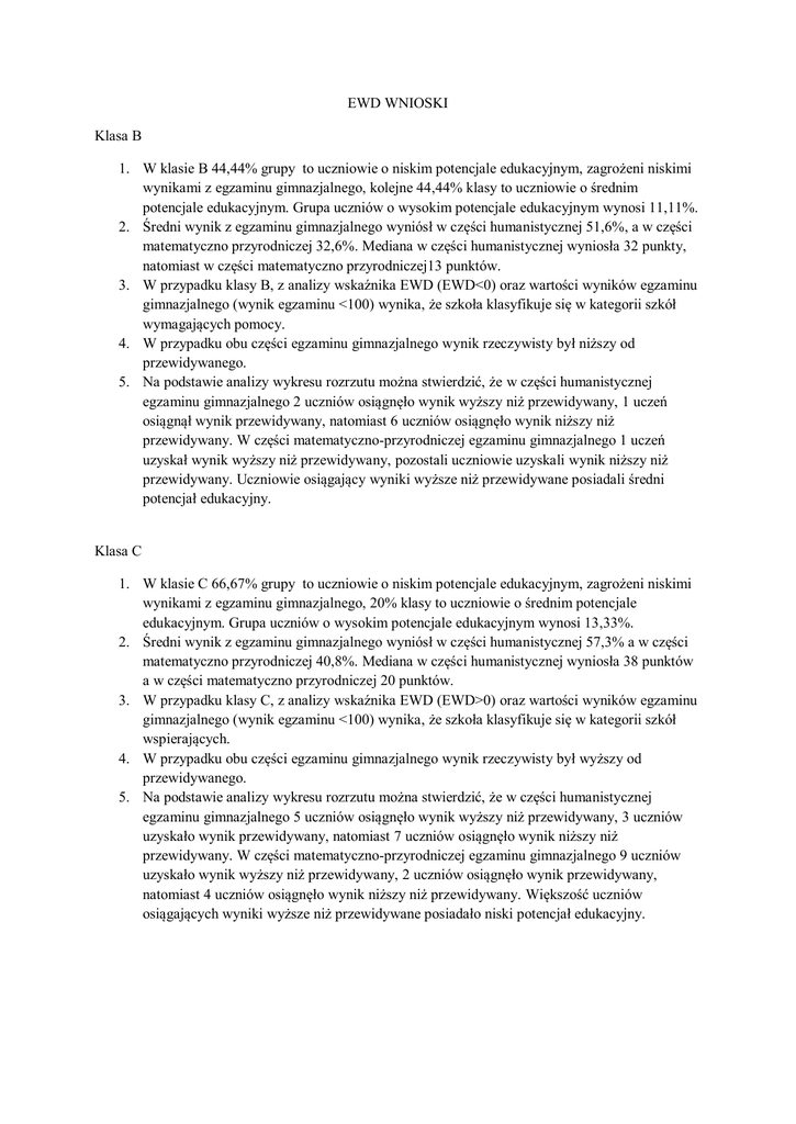 EWD WNIOSKI Klasa B 1. W klasie B 44,44% grupy to uczniowie o niskim potencjale edukacyjnym, zagrożeni niskimi wynikami z egzaminu gimnazjalnego, kolejne 44,44% klasy to uczniowie o średnim potencjale edukacyjnym. Grupa uczniów o wysokim potencjale edukacyjnym wynosi 11,11%. 2. Średni wynik z egzaminu gimnazjalnego wyniósł w części humanistycznej 51,6%, a w części matematyczno przyrodniczej 32,6%. Mediana w części humanistycznej wyniosła 32 punkty, natomiast w części matematyczno przyrodniczej13 punktów. 3. W przypadku klasy B, z analizy wskaźnika EWD (EWD<0) oraz wartości wyników egzaminu gimnazjalnego (wynik egzaminu <100) wynika, że szkoła klasyfikuje się w kategorii szkół wymagających pomocy. 4. W przypadku obu części egzaminu gimnazjalnego wynik rzeczywisty był niższy od przewidywanego. 5. Na podstawie analizy wykresu rozrzutu można stwierdzić, że w części humanistycznej egzaminu gimnazjalnego 2 uczniów osiągnęło wynik wyższy niż przewidywany, 1 uczeń osiągnął wynik przewidywany, natomiast 6 uczniów osiągnęło wynik niższy niż przewidywany. W części matematyczno-przyrodniczej egzaminu gimnazjalnego 1 uczeń uzyskał wynik wyższy niż przewidywany, pozostali uczniowie uzyskali wynik niższy niż przewidywany. Uczniowie osiągający wyniki wyższe niż przewidywane posiadali średni potencjał edukacyjny. Klasa C 1. W klasie C 66,67% grupy to uczniowie o niskim potencjale edukacyjnym, zagrożeni niskimi wynikami z egzaminu gimnazjalnego, 20% klasy to uczniowie o średnim potencjale edukacyjnym. Grupa uczniów o wysokim potencjale edukacyjnym wynosi 13,33%. 2. Średni wynik z egzaminu gimnazjalnego wyniósł w części humanistycznej 57,3% a w części matematyczno przyrodniczej 40,8%. Mediana w części humanistycznej wyniosła 38 punktów a w części matematyczno przyrodniczej 20 punktów. 3. W przypadku klasy C, z analizy wskaźnika EWD (EWD>0) oraz wartości wyników egzaminu gimnazjalnego (wynik egzaminu <100) wynika, że szkoła klasyfikuje się w kategorii szkół wspierających. 4. W przypadku obu części egzaminu gimnazjalnego wynik rzeczywisty był wyższy od przewidywanego. 5. Na podstawie analizy wykresu rozrzutu można stwierdzić, że w części humanistycznej egzaminu gimnazjalnego 5 uczniów osiągnęło wynik wyższy niż przewidywany, 3 uczniów uzyskało wynik przewidywany, natomiast 7 uczniów osiągnęło wynik niższy niż przewidywany. W części matematyczno-przyrodniczej egzaminu gimnazjalnego 9 uczniów uzyskało wynik wyższy niż przewidywany, 2 uczniów osiągnęło wynik przewidywany, natomiast 4 uczniów osiągnęło wynik niższy niż przewidywany. Większość uczniów osiągających wyniki wyższe niż przewidywane posiadało niski potencjał edukacyjny.