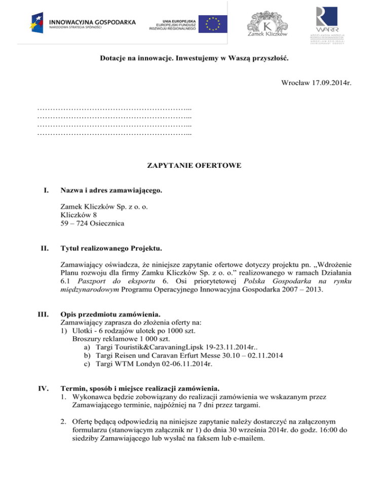 Dotacje na innowacje. Inwestujemy w Waszą przyszłość. Wrocław 17.09.2014r. …………………………………………………... …………………………………………………... …………………………………………………... …………………………………………………... ZAPYTANIE OFERTOWE I. Nazwa i adres zamawiającego. Zamek Kliczków Sp. z o. o. Kliczków 8 59 – 724 Osiecznica II. Tytuł realizowanego Projektu. Zamawiający oświadcza, że niniejsze zapytanie ofertowe dotyczy projektu pn. „Wdrożenie Planu rozwoju dla firmy Zamku Kliczków Sp. z o. o.” realizowanego w ramach Działania 6.1 Paszport do eksportu 6. Osi priorytetowej Polska Gospodarka na rynku międzynarodowym Programu Operacyjnego Innowacyjna Gospodarka 2007 – 2013. III. Opis przedmiotu zamówienia. Zamawiający zaprasza do złożenia oferty na: 1) Ulotki - 6 rodzajów ulotek po 1000 szt. Broszury reklamowe 1 000 szt. a) Targi Touristik&CaravaningLipsk 19-23.11.2014r.. b) Targi Reisen und Caravan Erfurt Messe 30.10 – 02.11.2014 c) Targi WTM Londyn 02-06.11.2014r. IV. Termin, sposób i miejsce realizacji zamówienia. 1. Wykonawca będzie zobowiązany do realizacji zamówienia we wskazanym przez Zamawiającego terminie, najpóźniej na 7 dni przez targami. 2. Ofertę będącą odpowiedzią na niniejsze zapytanie należy dostarczyć na załączonym formularzu (stanowiącym załącznik nr 1) do dnia 30 września 2014r. do godz. 16:00 do siedziby Zamawiającego lub wysłać na faksem lub e-mailem. V. Rodzaje oraz opis kryteriów, którymi będzie się kierował Zamawiający i ich punktacja. Zamawiający ustala, ze jedynym kryterium, którym będzie się kierował jest cena realizacji zamówienia. Oferta o najniższej cenie spełniająca warunki zamówienia zostanie wybrana, chyba że postępowanie zostanie unieważnione. VI. VII. Osoba uprawniona do kontaktów z Wykonawcami. Osobą uprawnioną do kontaktów z Wykonawcami jest Paulina Kapica tel. (75) 734-07-00, fax. (75) 734-07-03, e-mail: [email protected] Klauzule dodatkowe. Zamawiający zastrzega sobie prawo do unieważnienia postępowania z ważnych przyczyn o których będzie zobowiązany powiadomić oferentów. ZAŁĄCZNIKI Załącznik nr 1 – Formularz ofertowy. Zał. Nr 1 FORMULARZ OFERTOWY Nazwa Wykonawcy (nazwa firmy i adres) …………………………………………… …………………………………………… …………………………………………… …………………………………………… Zamek Kliczków Sp. z o. o. Kliczków 8 59-724 Osiecznica Odpowiadając na zapytanie ofertowe na: 1) Ulotki - 6 rodzajów ulotek po 1 000 szt. Broszury reklamowe 1 000 szt. a) Targi Touristik&CaravaningLipsk 19-23.11.2014r.. b) Targi Reisen und Caravan Erfurt Messe 30.10 – 02.11.2014 c) Targi WTM Londyn 02-06.11.2014r. realizowanych w ramach projektu pn. „Wdrożenie Planu rozwoju eksportu dla Zamku Kliczków Sp. z o. o.” realizowanego w ramach Działania 6.1 Paszport do eksportu 6. Osi priorytetowej Polska Gospodarka na rynku międzynarodowym Programu Operacyjnego Innowacyjna Gospodarka 2007-2013, oferuję wykonanie przedmiotu zamówienia, zgodnie z wymogami opisu przedmiotu zamówienia, za kwotę w wysokości: 1a) Targi Touristik&CaravaningLipsk 19-23.11.2014r. Cena brutto: 2 900,00 zł Cena brutto słownie: dwa tysiące dziewięćset złotych 00/100 Cena netto: 2 357,72 zł Cena netto słownie: dwa tysiące trzysta pięćdziesiąt siedem złotych 72/100 1b) Targi Reisen und Caravan Erfurt Messe 30.10 – 02.11.2014r. Cena brutto: 2 900,00 zł Cena brutto słownie: dwa tysiące dziewięćset złotych 00/100 Cena netto: 2 357,72 zł Cena netto słownie: dwa tysiące trzysta pięćdziesiąt siedem złotych 72/100 1c) Targi WTM Londyn 02-06.11.2014r. Cena brutto: 3 600,00 zł Cena brutto słownie: trzy tysiące sześćset złotych 00/100 Cena netto: 2 926,83 zł Cena netto słownie: dwa tysiące dziewięćset dwadzieścia sześć złotych 83/100 Oświadczam, że zawarte w zapytaniu ofertowym warunki akceptuję i zobowiązuję się, w przypadku przyjęcia mojej oferty, do realizacji zamówienia na w/w warunkach i w terminie wyznaczonym przez Zamawiającego. Oświadczam, że w przypadku przyjęcia mojej oferty dostarczę Zamawiającemu kserokopię aktualnego wpisu do rejestru, uprawniającego mnie do występowania w obrocie prawnym, potwierdzonym za zgodność z oryginałem. ……………………………………….. (data, podpis i pieczątka dostawcy)