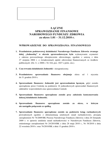 ŁĄCZNE SPRAWOZDANIE FINANSOWE NARODOWEGO FUNDUSZU ZDROWIA za okres 1.01 – 31.12.2010 r. WPROWADZENIE DO SPRAWOZDANIA FINANSOWEGO 1. Przedmiotem podstawowej działalności Narodowego Funduszu Zdrowia zwanego dalej „Jednostką” w okresie sprawozdawczym było wykonywanie czynności z zakresu powszechnego ubezpieczenia zdrowotnego, zgodnie z ustawą z dnia 27 sierpnia 2004 r. o świadczeniach opieki zdrowotnej finansowanych ze środków publicznych (Dz. U. z 2008 r. Nr 164, poz. 1027 z późn. zm.). 2. Czas trwania działalności Jednostki - nieograniczony. 3. Przedmiotowe sprawozdanie do 31 grudnia 2010 r. finansowe obejmuje okres od 1 stycznia 4. Sprawozdanie finansowe Jednostki jest sprawozdaniem łącznym, gdyż zostało sporządzone przez Centralę na podstawie 16 jednostkowych sprawozdań finansowych oddziałów wojewódzkich oraz sprawozdania Centrali. 5. Sprawozdanie finansowe sporządzone zostało przy założeniu kontynuowania dalszej działalności Jednostki. 6. Sprawozdanie finansowe sporządzone nie nastąpiło połączenie ze spółką. zostało za okres, w którym 7. Sprawozdanie finansowe sporządzone zostało na podstawie ksiąg rachunkowych prowadzonych zgodnie z dokumentacją ustalonych zasad rachunkowości, przyjętą zarządzeniem Nr 76/2009/BK Prezesa Narodowego Funduszu Zdrowia z dnia 26 listopada 2009 r. w sprawie ustalenia zasad rachunkowości w Narodowym Funduszu Zdrowia, zmienionego zarządzeniami Nr 24/2010/BK z dnia 28 maja 2010 r., Nr 58/2010 z dnia 22 września 2010 r. oraz 76/2010/BK z dnia 13 grudnia 2010 r. Wymieniona dokumentacja obejmowała w szczególności „Zasady rachunkowości NFZ”, które regulowały następujące obszary tematyczne: 1) przyjęte przez Jednostkę podstawowe zasady prowadzenia ksiąg rachunkowych, 2) wykaz kont księgi głównej wraz z wykazem obligatoryjnych kont pomocniczych, 3) zasady ujmowania zdarzeń w księgach rachunkowych, 4) wykaz rocznych stawek amortyzacyjnych, 5) opis systemu informatycznego przetwarzania danych, 6) terminy przyjęte do szacowania przychodów należnych za miesiąc kalendarzowy ze składek na ubezpieczenie zdrowotne oraz terminy sporządzania zestawień obrotów i sald kont księgi głównej, 7) system ochrony danych i ich zbiorów, 8) zasady rachunkowości dotyczące programu lub projektu finansowanego ze środków pieniężnych pochodzących z budżetu Unii Europejskiej (UE) lub Europejskiego Porozumienia o Wolnym Handlu (EFTA), zakładającego całkowite pokrycie wydatków kwalifikowanych, 9) zasady rachunkowości dotyczące programu lub projektu finansowanego ze środków pieniężnych pochodzących z budżetu Unii Europejskiej (UE) lub Europejskiego Porozumienia o Wolnym Handlu (EFTA), zakładającego częściowe pokrycie wydatków kwalifikowanych. 8. Wykazane w bilansie na dzień 31 grudnia 2010 r. aktywa i pasywa wyceniono na dzień bilansowy: 1) środki trwałe oraz wartości niematerialne i prawne – według ceny nabycia lub kosztów wytworzenia, pomniejszonych o odpisy umorzeniowe, a także odpisy z tytułu trwałej utraty wartości, 2) środki trwałe w budowie – w wysokości ogółu kosztów pozostających w bezpośrednim związku z ich nabyciem lub wytworzeniem, pomniejszonych o odpisy z tytułu trwałej utraty wartości, 3) inwestycje długoterminowe w nieruchomości oraz wartości niematerialne i prawne – według ceny nabycia pomniejszonej o odpisy z tytułu trwałej utraty wartości, 4) rzeczowe składniki aktywów obrotowych – według cen nabycia lub kosztów wytworzenia nie wyższych od cen ich sprzedaży netto, 5) należności i udzielone pożyczki – w kwocie wymaganej zapłaty, z zachowaniem ostrożności, 6) zobowiązania – w kwocie wymaganej zapłaty, 7) rezerwy – w uzasadnionej, wiarygodnie oszacowanej wartości, 8) fundusze własne oraz pozostałe aktywa i pasywa – w wartości nominalnej. Amortyzacja (umorzenie) środków trwałych dokonywana była na zasadzie planowego, systematycznego rozłożenia ich wartości początkowej na ustalony okres amortyzacji. 2/45 Rozpoczęcie amortyzacji (umorzeń) następowało od miesiąca następującego po przyjęciu środka trwałego do użytkowania, a zakończenie nie później niż z chwilą zrównania wartości umorzeń (amortyzacji) z wartością początkową danego środka trwałego lub przeznaczenia go do sprzedaży, likwidacji bądź stwierdzenia niedoboru, z ewentualnym uwzględnieniem przewidzianej przy likwidacji ceny sprzedaży netto pozostałości środka trwałego. Środki trwałe Jednostka amortyzowała (umarzała) metodą liniową, zgodnie z „Wykazem rocznych stawek amortyzacyjnych”, z tym że: przedmioty o cechach środka trwałego o wartości początkowej większej od 500 zł i mniejszej bądź równej 3.500 zł, a także telefony komórkowe bez względu na wartość początkową, jeśli nie zostały zaliczone do środków trwałych, zaliczano do wyposażenia rzeczowego; rozchody wyposażenia rzeczowego traktowano jako materiały i w momencie wydania do użytkowania zaliczano bezpośrednio w ciężar zużycia materiałów pozostałych oraz ujmowano w ewidencji pozabilansowej, rzeczowe aktywa trwałe i zrównane z nimi o wartości początkowej wyższej od 3.500 zł, a także zespoły komputerowe bez względu na ich wartość początkową, ujmowano w ewidencji bilansowej na koncie środków trwałych, a począwszy od miesiąca następującego po miesiącu wydania do użytkowania, dokonywano miesięcznych odpisów umorzeniowych (amortyzacyjnych). 9. Jednostka stosowała poniższe uproszczenia ewidencyjne, ponieważ ich stosowanie nie wywierało istotnego wpływu na rzetelne i jasne przedstawienie sytuacji majątkowej i finansowej oraz wyniku finansowego Jednostki: 1) wartość materiałów nie objętych ewidencją magazynową była odpisywana w koszty zużycia materiałów na dzień ich zakupu; na koniec roku obrotowego ustalano stan tych materiałów, dokonywano ich wyceny i korekty kosztów o wartoś