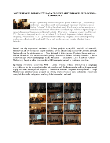 KONFERENCJA PODSUMOWUJĄCA PROJEKT AKTYWIZACJA SPOŁECZNO – ZAWODOWA Projekt systemowy realizowany przez gminę Połaniec pn. „Aktywizacja społeczno – zawodowa osób korzystających z pomocy z terenu Miasta i Gminy Połaniec” dobiegł fazy końcowej. Konferencja podsumowująca to działanie realizowane ze środków Europejskiego Funduszu Społecznego w ramach Programu Operacyjnego Kapitał Ludzki - Człowiek – najlepsza inwestycja, Priorytet VII - Promocja integracji społecznej, działanie 7.1 - Rozwój i upowszechnianie aktywnej integracji, Poddziałanie 7.1.1 - Upowszechnianie aktywnej integracji przez ośrodki pomocy społecznej, odbyła się 20 grudnia 2012 r. w sali konferencyjnej Urzędu Miasta i Gminy Połaniec. Zostali na nią zaproszeni zarówno ci, którzy projekt wymyślili, napisali, uskutecznili, realizowali jak i beneficjenci tegoż działania. Swoją obecnością zaszczycił Członek Zarządu Województwa Świętokrzyskiego – Piotr Żołądek i Wicestarosta Powiatu Staszowskiego – Michał Skotnicki. Nie zabrakło władz gminy: Burmistrza Miasta i Gminy Połaniec - Jacka Tarnowskiego, Przewodniczącego Rady Miejskiej – Stanisława Lolo, Skarbnik Gminy – Małgorzaty Żugaj, a także pracowników OPS zaangażowanych w realizację projektu. Spotkanie otworzyła kierownik OPS – Anna Wolska witając przybyłych i dziękując wszystkim za to, że ten projekt udało się zrealizować. Podsumowania realizacji tegorocznej edycji dokonała koordynator projektu – Dominika Reichert i asystent koordynatora – Łucja Maćkowska przedstawiając projekt od strony merytorycznej: cele, założenia, stosowane narzędzia i metody, osiągnięte rezultaty,doświadczenia i wnioski. Projekty tego typu w życiu lokalnego środowiska odgrywają ważną rolę i mają swój konkretny wymiar. Zaproszeni goście zabierając głos niejednokrotnie podkreślali, że realizacja projektu systemowego pomaga w przezwyciężaniu trudności, zapobieganiu ich powstawaniu, w zaspokajaniu elementarnych potrzeb życiowych, prowadzi do usamodzielnienia oraz dąży do ich uaktywniania we wszystkich możliwych obszarach życia społecznego. A wiedza zdobyta przez uczestników podczas kursów, warsztatów, podjęcie nauki i innych form aktywizacji ma przyczynić się do sukcesów na otwartym rynku pracy. W podziękowaniu za pomoc i wsparcie przy realizacji zadania Burmistrz - Jacek Tarnowski wręczył Wicestaroście - Michałowi Skotnickiemu i Członkowi Zarządu Województwa Świętokrzyskiego - Piotrowi Żołądkowi, pamiątkowe obrazy. Miłym punktem konferencji było wręczanie dyplomów i złożenie podziękowań i gratulacji dla uczestników projektu. Certyfikaty beneficjentom wręczali - kierownik OPS - Anna Wolska, Burmistrz- Jacek Tarnowski, Przewodniczący Rady Miejskiej - Stanisław Lolo oraz Członek Zarządu Woj. Świętokrzyskiego - Piotr Żołądek i Wicestarosta - Michał Skotnicki. Ostatnim punktem konferencji był wspólny poczęstunek.
