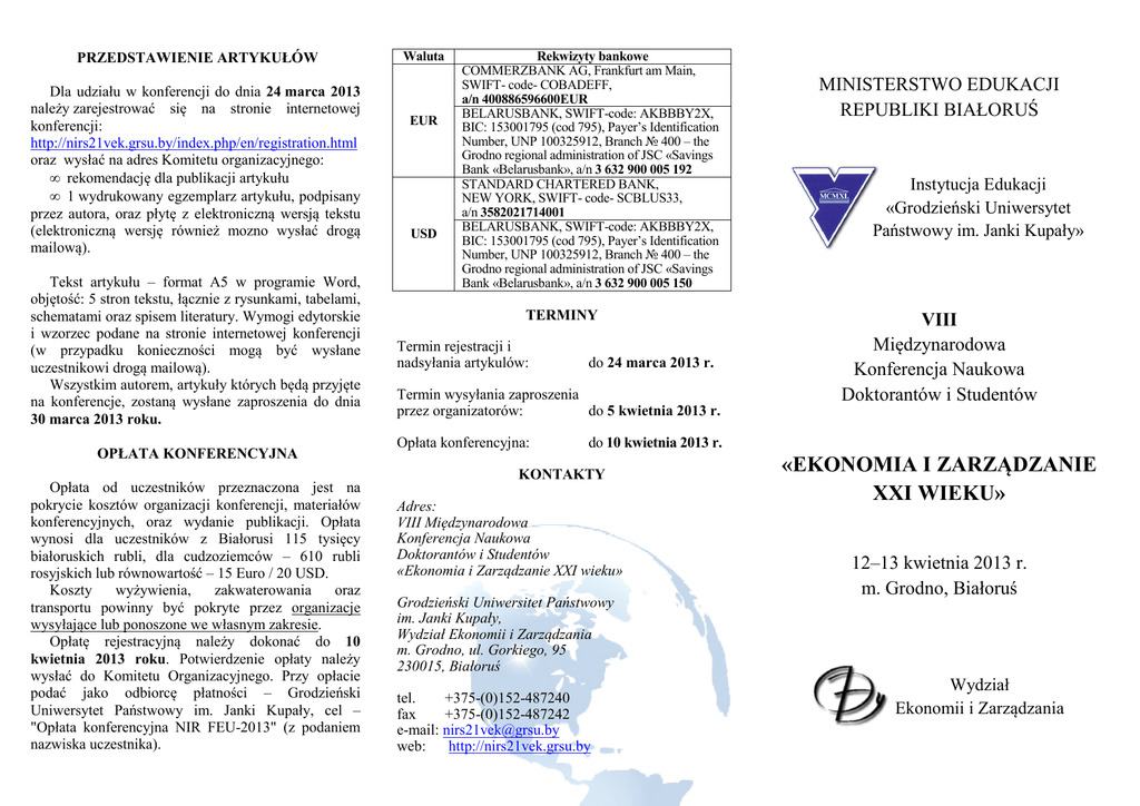 PRZEDSTAWIENIE ARTYKUŁÓW Dla udziału w konferencji do dnia 24 marca 2013 należy zarejestrować się na stronie internetowej konferencji: http://nirs21vek.grsu.by/index.php/en/registration.html oraz wysłać na adres Komitetu organizacyjnego: • rekomendację dla publikacji artykułu • 1 wydrukowany egzemplarz artykułu, podpisany przez autora, oraz płytę z elektroniczną wersją tekstu (elektroniczną wersję również mozno wysłać drogą mailową). Tekst artykułu – format A5 w programie Word, objętość: 5 stron tekstu, łącznie z rysunkami, tabelami, schematami oraz spisem literatury. Wymogi edytorskie i wzorzec podane na stronie internetowej konferencji (w przypadku konieczności mogą być wysłane uczestnikowi drogą mailową). Wszystkim autorem, artykuły których będą przyjęte na konferencje, zostaną wysłane zaproszenia do dnia 30 marca 2013 roku. OPŁATA KONFERENCYJNA Opłata od uczestników przeznaczona jest na pokrycie kosztów organizacji konferencji, materiałów konferencyjnych, oraz wydanie publikacji. Opłata wynosi dla uczestników z Białorusi 115 tysięcy białoruskich rubli, dla cudzoziemców – 610 rubli rosyjskich lub równowartość – 15 Euro / 20 USD. Koszty wyżywienia, zakwaterowania oraz transportu powinny być pokryte przez organizacje wysyłające lub ponoszone we własnym zakresie. Opłatę rejestracyjną należy dokonać do 10 kwietnia 2013 roku. Potwierdzenie opłaty należy wysłać do Komitetu Organizacyjnego. Przy opłacie podać jako odbiorcę płatności – Grodzieński Uniwersytet Państwowy im. Janki Kupały, cel – "Opłata konferencyjna NIR FEU-2013" (z podaniem nazwiska uczestnika). Waluta EUR USD Rekwizyty bankowe COMMERZBANK AG, Frankfurt am Main, SWIFT- code- COBADEFF, a/n 400886596600EUR BELARUSBANK, SWIFT-code: AKBBBY2X, BIC: 153001795 (cod 795), Payer’s Identification Number, UNP 100325912, Branch № 400 – the Grodno regional administration of JSC «Savings Bank «Belarusbank», a/n 3 632 900 005 192 STANDARD CHARTERED BANK, NEW YORK, SWIFT- code- SCBLUS33, a/n 3582021714001 BELARUSBANK, SWIFT-code: AKBBBY2X, BIC: 153001795 (cod 795), Payer’s Identification Number, UNP 100325912, Branch № 400 – the Grodno regional administration of JSC «Savings Bank «Belarusbank», a/n 3 632 900 005 150 TERMINY Termin rejestracji i nadsyłania artykulów: do 24 marca 2013 r. Termin wysyłania zaproszenia przez organizatorów: do 5 kwietnia 2013 r. Opłata konferencyjna: MINISTERSTWO EDUKACJI REPUBLIKI BIAŁORUŚ Instytucja Edukacji «Grodzieński Uniwersytet Państwowy im. Janki Kupały» VIII Międzynarodowa Konferencja Naukowa Doktorantów i Studentów do 10 kwietnia 2013 r. KONTAKTY Adres: VIII Międzynarodowa Konferencja Naukowa Doktorantów i Studentów «Ekonomia i Zarządzanie XXI wieku» Grodzieński Uniwersitet Państwowy im. Janki Kupały, Wydział Ekonomii i Zarządzania m. Grodno, ul. Gorkiego, 95 230015, Białoruś tel. +375-(0)152-487240 fax +375-(0)152-487242 e-mail: [email protected] web: http://nirs21vek.grsu.by «EKONOMIA I ZARZĄDZANIE XXI WIEKU» 12–13 kwietnia 2013 r. m. Grodno, Białoruś Wydział Ekonomii i Zarządzania INFORMACYJNE ZAWIADOMIENIE Komitet organizacyjny VIII Międzynarodowej Konferencji Naukowej Doktorantów i Studentów NBPS WEZ–2013 «Ekonomia i zarządzanie XXI wieku» zaprasza Państwo wziąć udział w konferencji, która odbędzie się 12– 13 kwietnia 2013 roku w Grodzieńskim Uniwersytecie Państwowym imienia Janki Kupały na Wydziale Ekonomii i Zarządzania. TEMATYKA KONFERENCJI: 1. 2. 3. Pierwszy krok do nauki Zarządzanie gospodarką regionalną Informacyjne systemy i technologie w ekonomii 4. Zarządzanie 5. Ekonomika przedsiębiorstw i organizacja produkcji 6. Marketing 7. Gospodarka światowa i zarządzanie działalnością międzynarodową 8. Gospodarka narodowa i zarządzanie państwowe 9. Finanse i kredyt 10. Rachunkowość, analiza i audyt 11. Teoria ekonomii W programie konferencji przypuszczają się wystąpienia plenarne do 20 minut oraz wystapienia sekcyjne do 10 minut. Językami roboczymi konferencji będą białoruski, rosyjski, angielski oraz polski. Prace przedstawione w czasie konferencji zostaną opublikowane w formie kśiążkowej w materiałach pokonferencyjnych (specialne wydanie artykułów naukowych). RADA PROGRAMOWA Współprzewodniczące: prof. dr hab. Vladimir Gerasienko – Profesor Katedry Gospodarki Narodowej i Zarządzania Białoruskiego Państwowego Uniwersytetu Ekonomicznego, Mińsk, Białoruś; prof. dr hab. Vladimir Fateev – Dziekan Wydziału Ekonomii i Zarządzania Grodzieńskiego Uniwersytetu Państwowego im. Janki Kupały, Grodno, Białoruś. Członkowie Rady Programowej: prof. dr hab. Dmitry Karev – Profesor Katedry Teorii ekonomii Grodzieńskiego Uniwersytetu Państwowego im. Janki Kupały, Grodno, Białoruś; prof. dr hab. Wojciech Kosiedowski – Kierownik Katedry Europejskiej Integracji i Regionalnych Badań Uniwersytetu im. M. Kopernika w Toruniu, Toruń, Polska; prof. dr hab. Olga Prokopienko – Dziekan Wydziału Ekonomii i Zarządzania Sumskiego Uniwersytetu Państwowego, Sumy, Ukraina; prof. dr hab. Valentina Rabtsevicz – Profesor Katedry Managementu Grodzieńskiego Uniwersytetu Państwowego im. Janki Kupały, Grodno, Białoruś; prof. dr hab. Natalia Vlasowa – Prorektor ds. Współpracy Międzynarodowej Uralskiego Ekonomicznego Uniwersytetu Państwowego, Jekaterinburg, Rosja; dr hab. Sergiej Solodovnikov – Kierownik Katedry Ekonomii i Prawa Białoruskiego Państwowego Uniwersytetu Technicznego, Mińsk, Białoruś; dr Aleksander Bielousov – Kierownik Katedry Działalności Komercyjnej Grodzieńskiego Uniwersytetu Państwowego im. Janki Kupały, Grodno, Białoruś; dr Maryna Karpitskaya – Kierownik Katedry Gospodarki Światowej i Biznesu Międzynarodowego Grodzieńskiego Uniwersytetu Państwowego im. Janki Kupały, Grodno, Białoruś; dr Vladimir Karpov – Kierownik Katedry Ekonomiki i Zarządzania Przedsię
